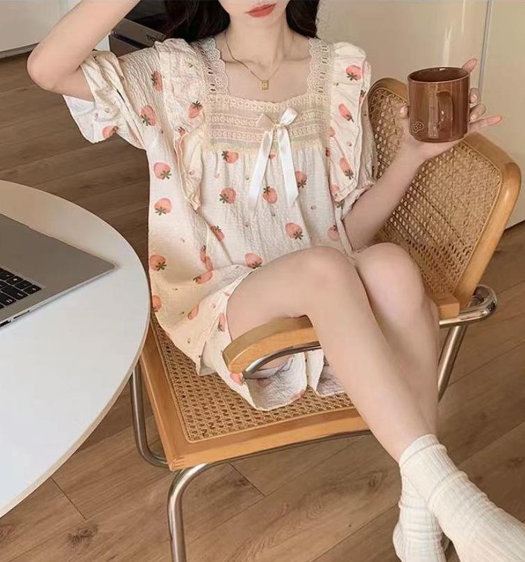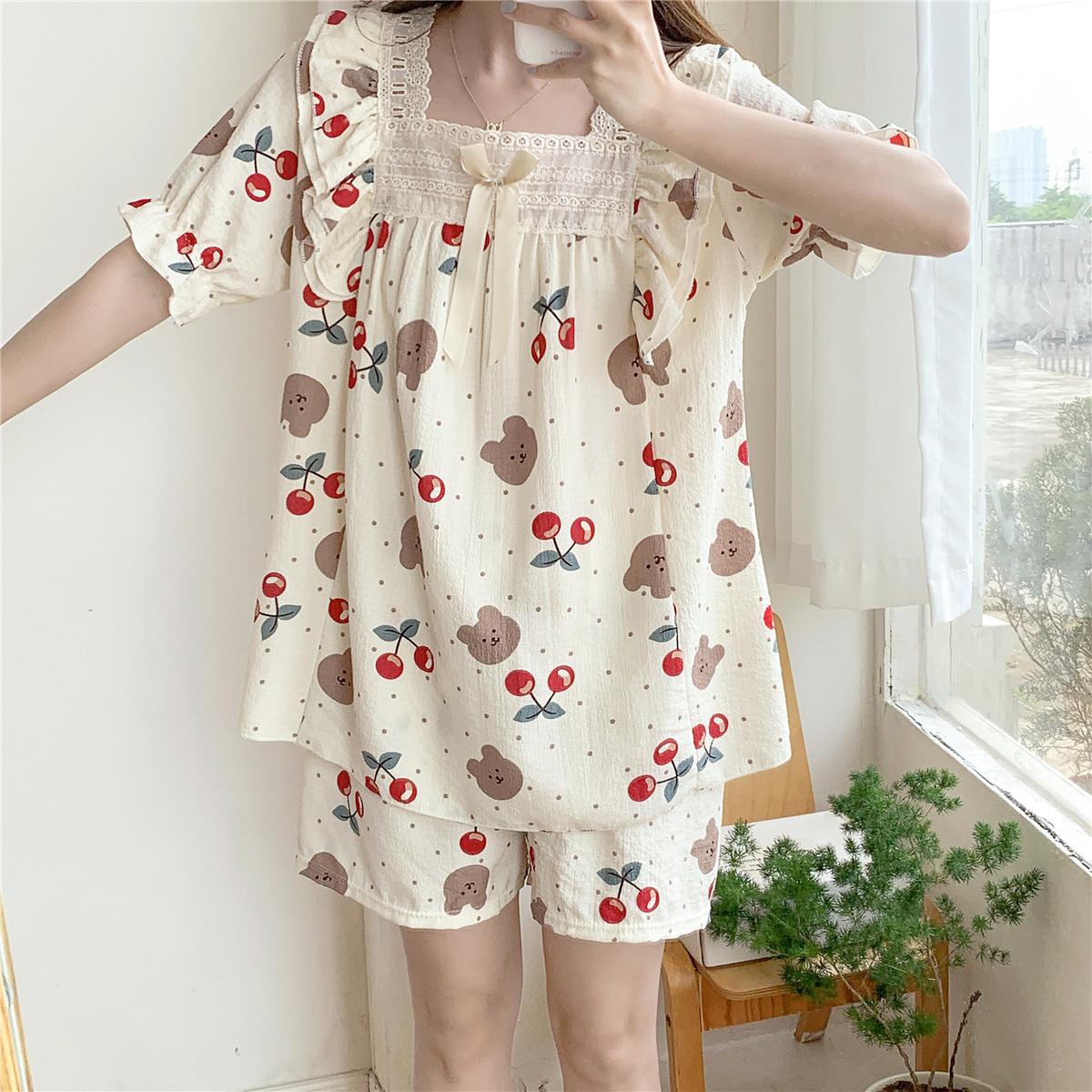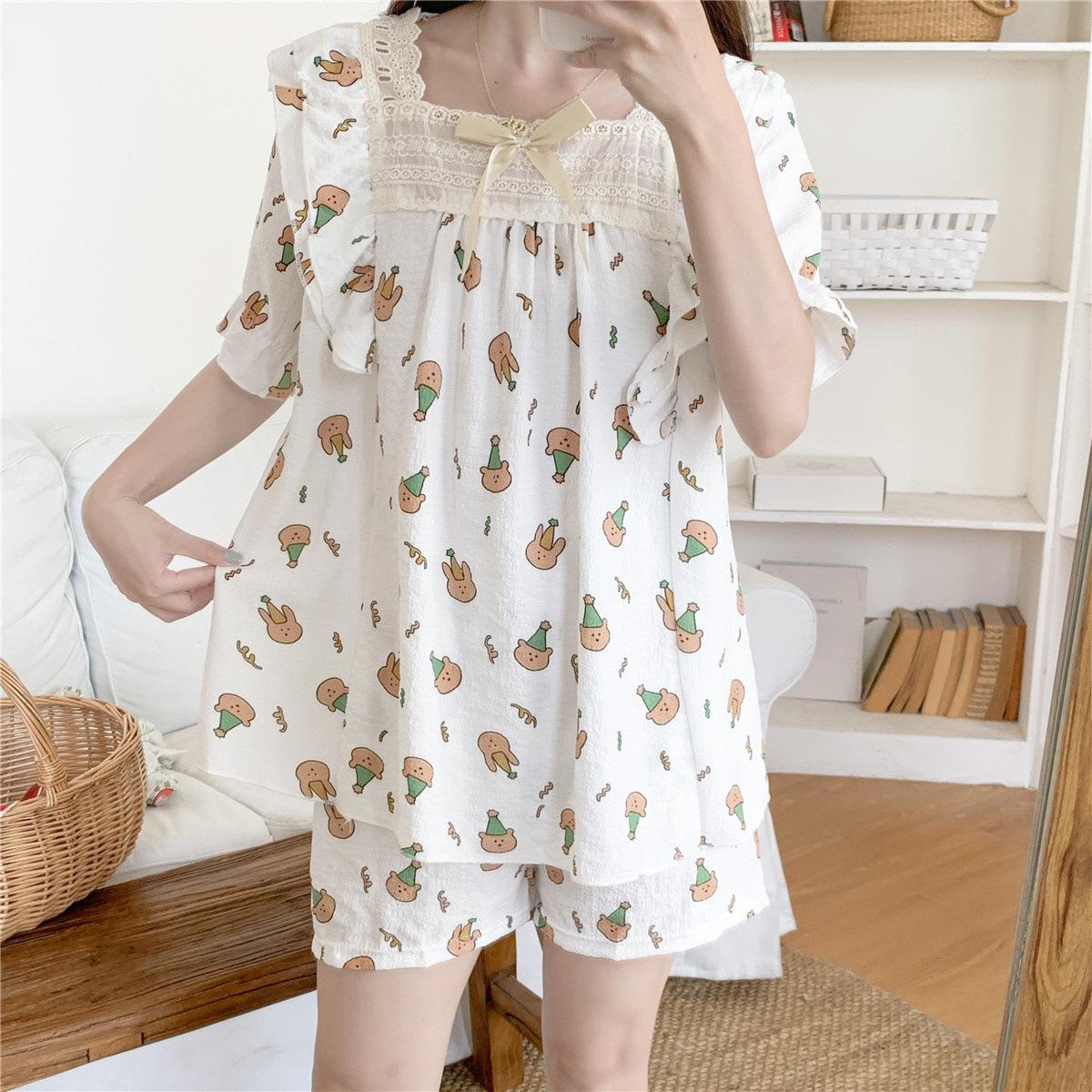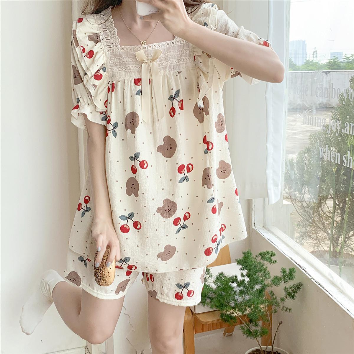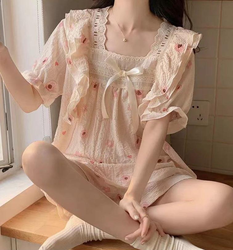 Pijama de algodón con burbujas estilo princesa Ins para mujer, de manga corta, cuello cuadrado con borde de encaje, bonito traje holgado de verano para niña