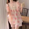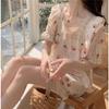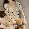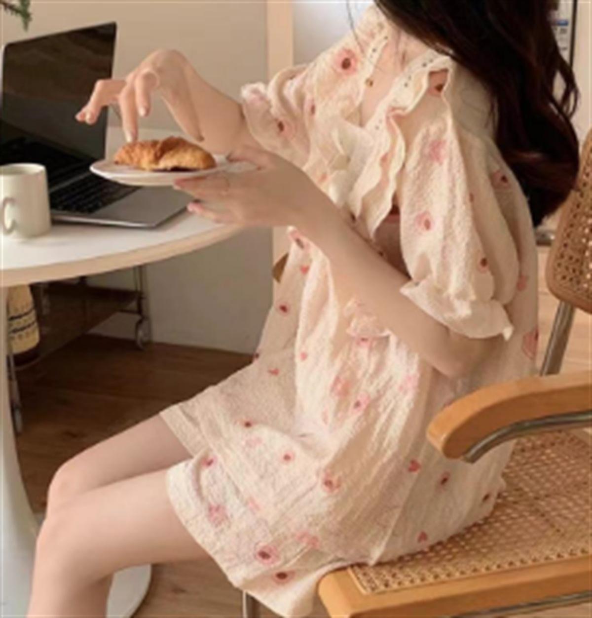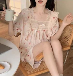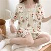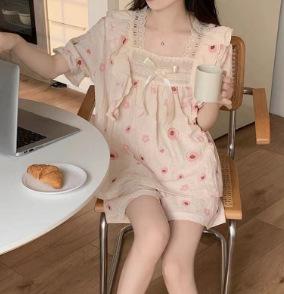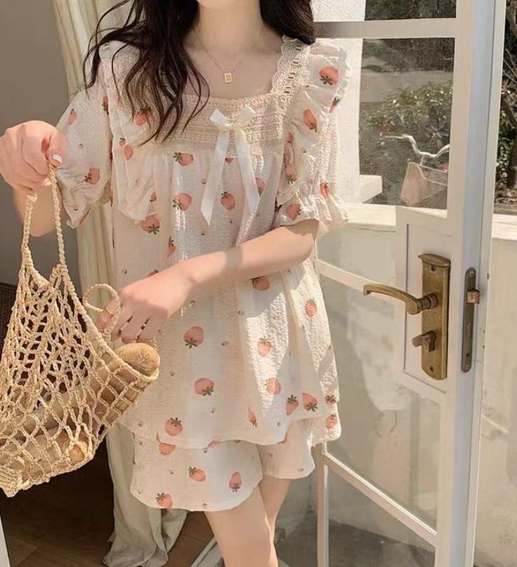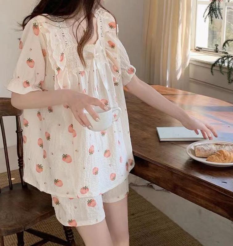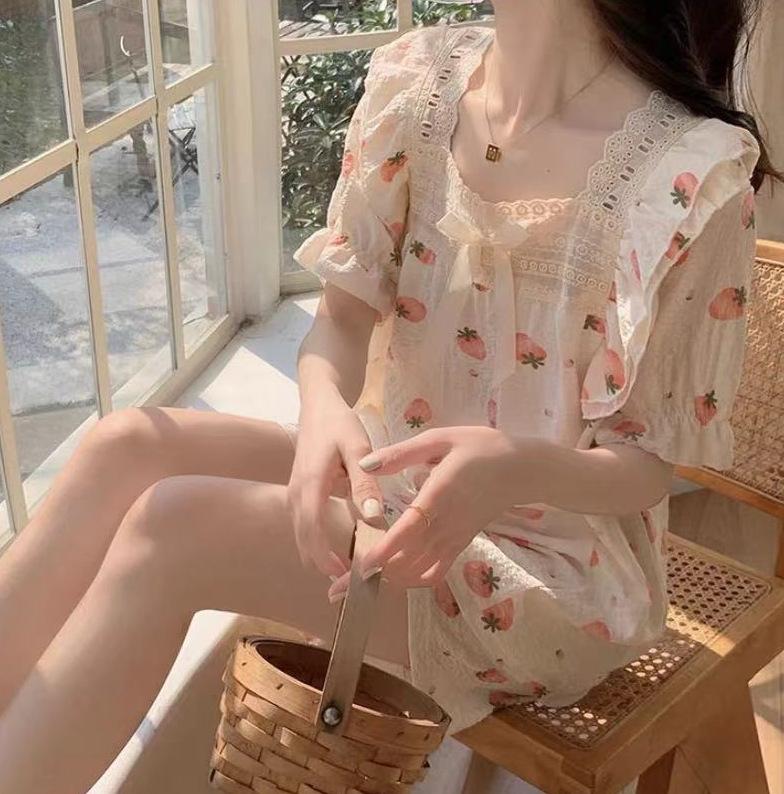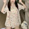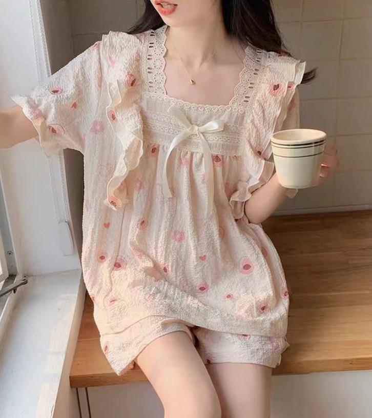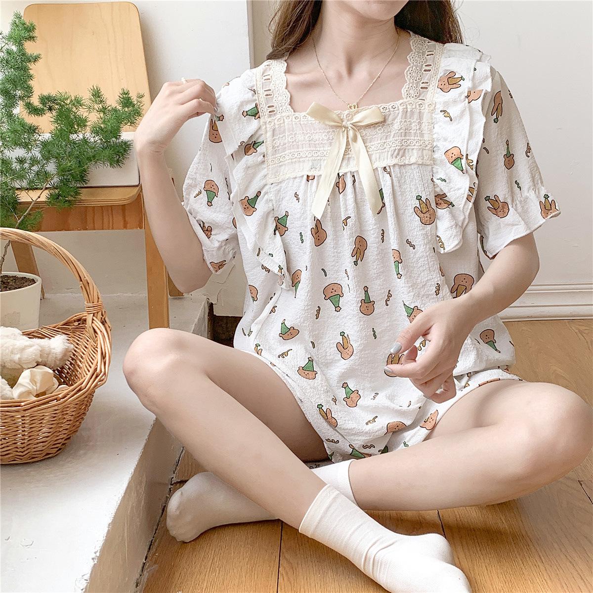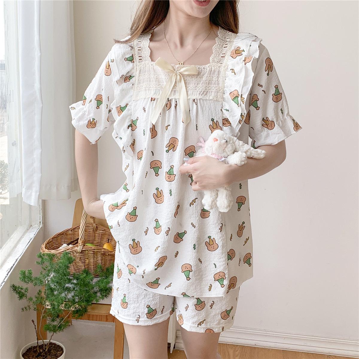 Pijama de algodón con burbujas estilo princesa Ins para mujer, de manga corta, cuello cuadrado con borde de encaje, bonito traje holgado de verano para niña
