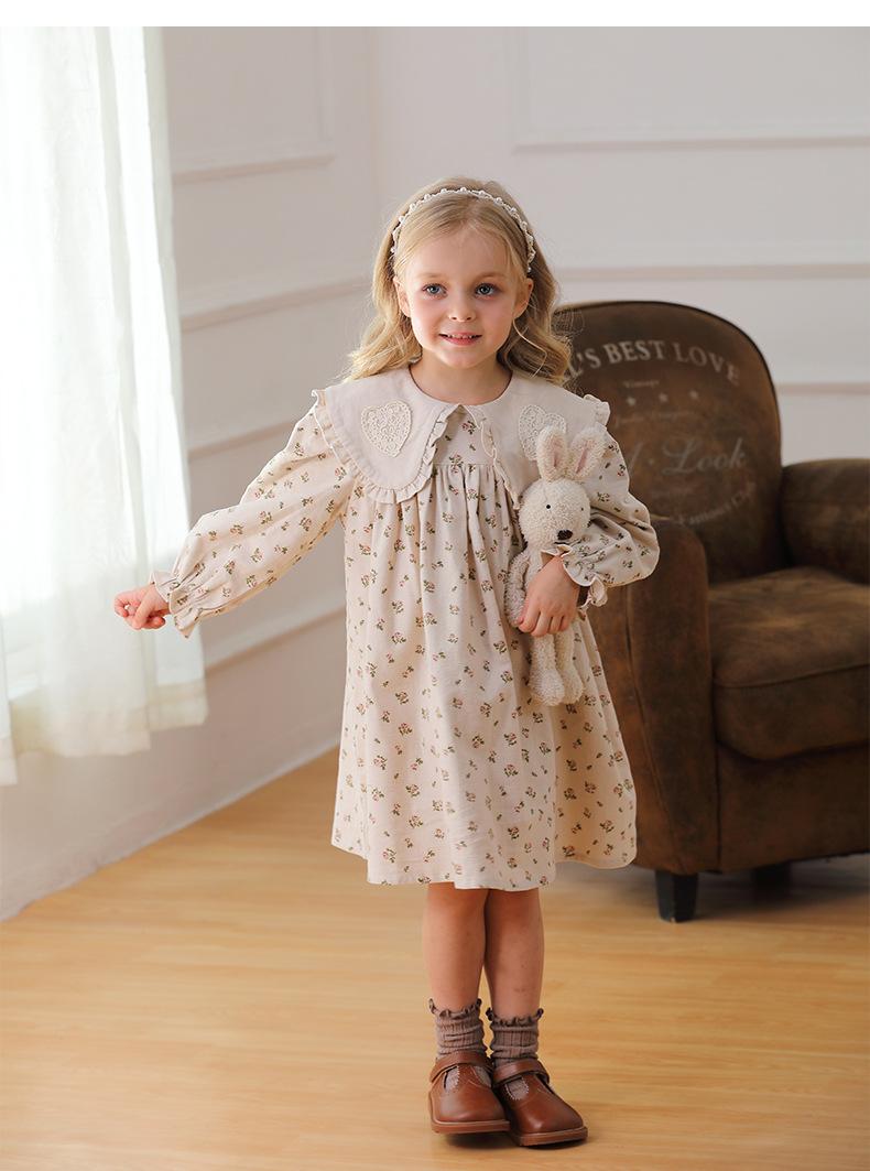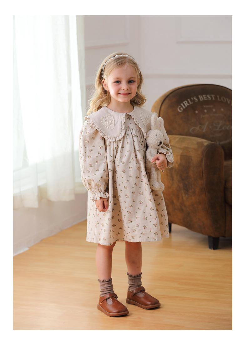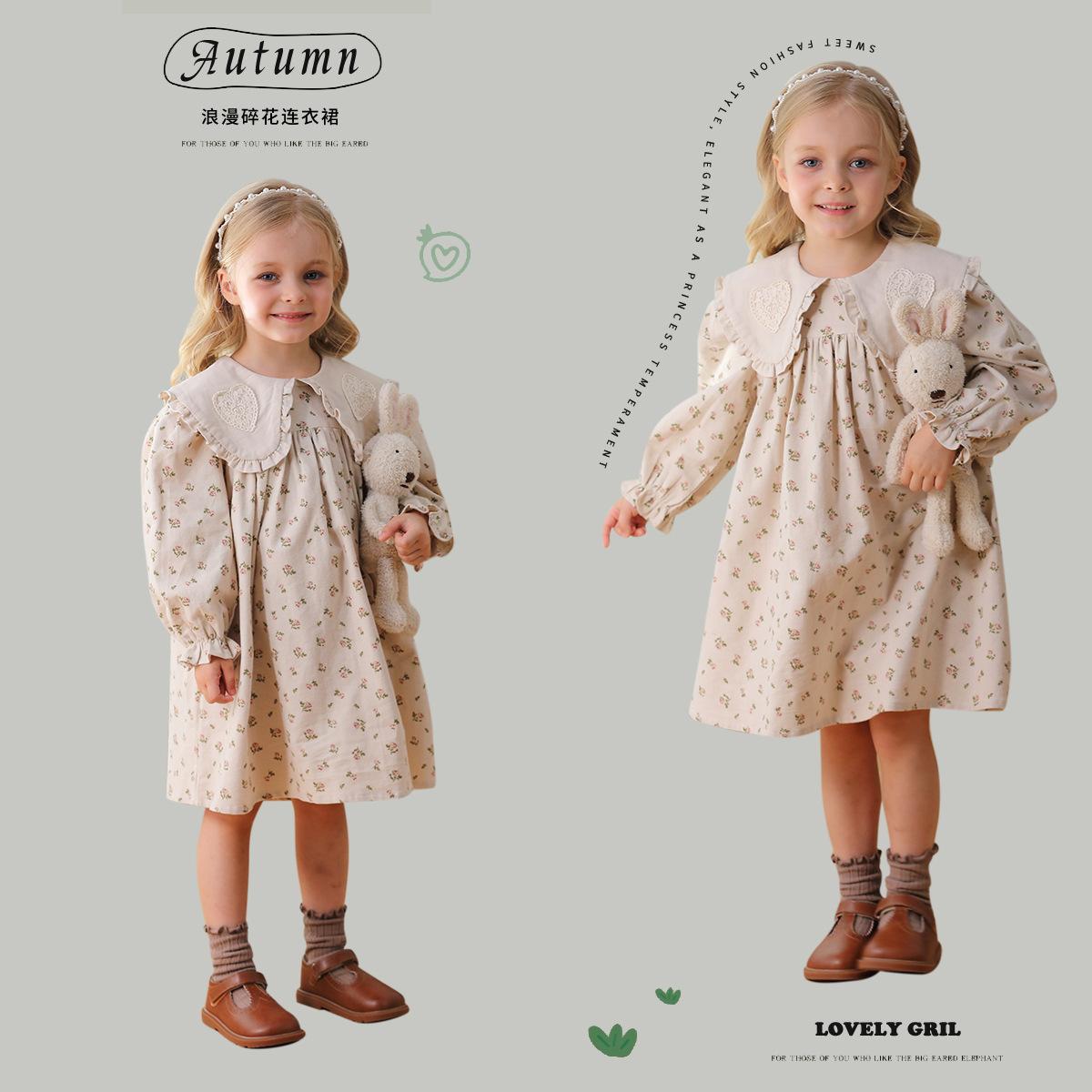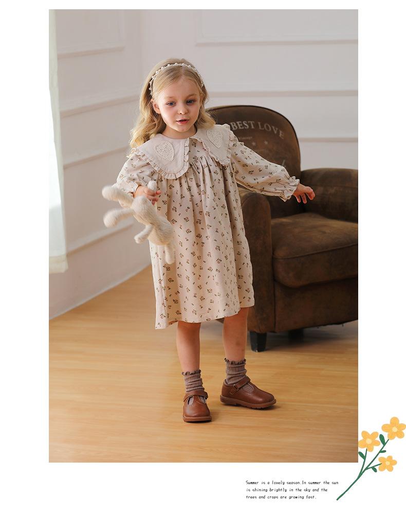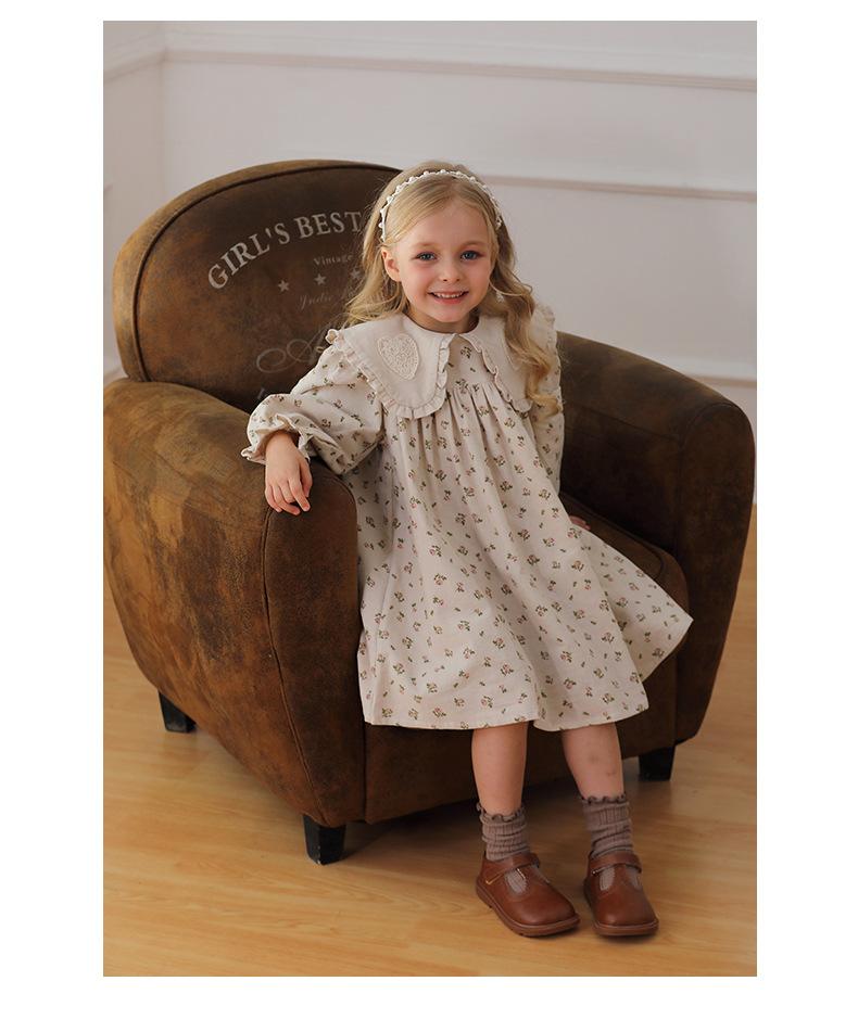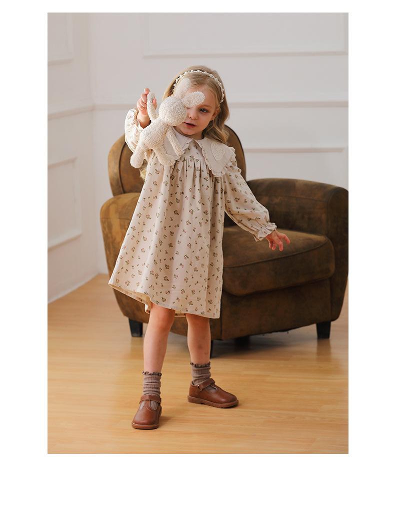 Vestido de encaje con estampado de solapa estilo coreano para niñas, otoño 2024, nuevo vestido de princesa dulce de manga larga para niñas, algodón puro