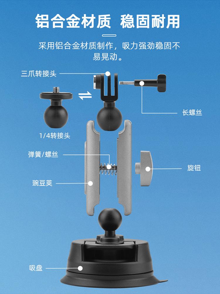 Lista de embalaje: Soporte de ventosa × 1 Adaptador de tres garras × 1 Adaptador de 1/4 x 1 Tornillo largo x 1 Cuerda de seguridad x 1