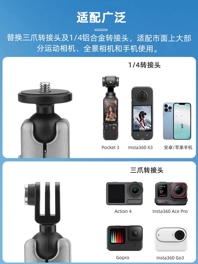 5. Viene con dos adaptadores: un adaptador de tres garras y un adaptador de 1/4; compatible con la mayoría de las cámaras deportivas del mercado, lo que le brinda más posibilidades de creación;