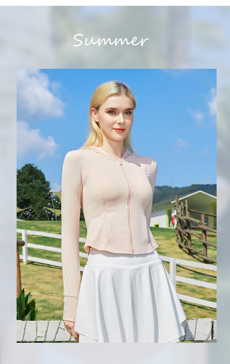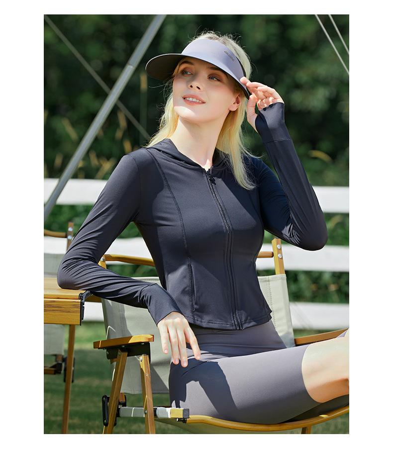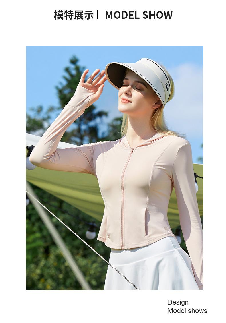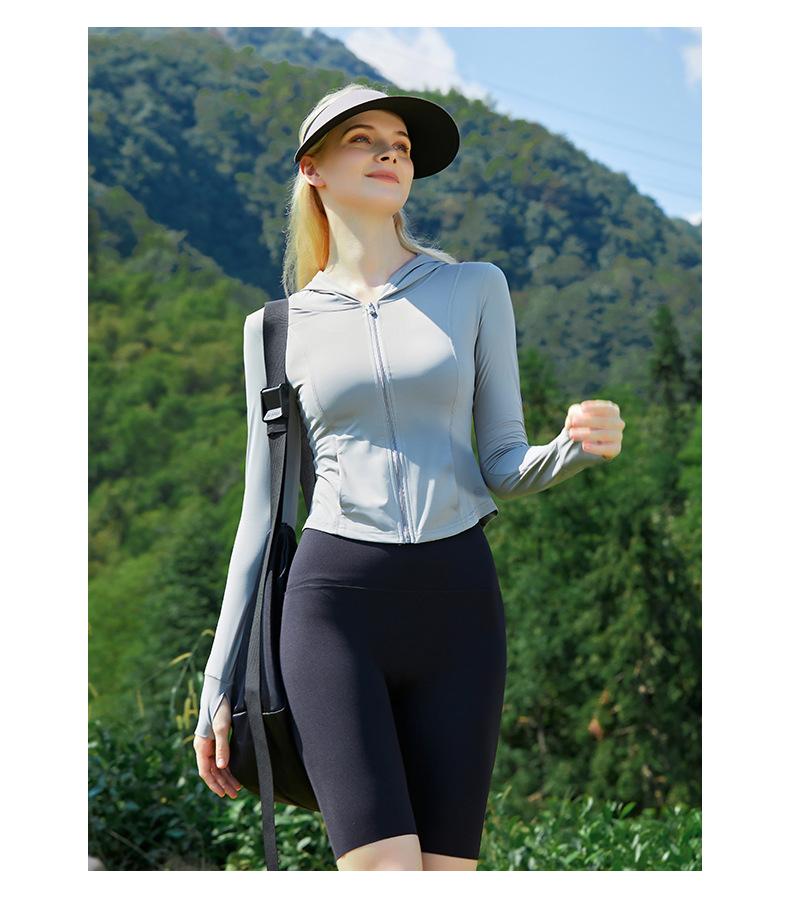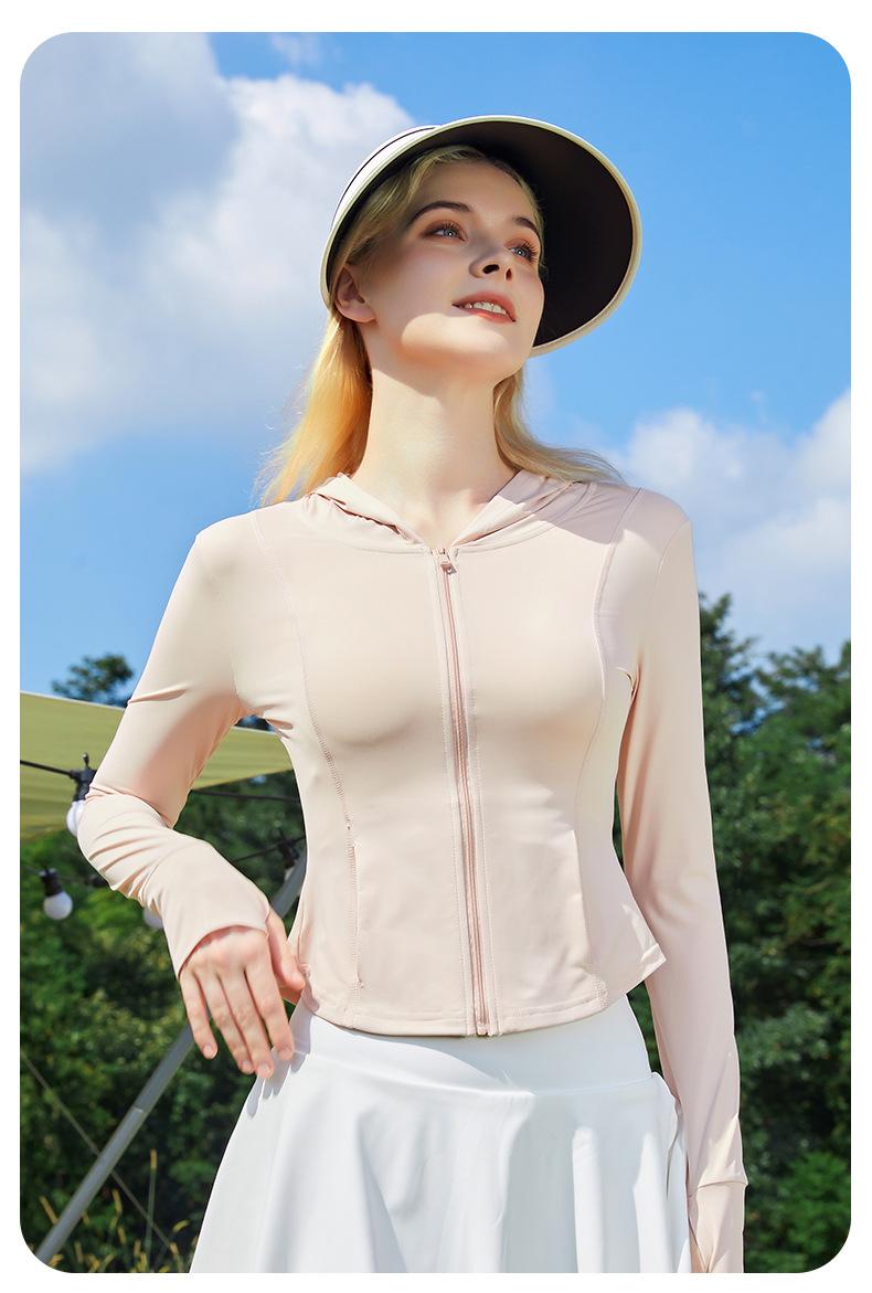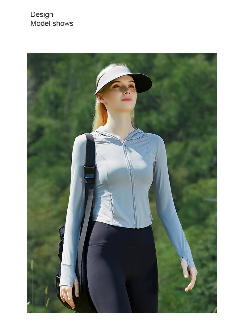 Venta al por mayor de ropa de protección solar con hilo crudo de nailon, ropa de protección solar con capucha para mujer, top adelgazante, camisa de protección solar, abrigo, ropa de piel para mujer.