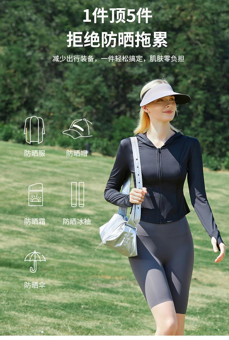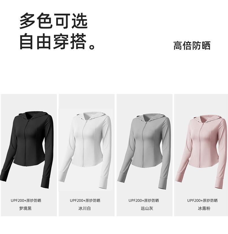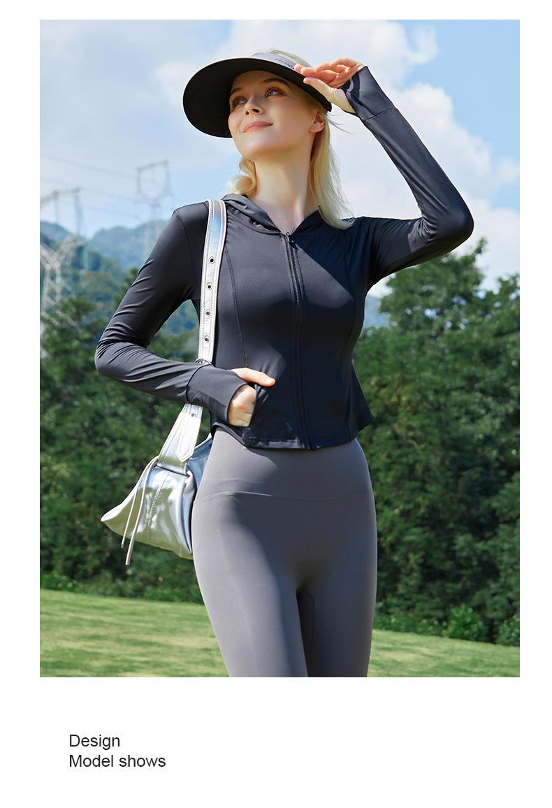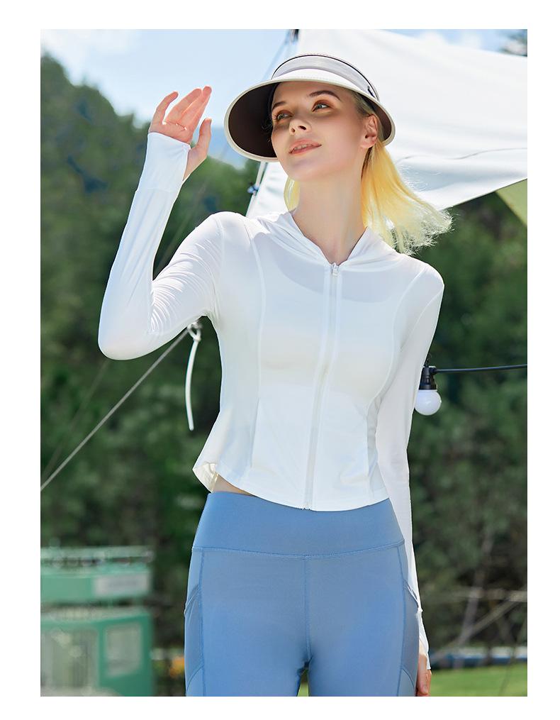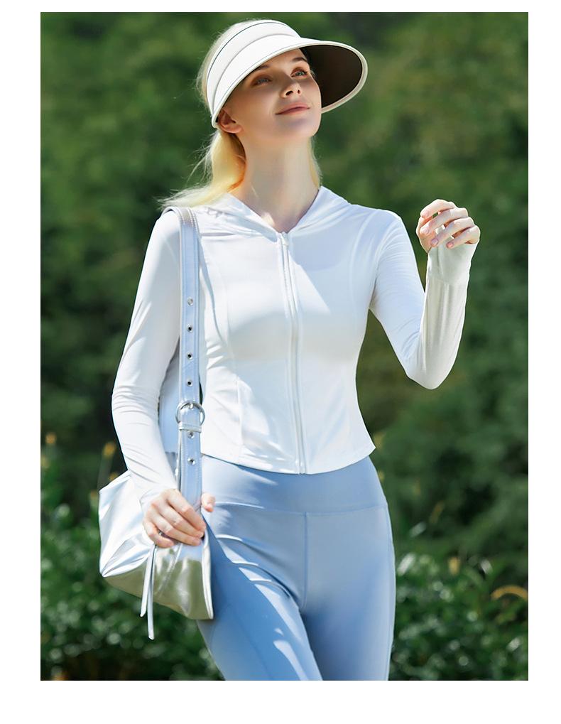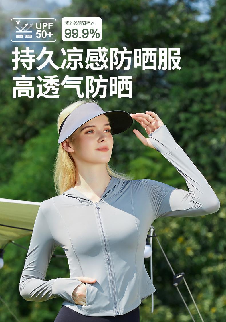 Venta al por mayor de ropa de protección solar con hilo crudo de nailon, ropa de protección solar con capucha para mujer, top adelgazante, camisa de protección solar, abrigo, ropa de piel para mujer.
