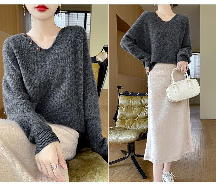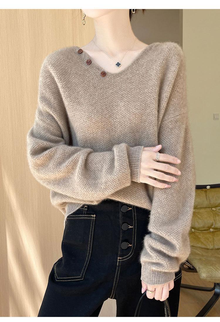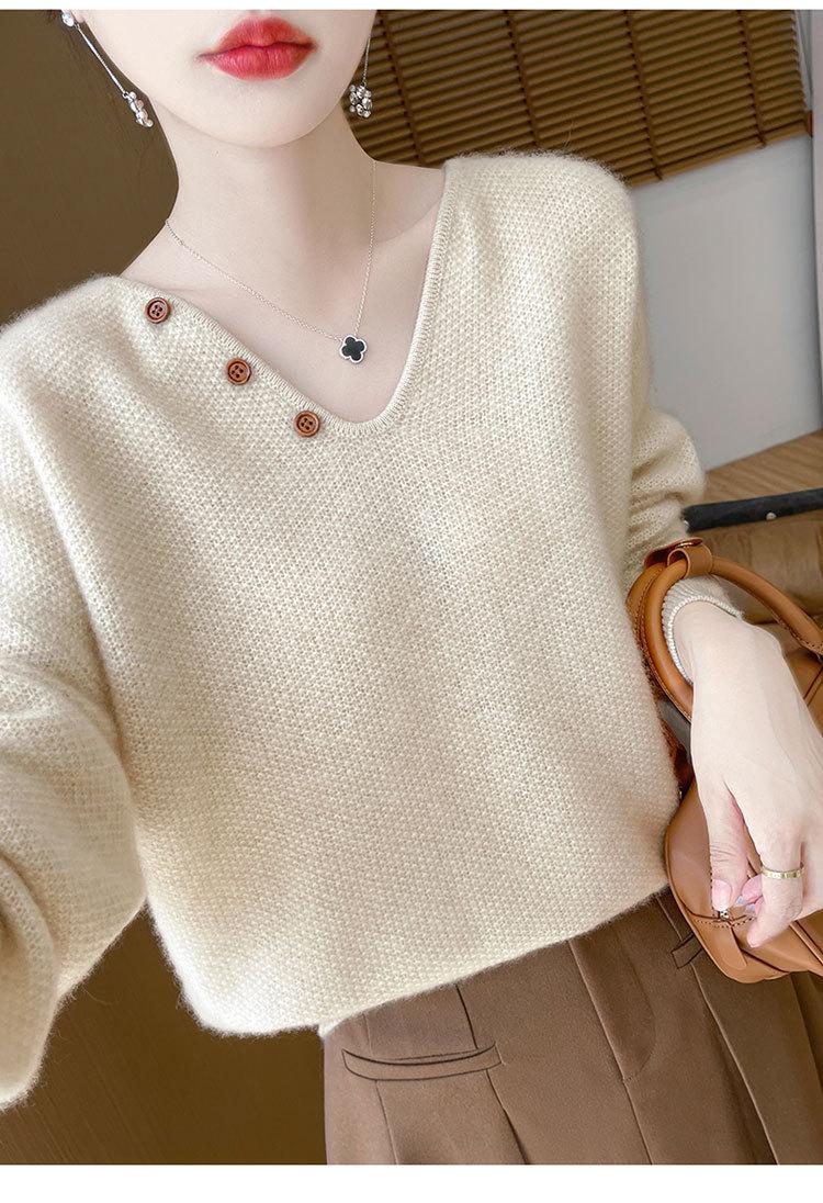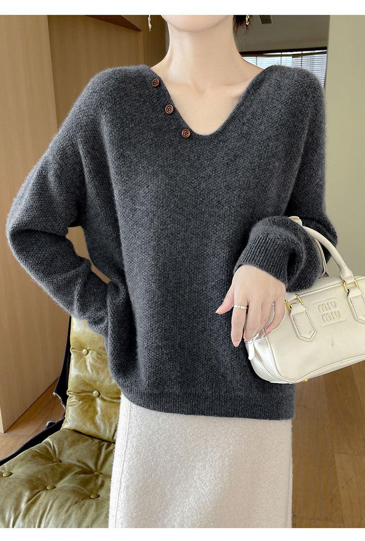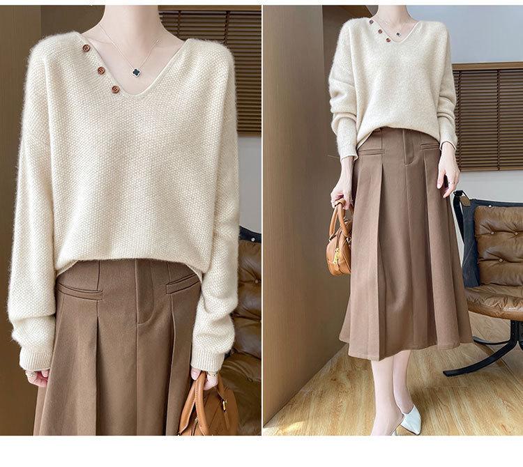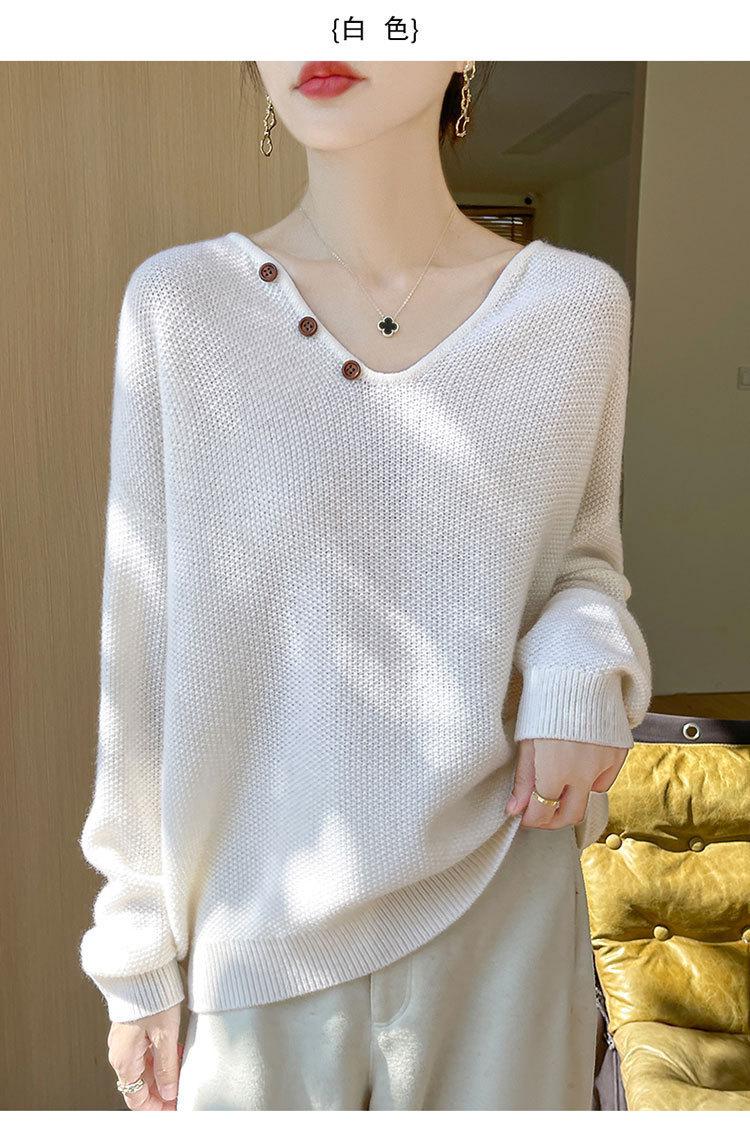 Suéter de Lana para Mujer Otoño e Invierno 2025, Cuello en V Corazón, Color Sólido, Versátil, Suave y Holgado, Suéter Base de Punto Cachemira