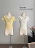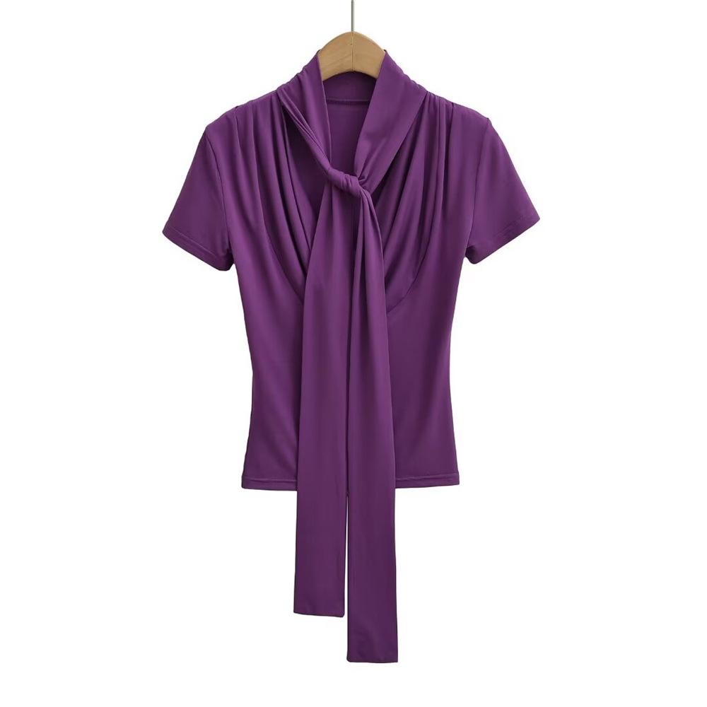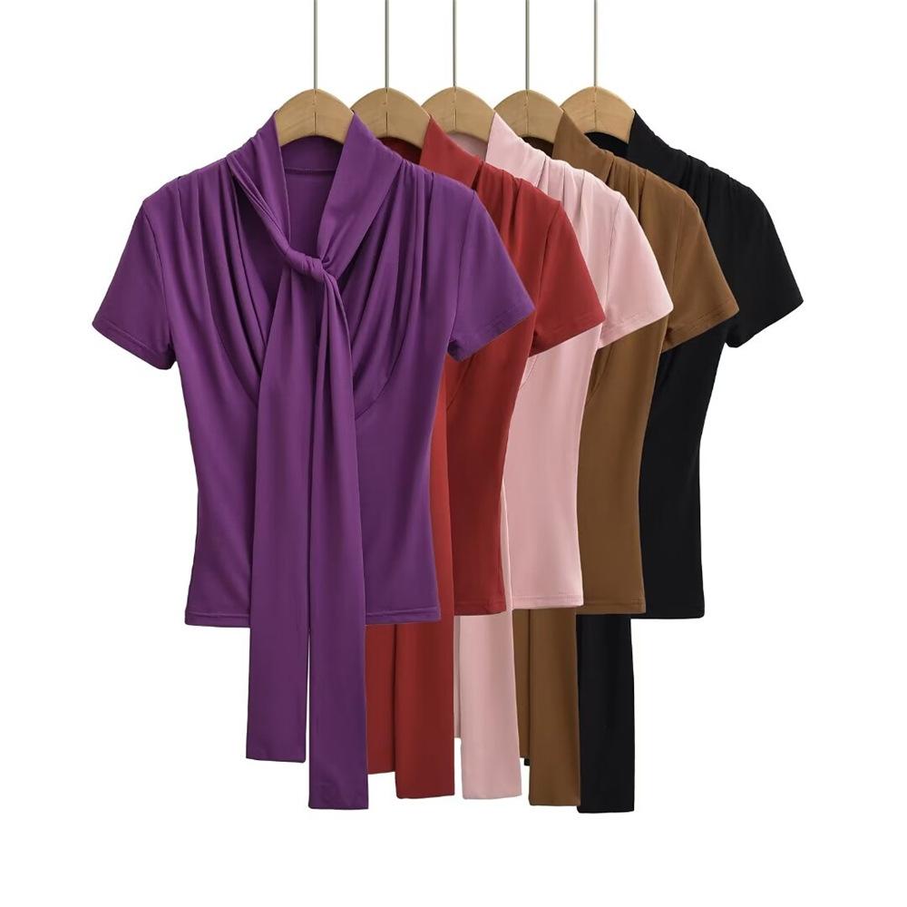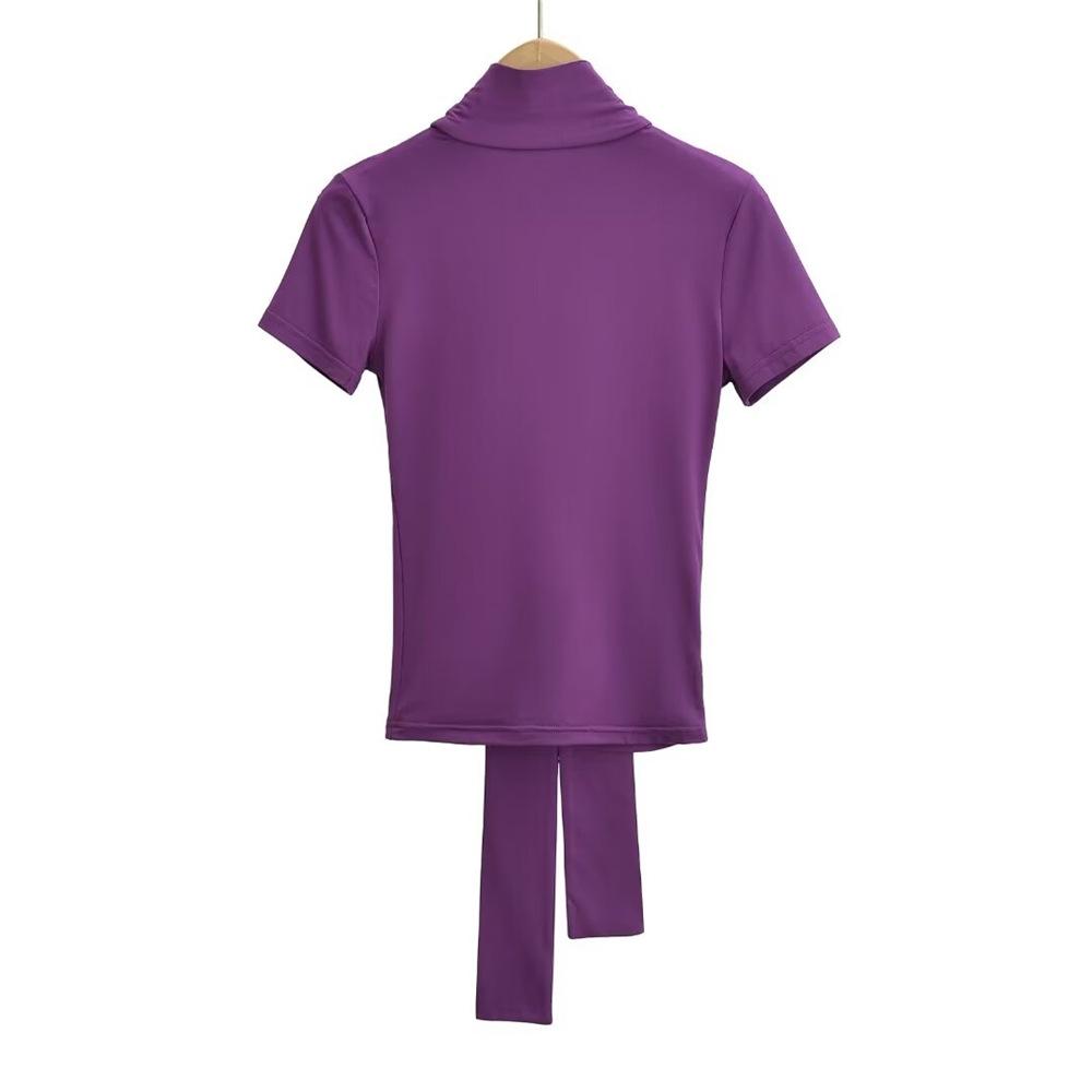 YPFF - Camiseta de manga corta con cuello alto para mujer, estilo veraniego, nueva moda, ajustada, con cordones, color liso, para chica atractiva