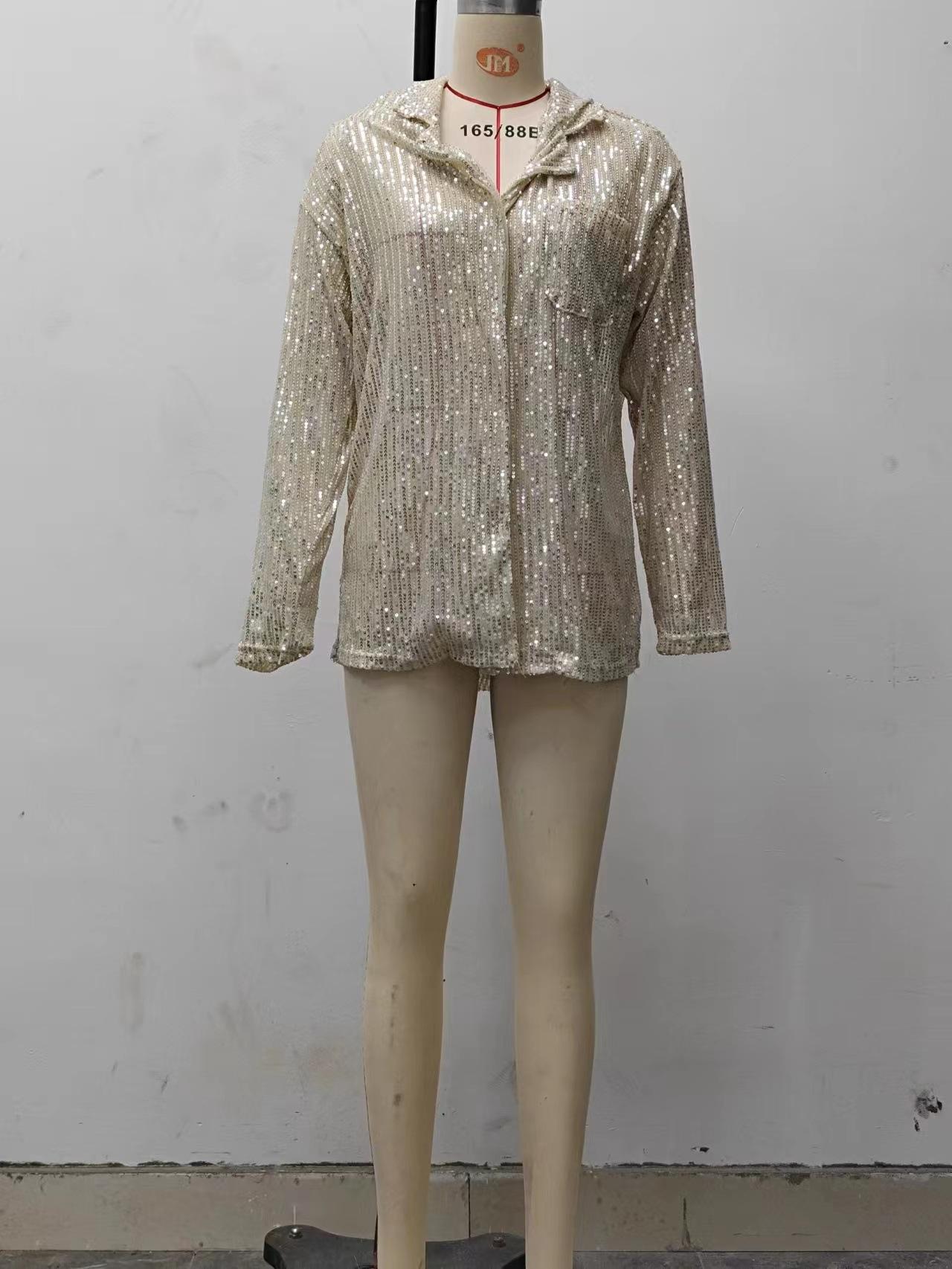 Otoño 2025 Ropa de Mujer Transfronteriza Europea y Americana Amazon Nueva Moda Camisa Casual de Solapa de Manga Larga con Lentejuelas