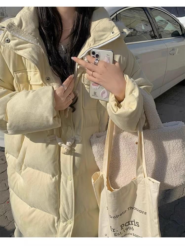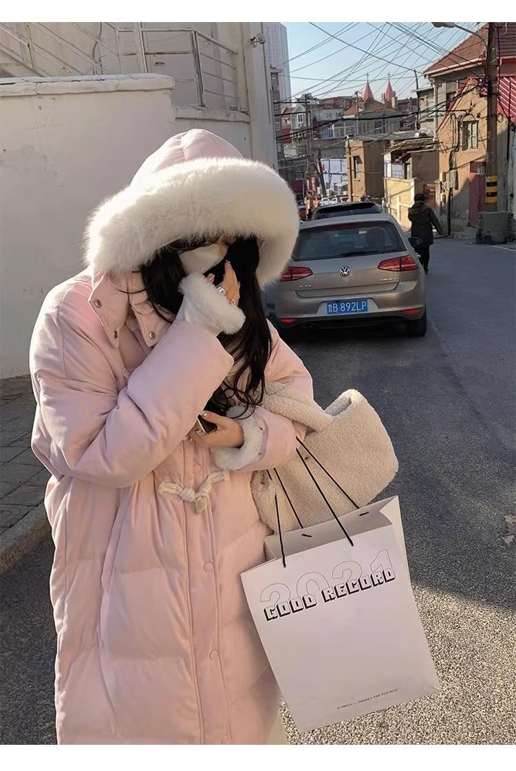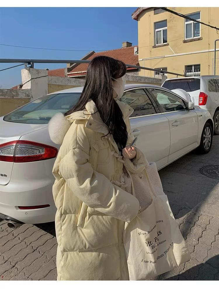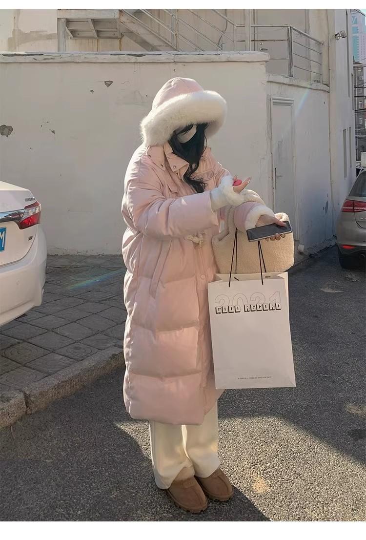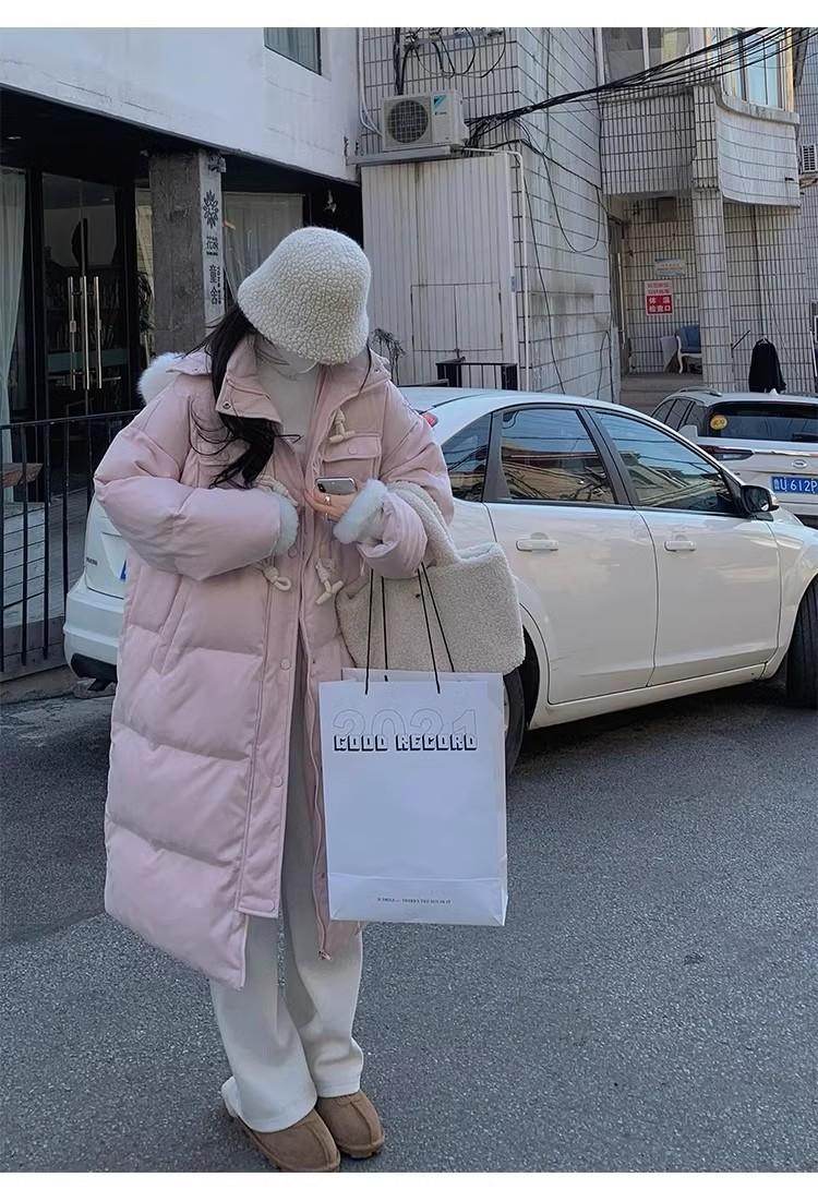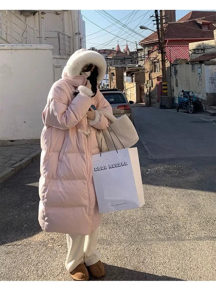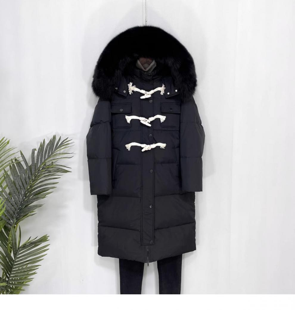 Chaqueta acolchada de algodón para mujer, de longitud media, nuevo estilo 2024, con hebilla de cuerno sobre la rodilla, cuello de piel grande, capucha, abrigo grueso de invierno