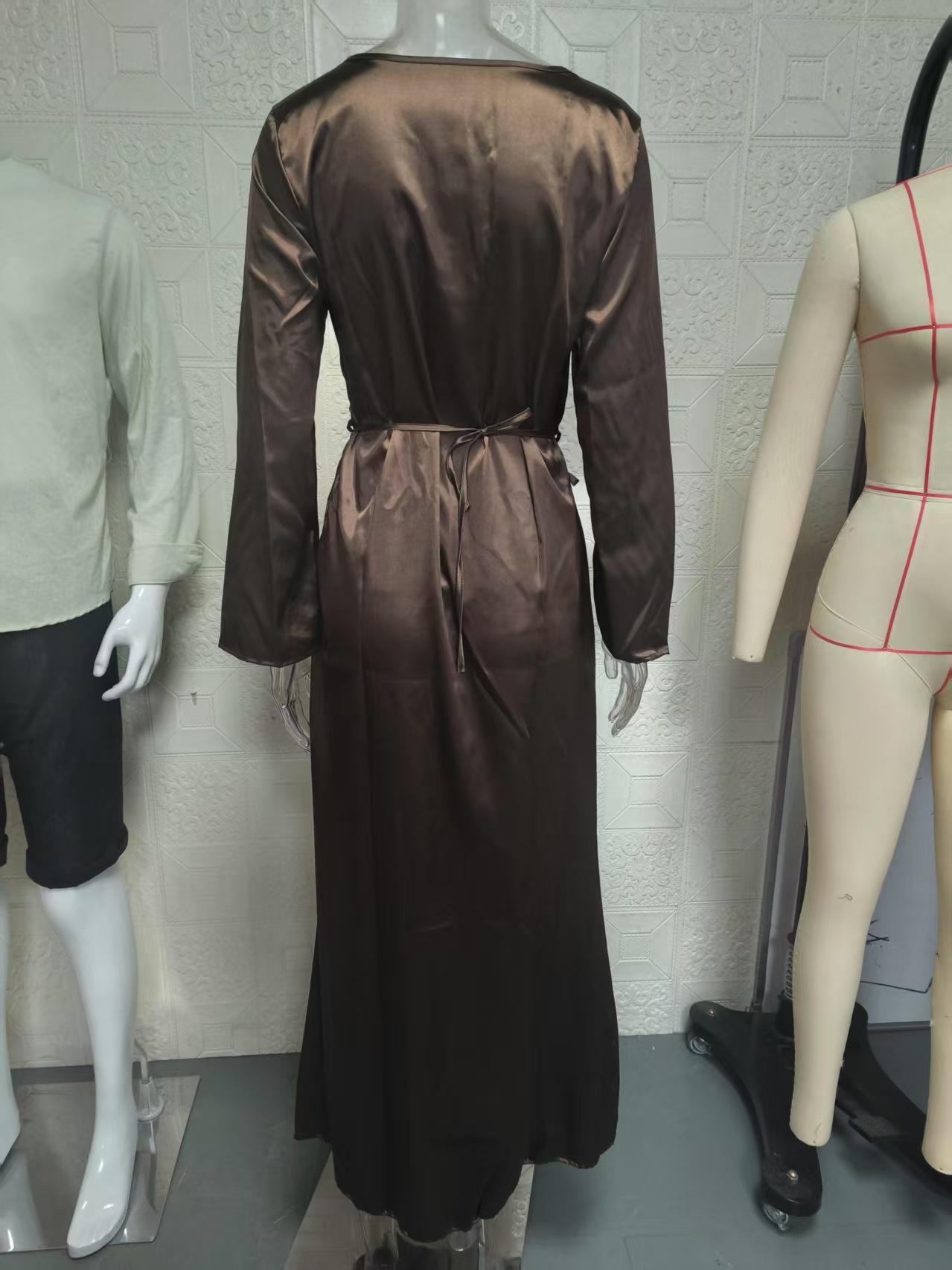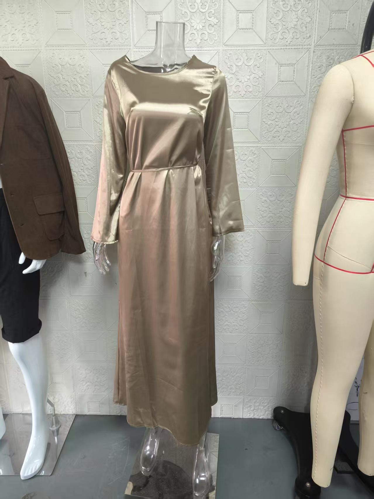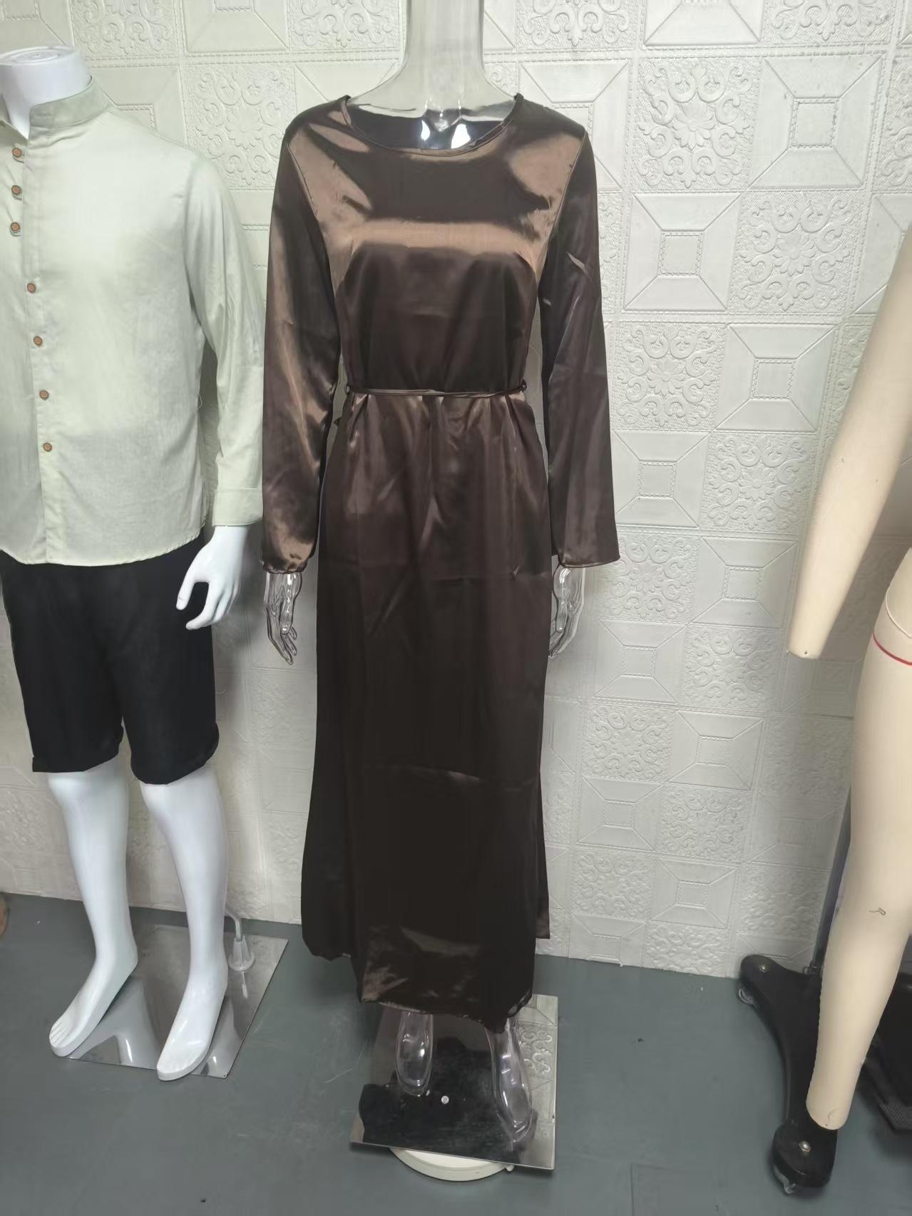 Ropa Europea y Americana Transfronteriza de Verano 2025 Color Puro Cuello Redondo Manga Larga con Cordones Estilo Nacional Estilo Perezoso Vestido de Cintura