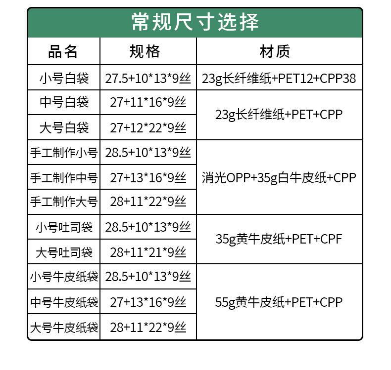 small size white bag (5-6 pieces of toast), Medium white bag (6-8 slices of toast), Large white bag (450g toast)