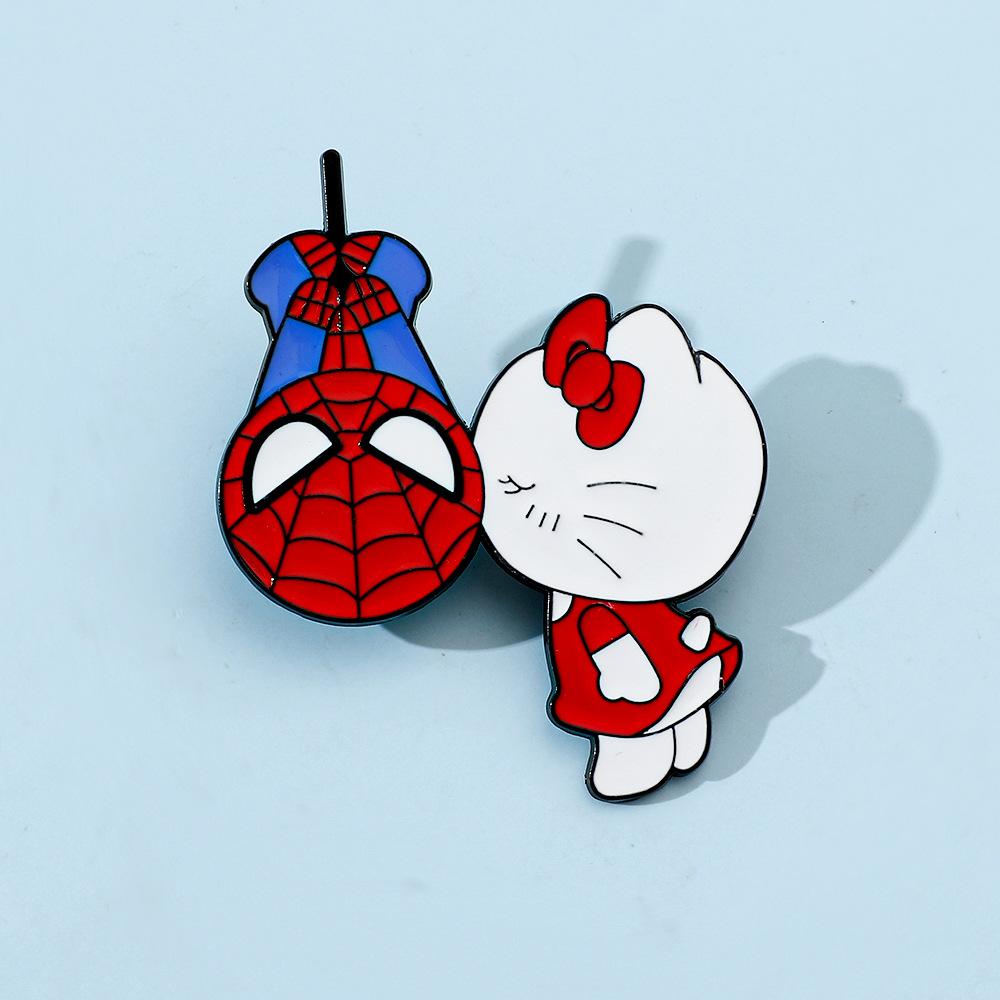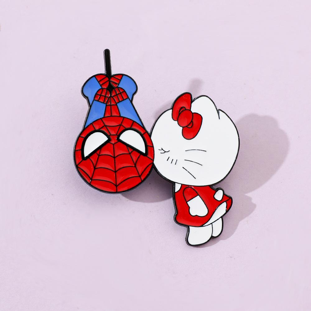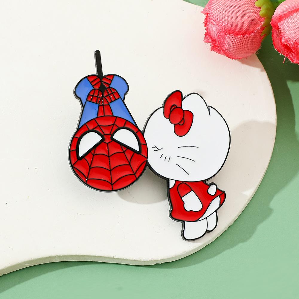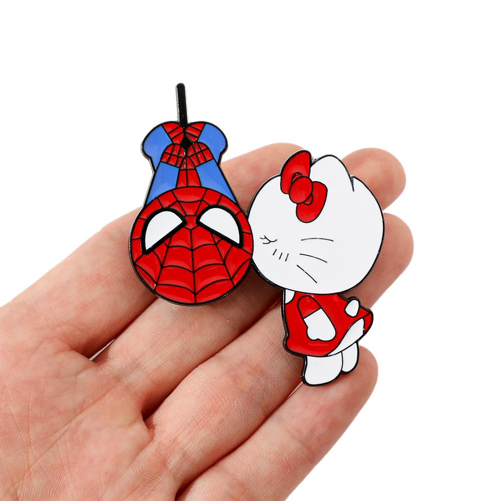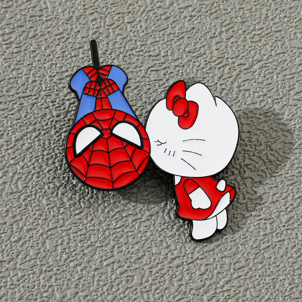 Lindo broche de metal creativo de Sanrio para el Día del Hombre Araña y el Gato Kt con forma de gota de aceite, accesorios de aleación