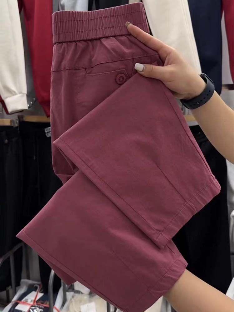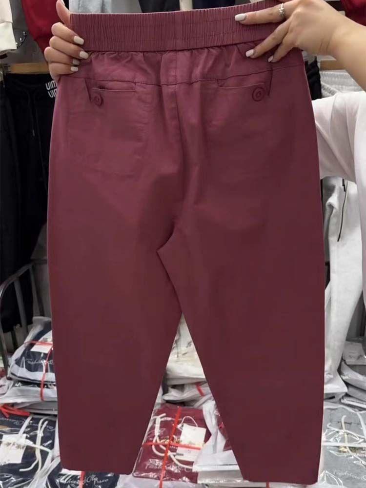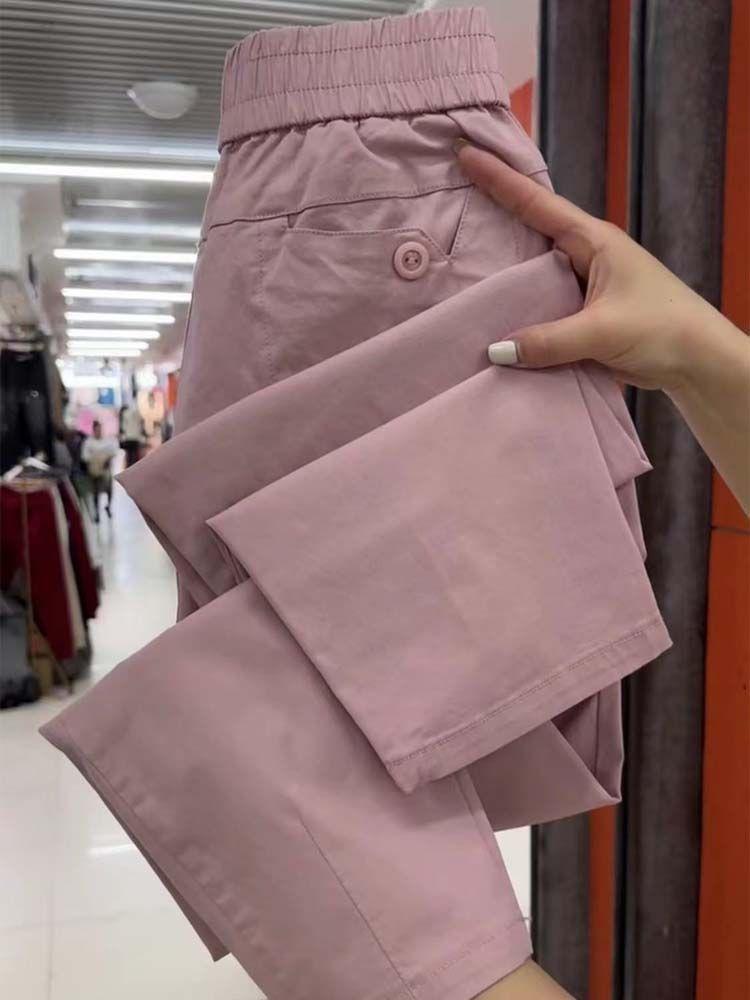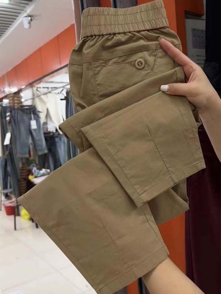 Pantalones casuales de color liso que combinan con todo para mujer, nuevos pantalones de verano de algodón lavado, de cintura alta, adelgazantes, pantalones holgados y elásticos Hallen