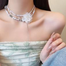 Collar de Doble Capa de Camelia Blanca para Mujer, Retro, Súper Hada, Temperamento, Collar de Perlas, Cadena de Clavícula Popular de Alta Gama