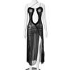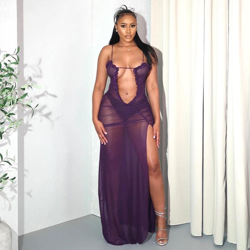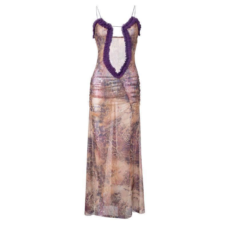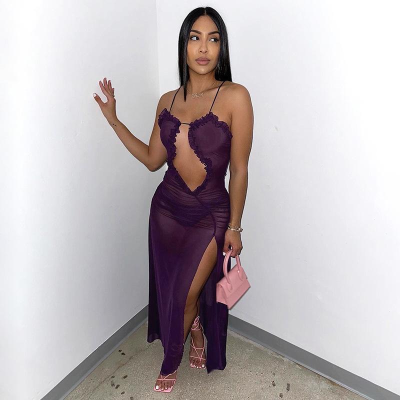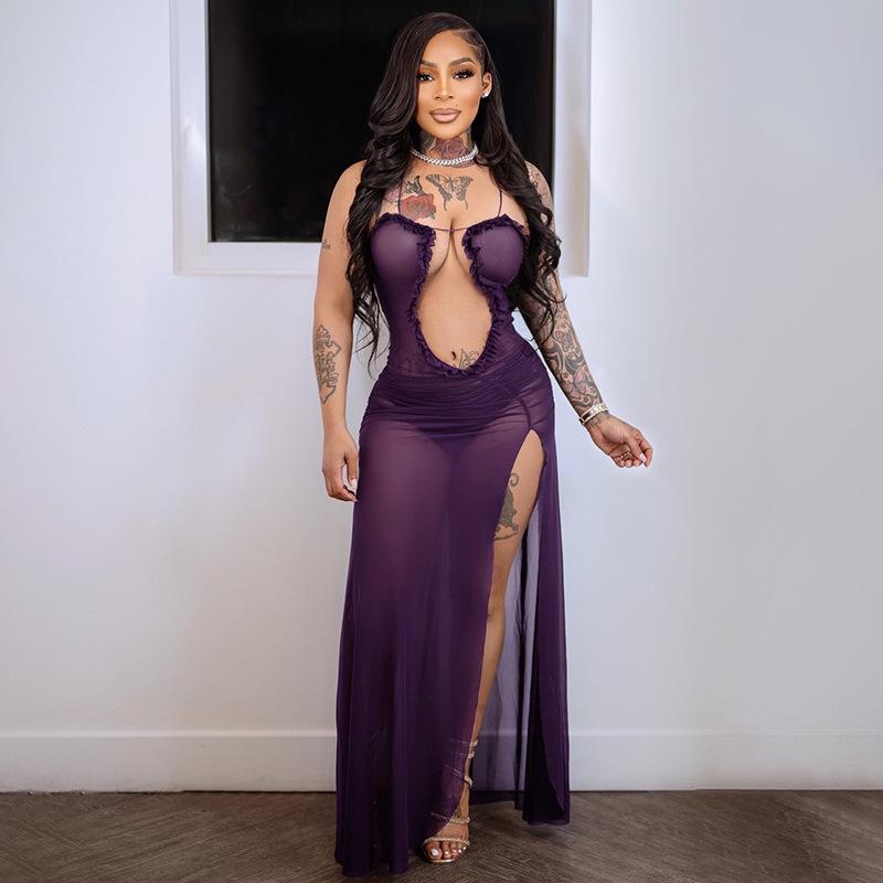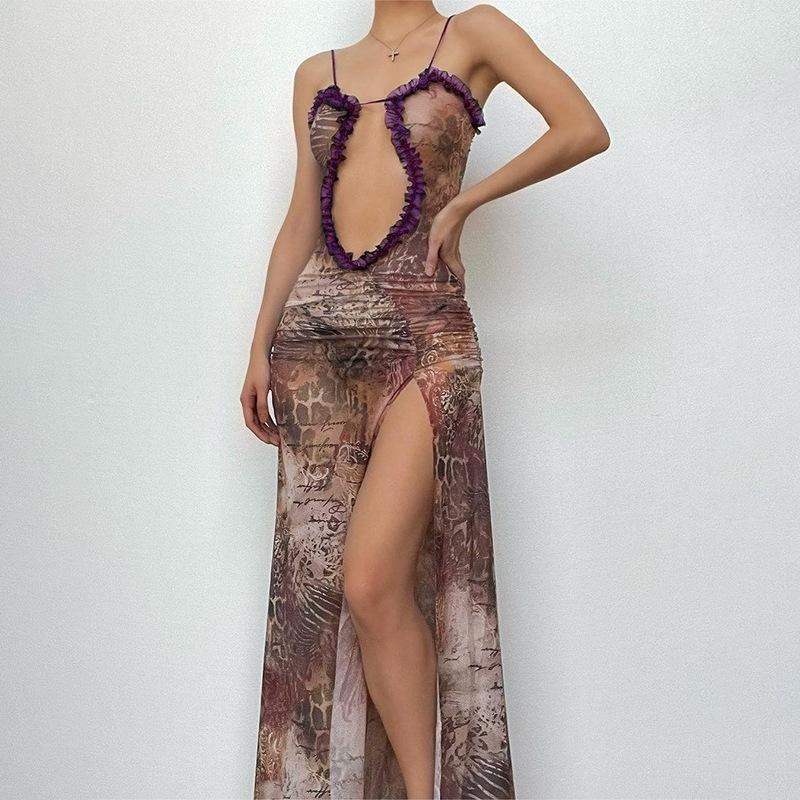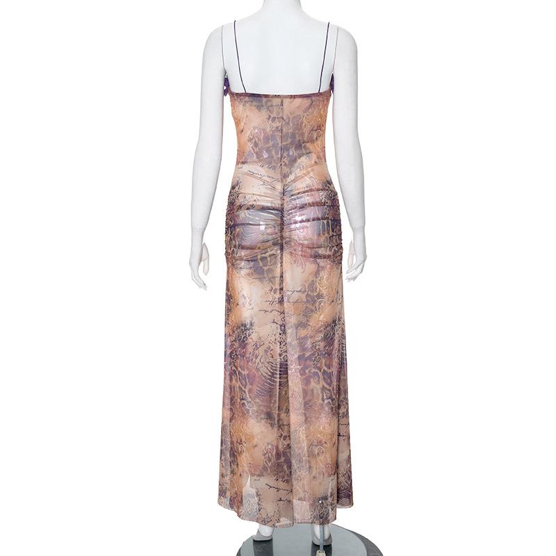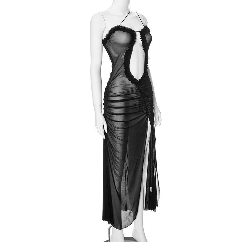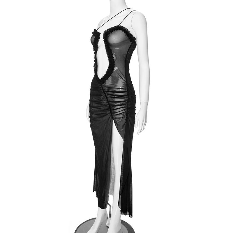 D24Ds055 Europeo y Americano Verano Nuevo Estilo Sin Mangas Tirantes Recorte Plisado Encaje Malla Abertura Vestido Largo