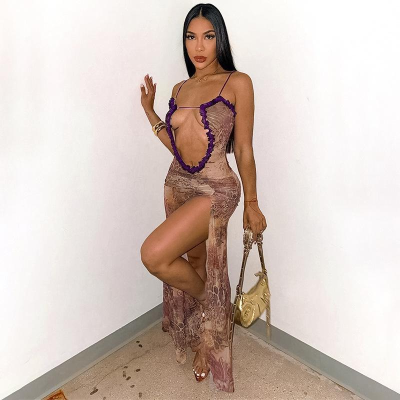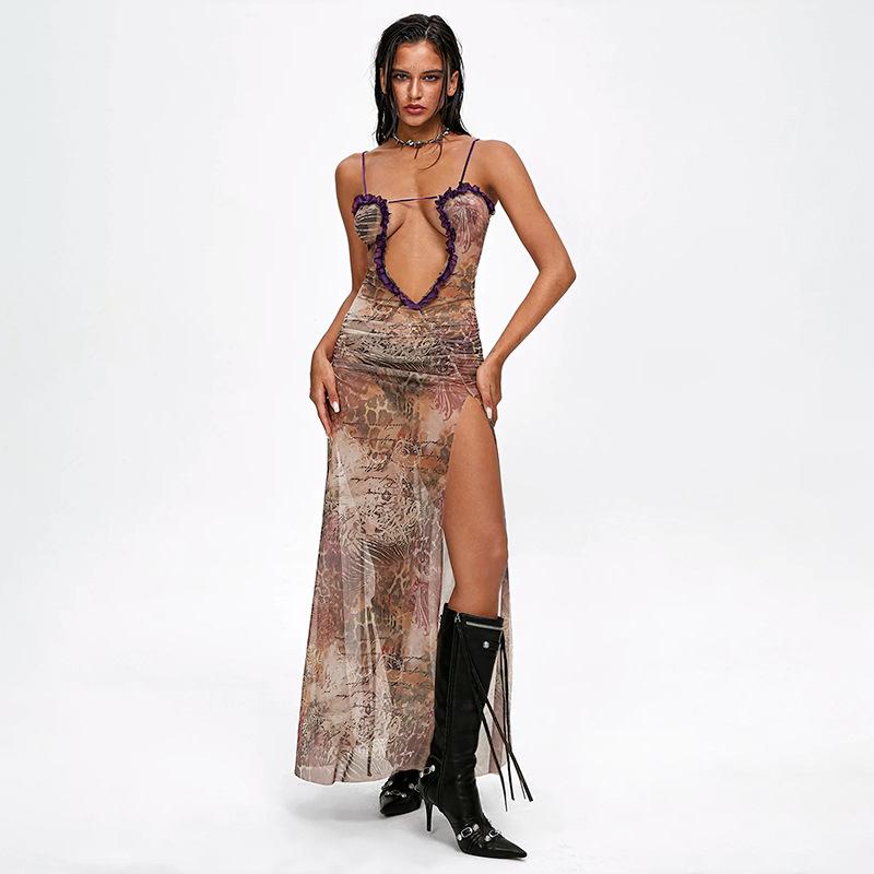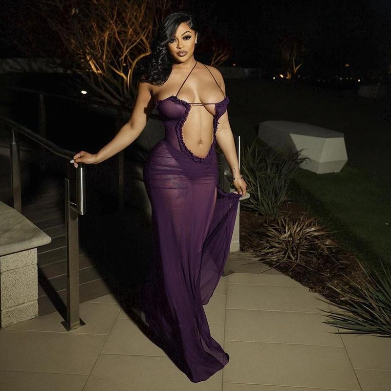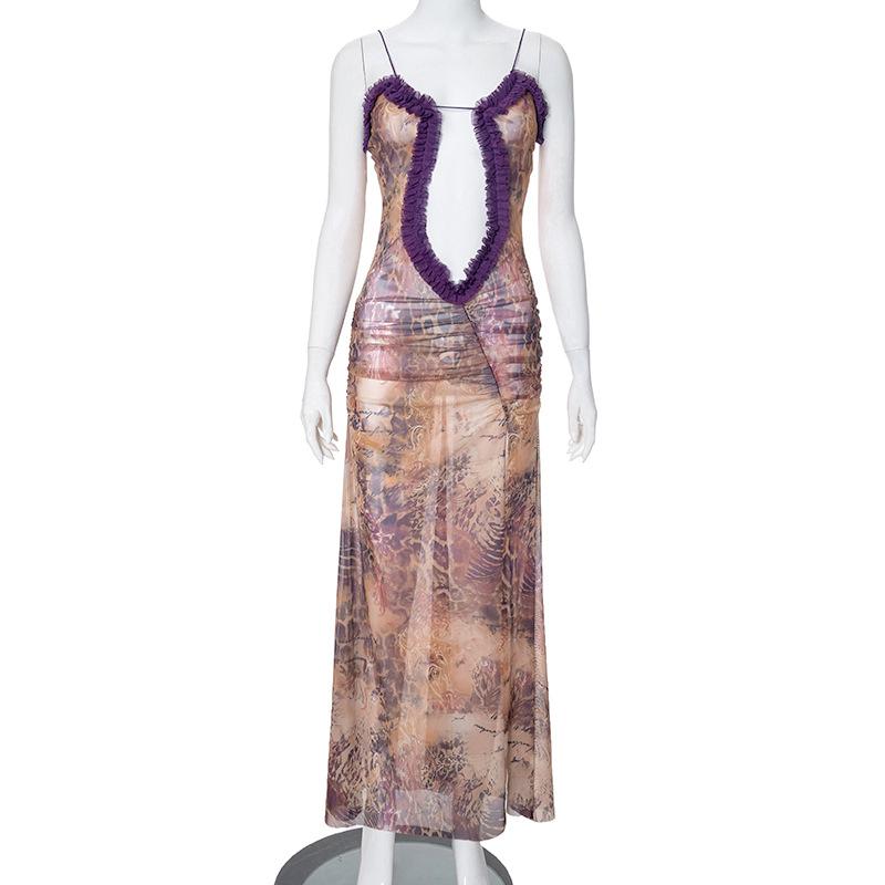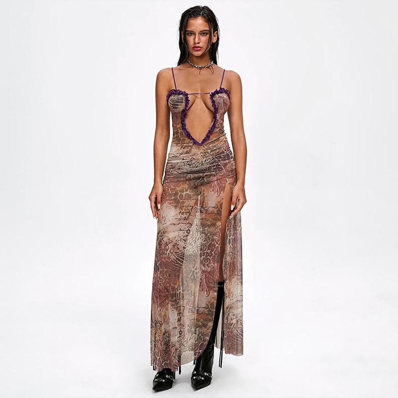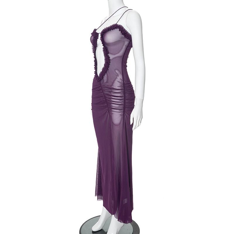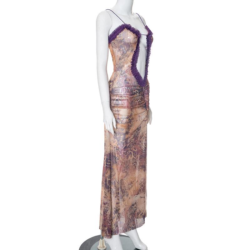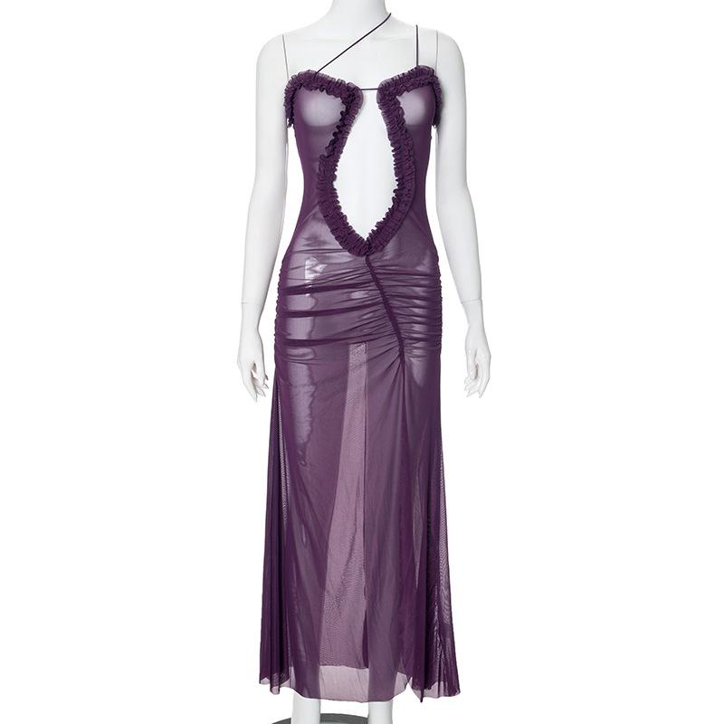 D24Ds055 Europeo y Americano Verano Nuevo Estilo Sin Mangas Tirantes Recorte Plisado Encaje Malla Abertura Vestido Largo