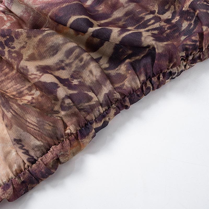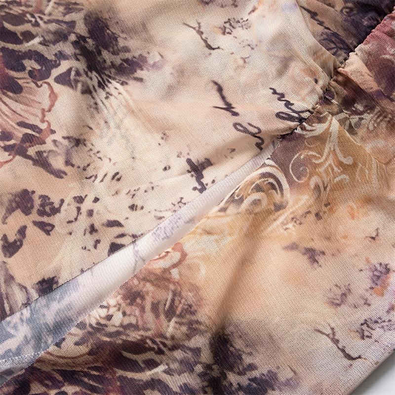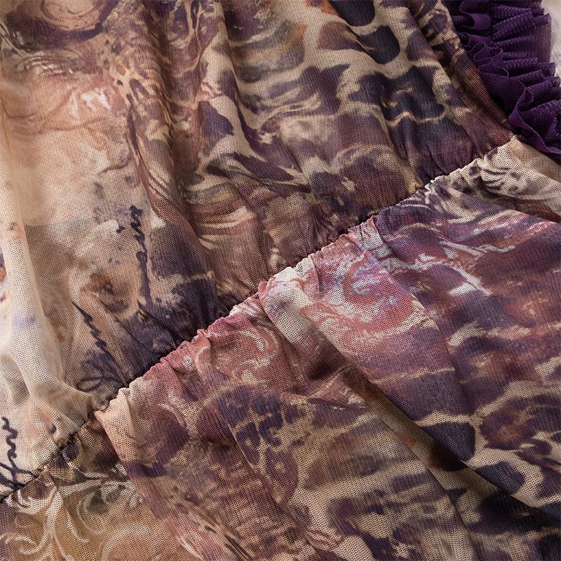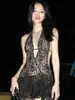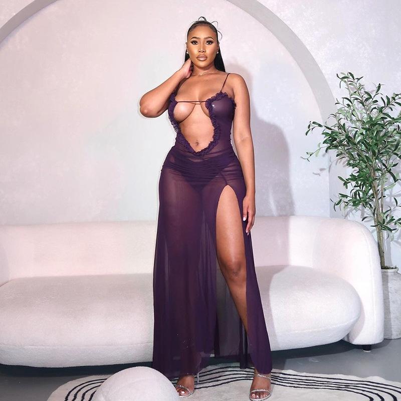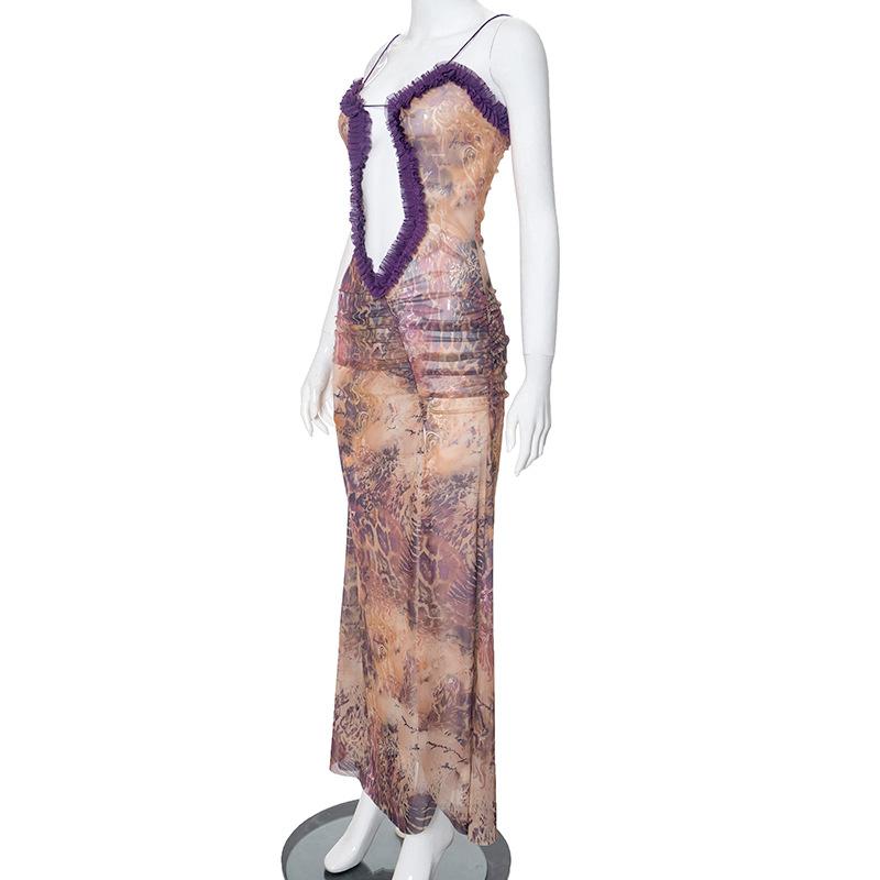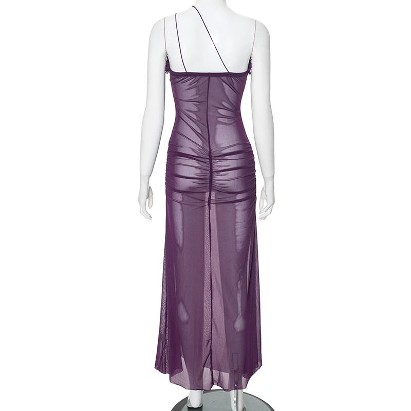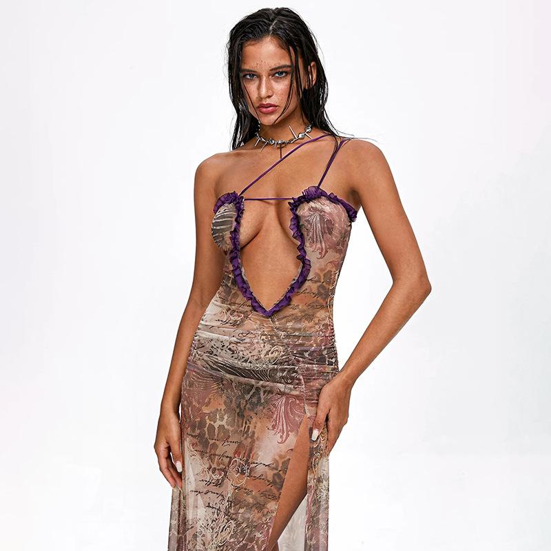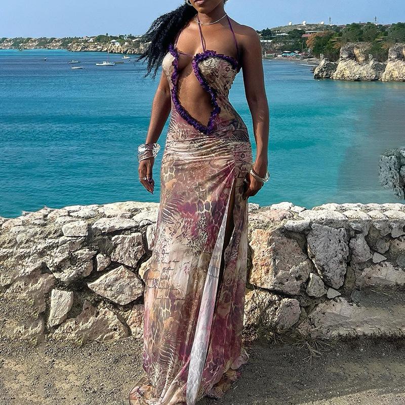 D24Ds055 Europeo y Americano Verano Nuevo Estilo Sin Mangas Tirantes Recorte Plisado Encaje Malla Abertura Vestido Largo