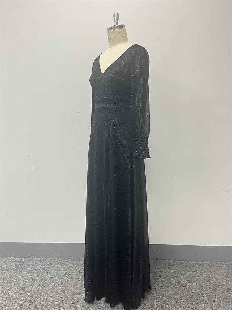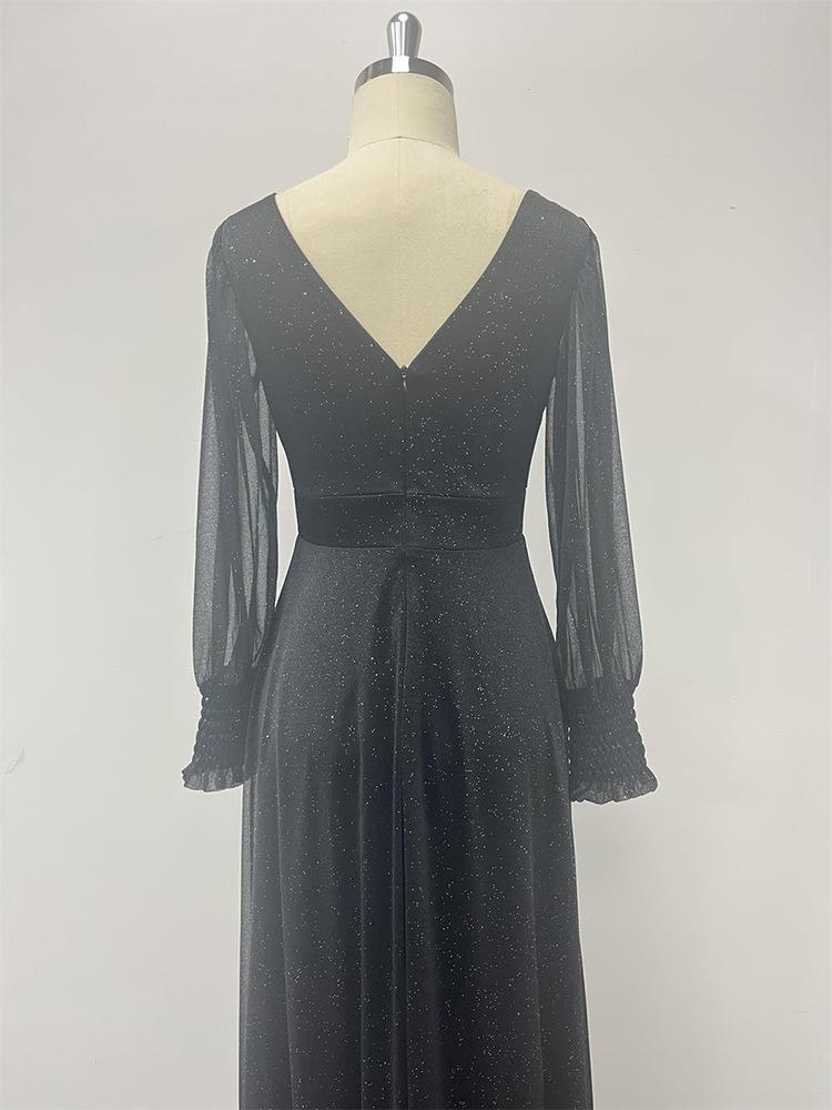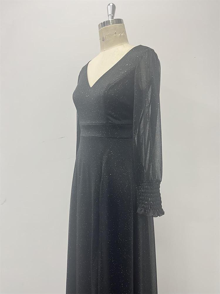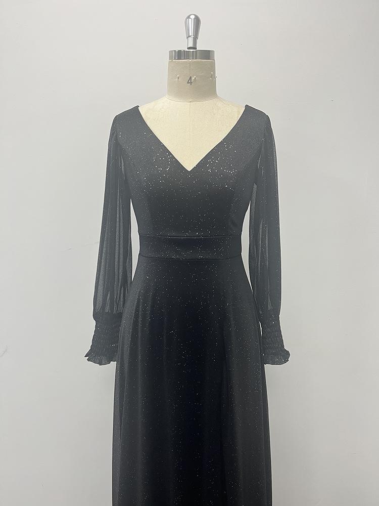 Nuevo Vestido Largo de Manga Larga con Costuras de Perspectiva Europea y Americana, Cuello en V, Abertura Alta, Gran A, Brillante, Forro Completo, Vestido de Noche de Calidad