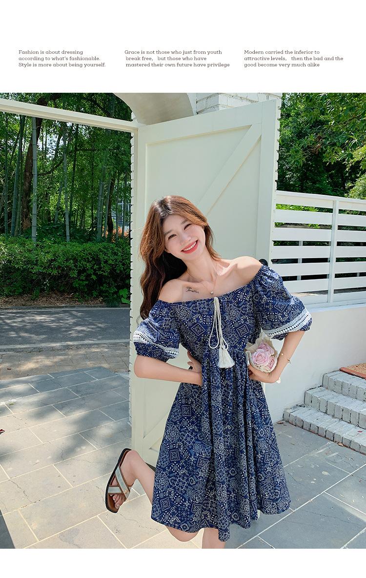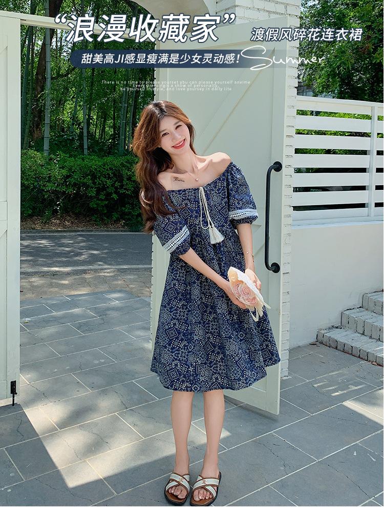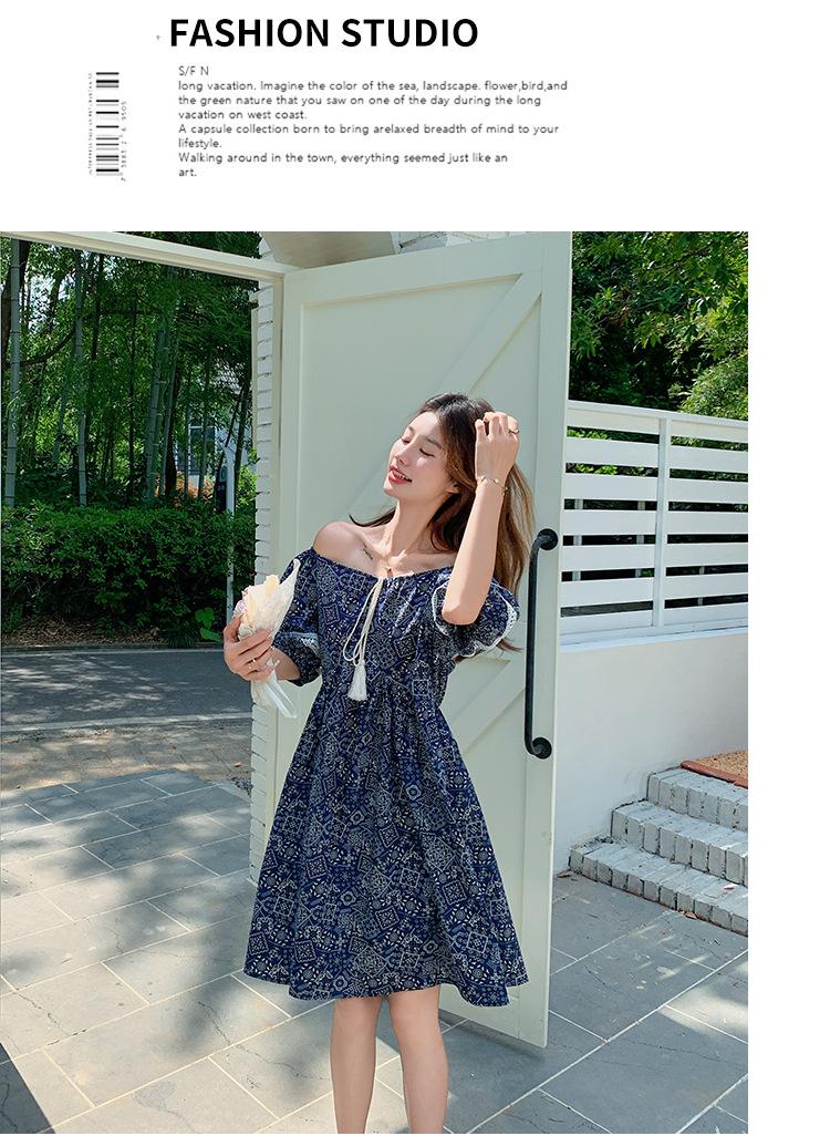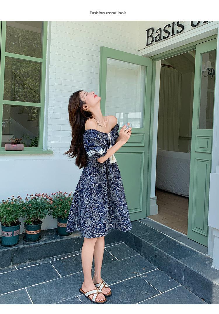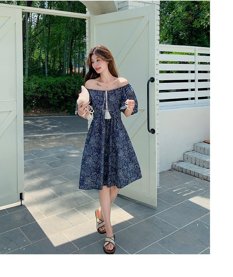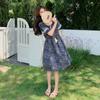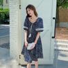 Vestido estampado con hombros azules para mujer, verano 2024, nuevo estilo, elegante, hermoso diseño de costura, corte A, falda.