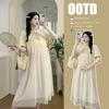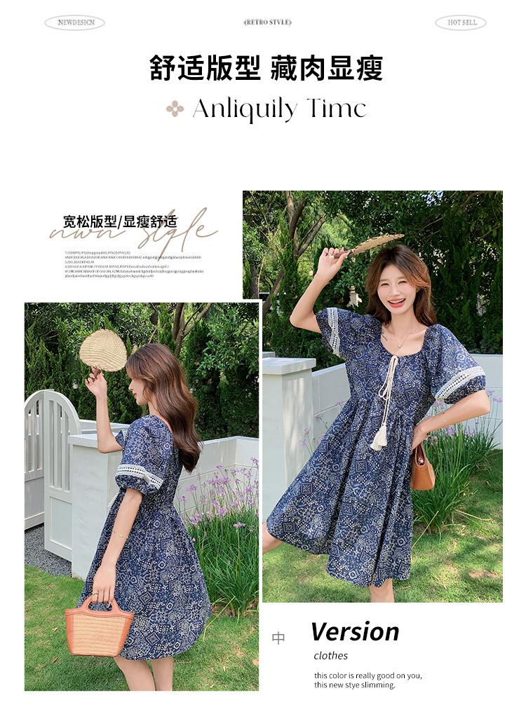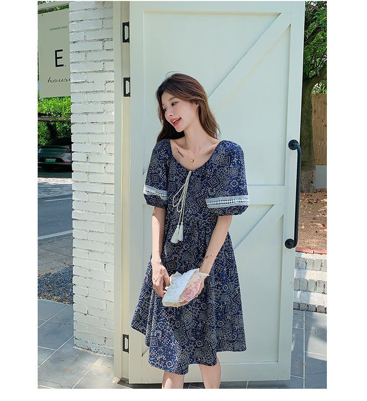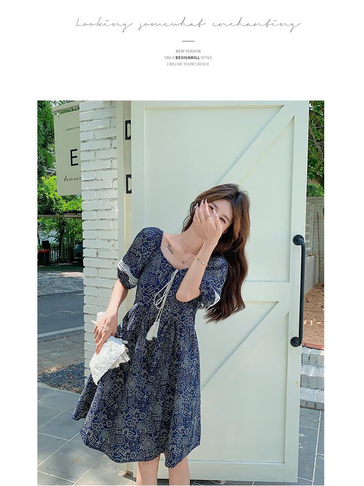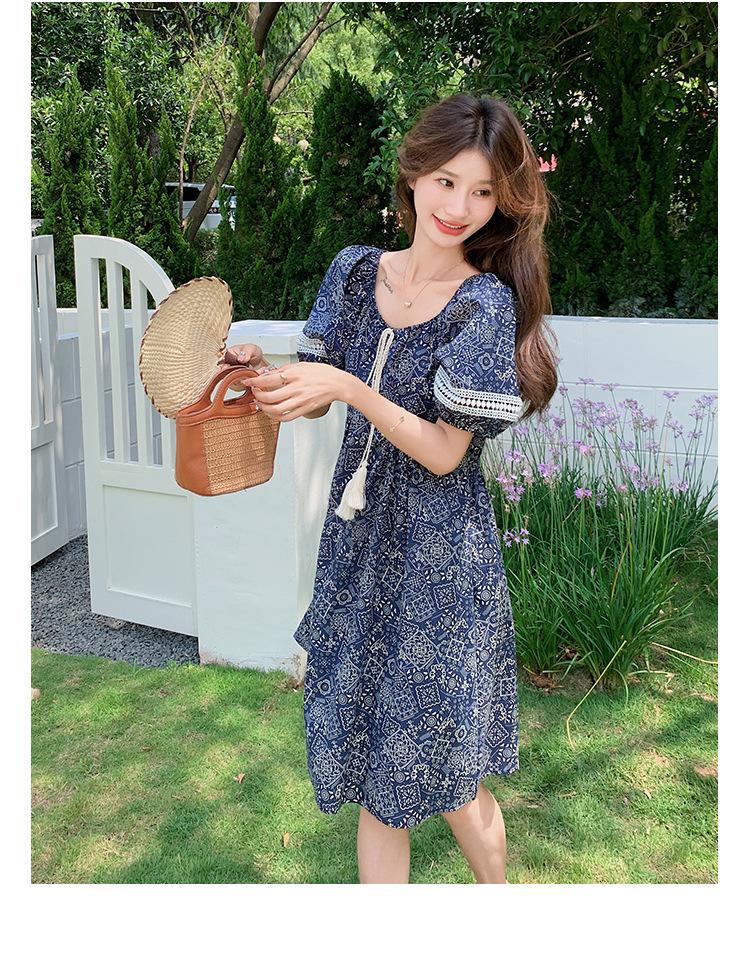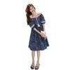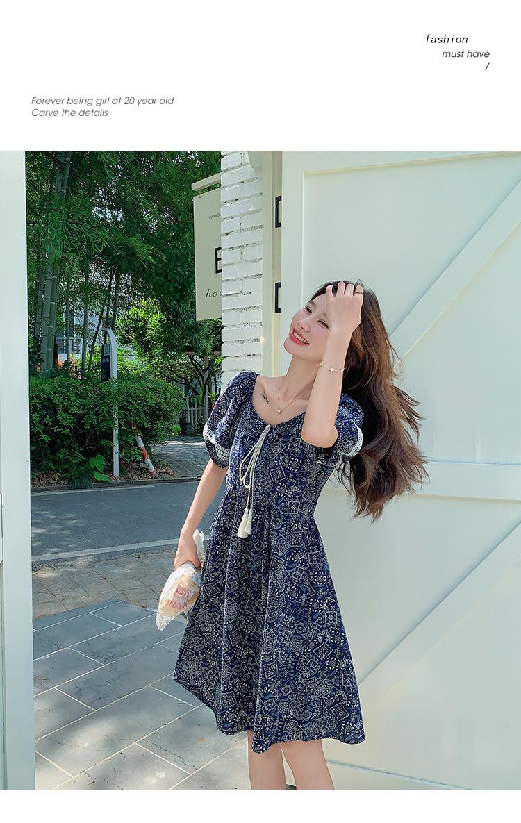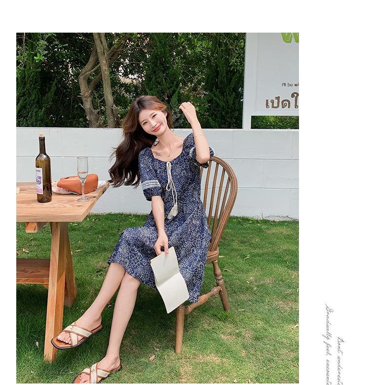 Vestido estampado con hombros azules para mujer, verano 2024, nuevo estilo, elegante, hermoso diseño de costura, corte A, falda.