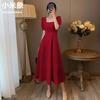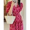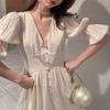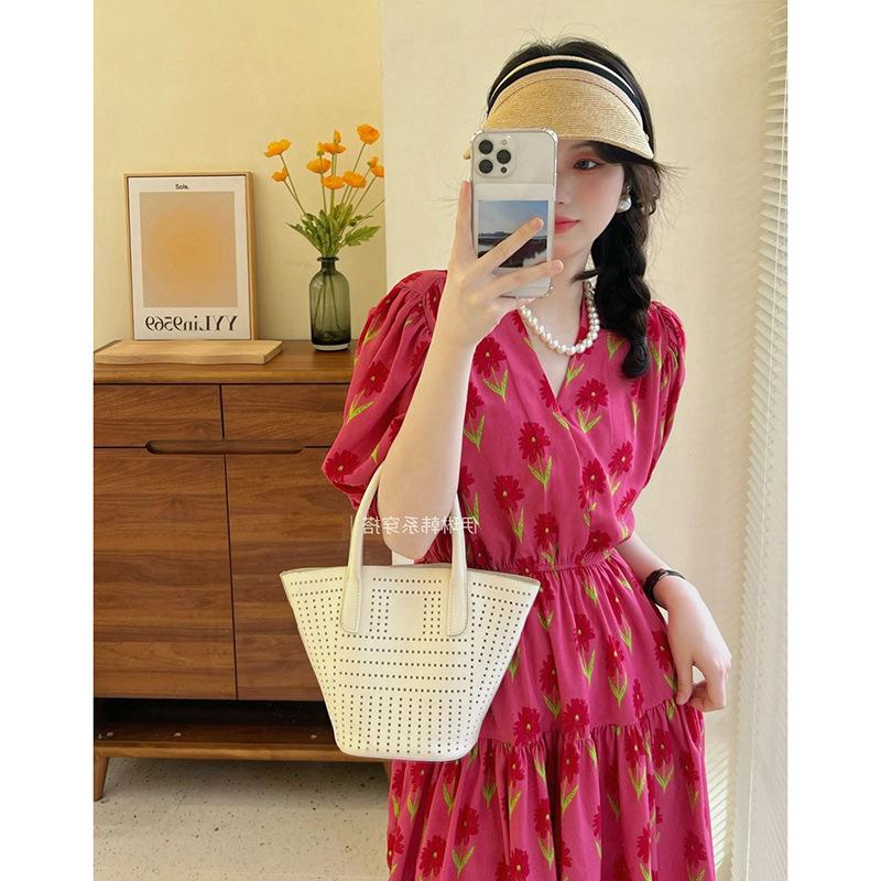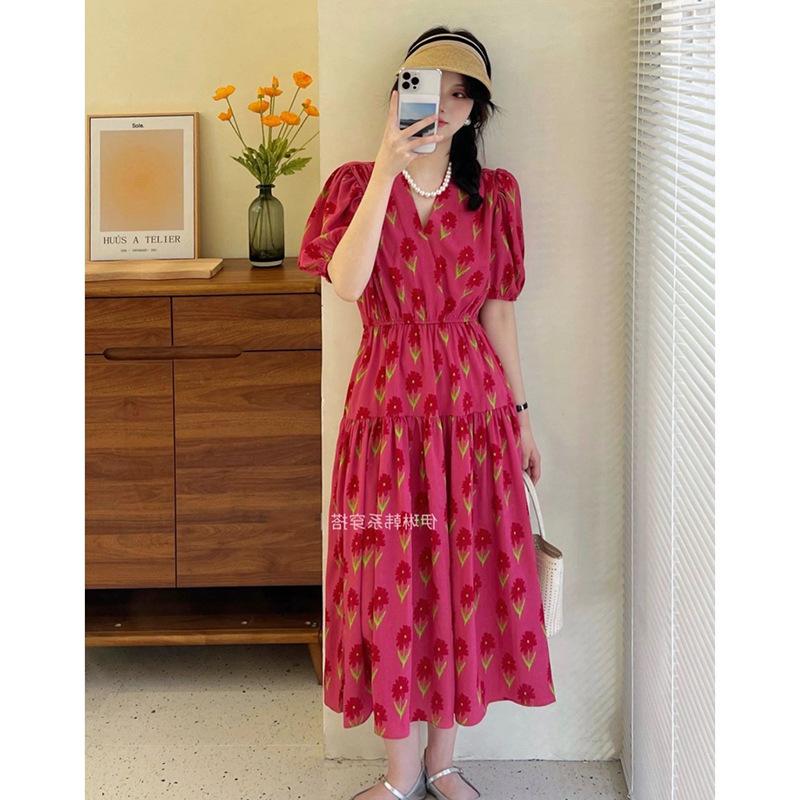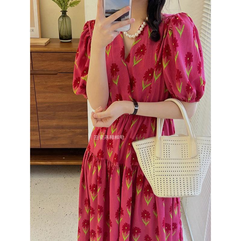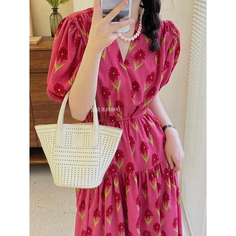 2025 Nuevo Verano Vestido Floral de Mujer Estilo Francés Suave Estilo Hepburn Cuello en V Manga Abullonada Cintura Falda Larga