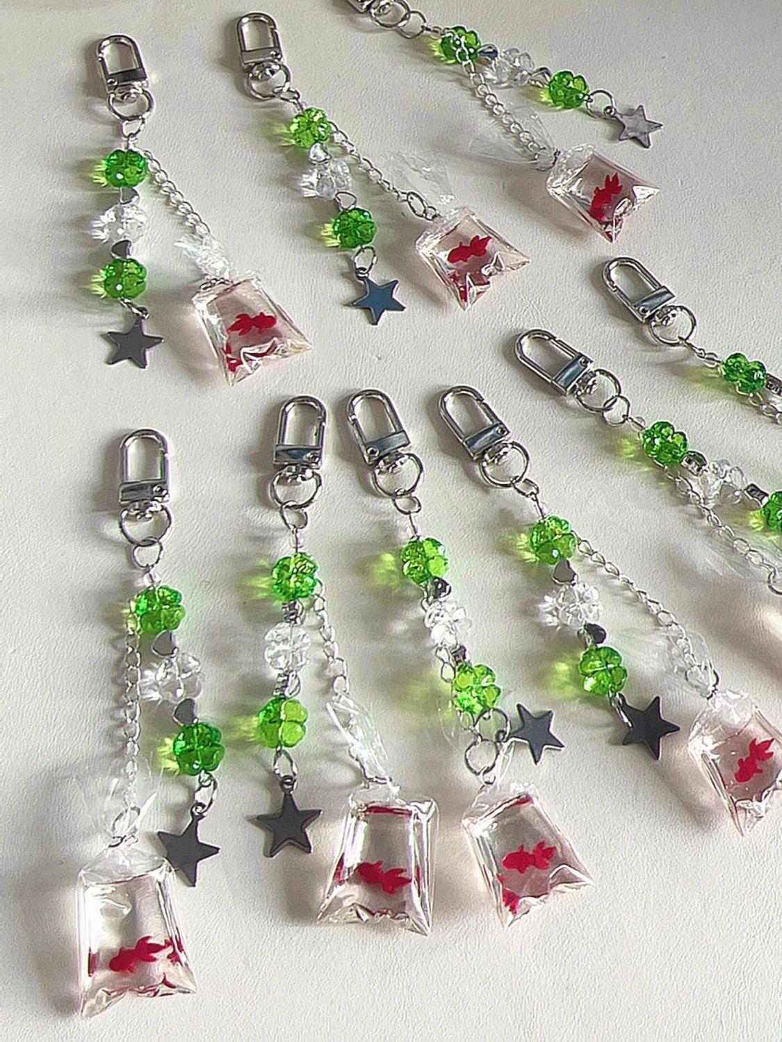 [Bolsa de pez de la suerte] Llavero con forma de corazón de niña hecho a mano con cuentas y colgante de tarjeta Goo Ben Goo lindo.