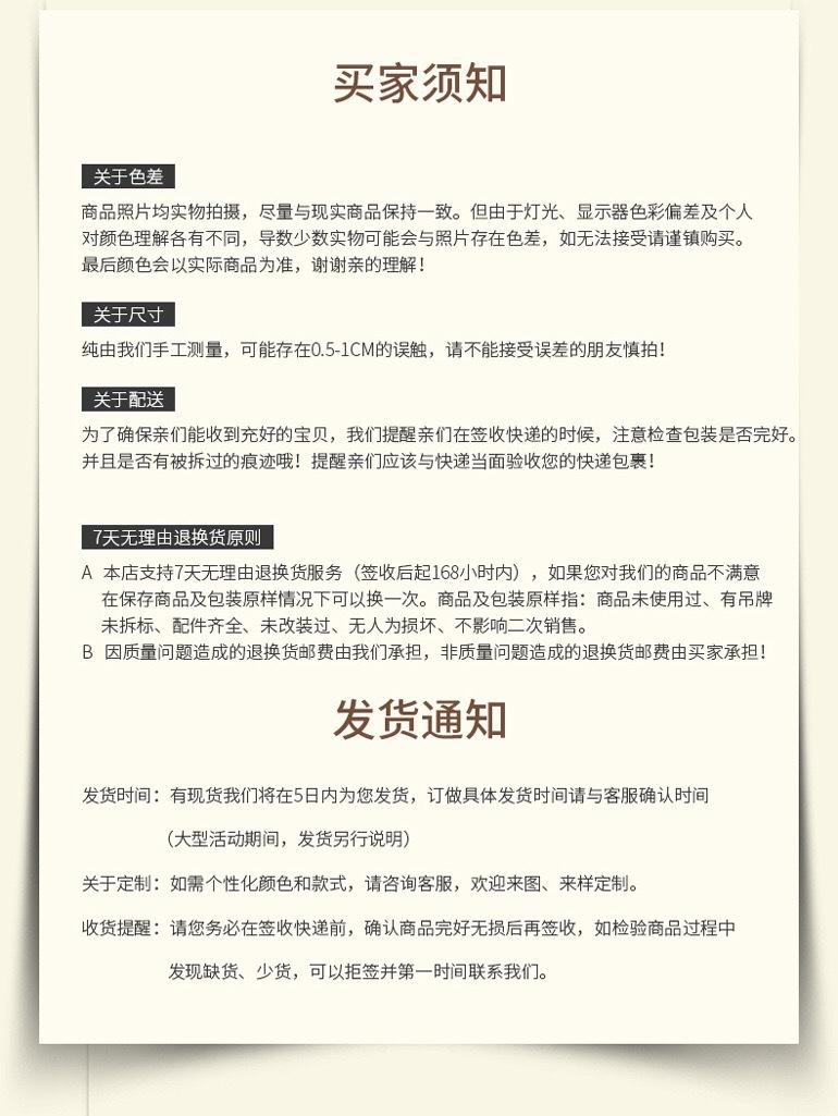 2. En cuanto a los estilos y colores, el valor predeterminado es el que se indica en el pedido. No se aceptan comentarios sobre estilos ni colores (excepto las instrucciones especiales en la página del producto). Haremos todo lo posible para adaptar los productos a sus necesidades, pero es inevitable que haya escasez, y esperamos que todos lo toleren. Si hay una escasez temporal (también puede hacer un pedido teniendo en cuenta que el color de la escasez es aleatorio), le notificaremos por Wangwang o por teléfono. ¡Disculpe!
