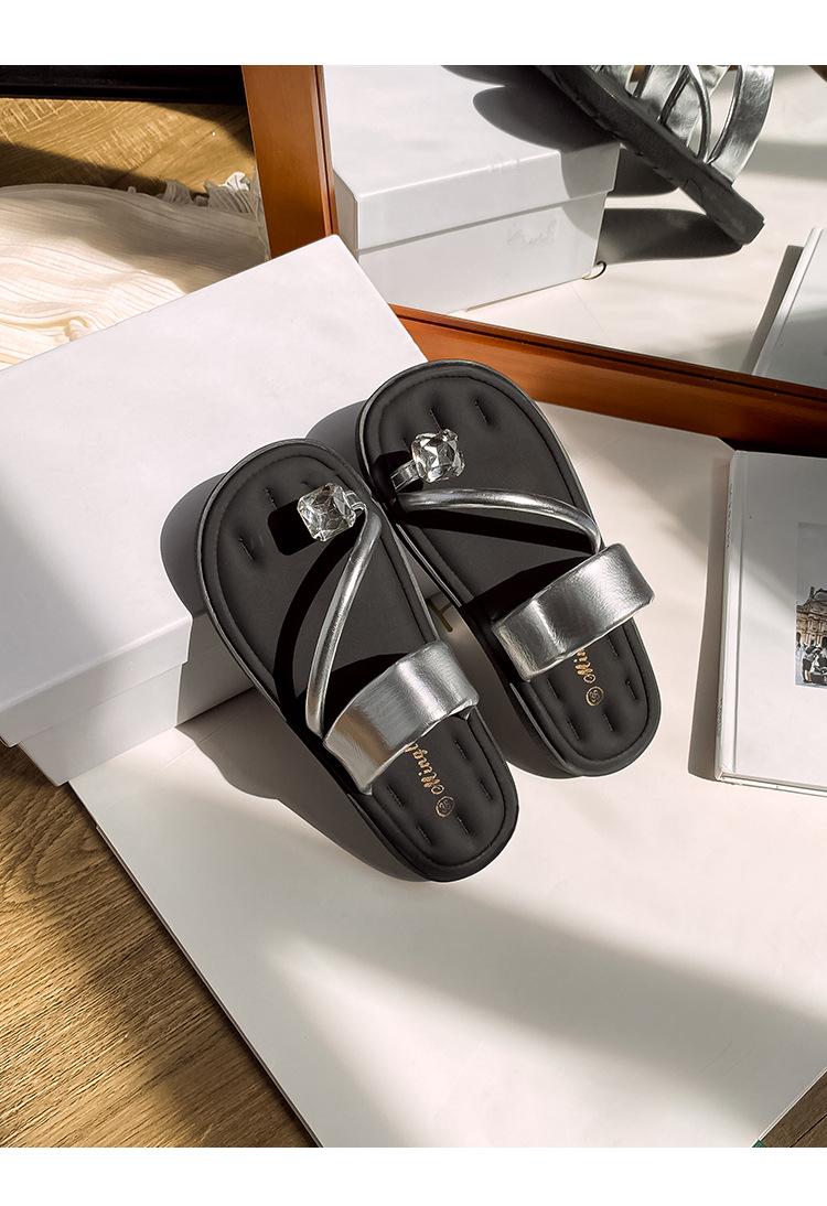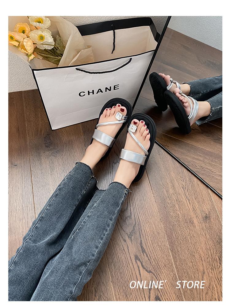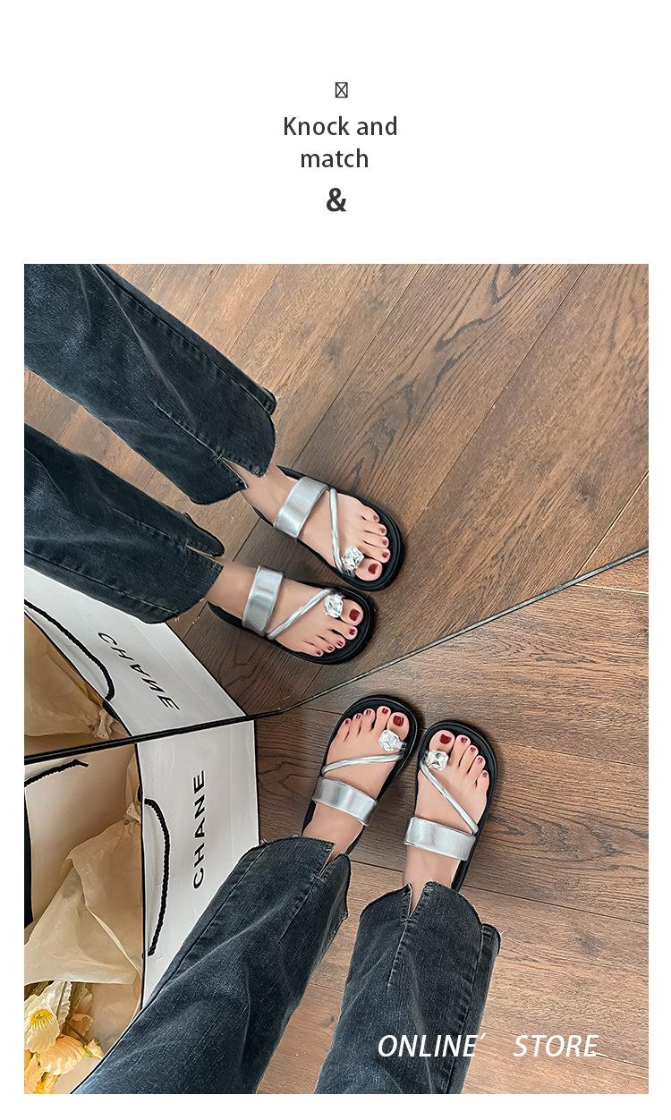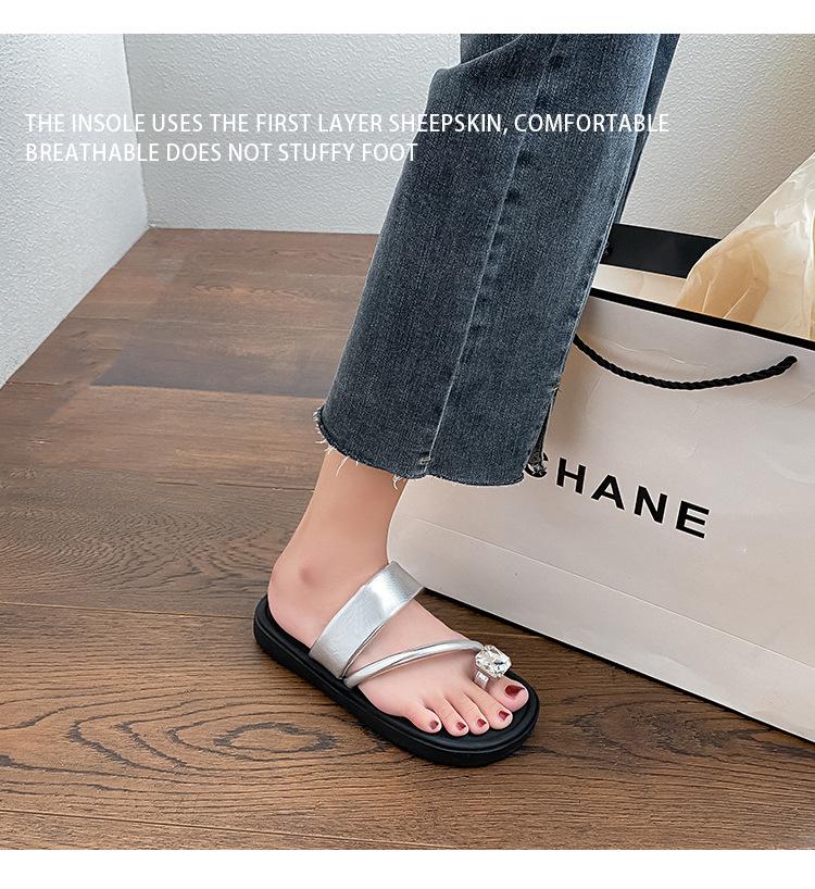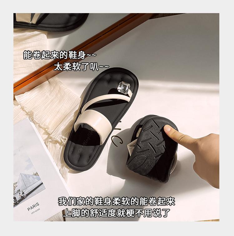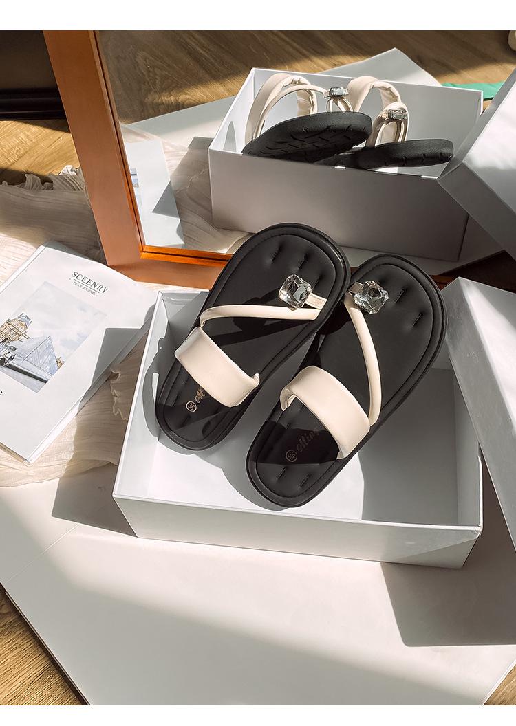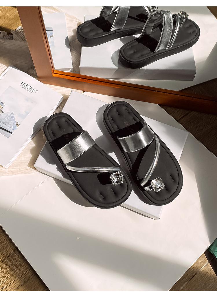 Chanclas de una línea estilo francés para ropa exterior de mujer 2025 verano nuevo de moda con pedrería de suela gruesa sandalias casuales
