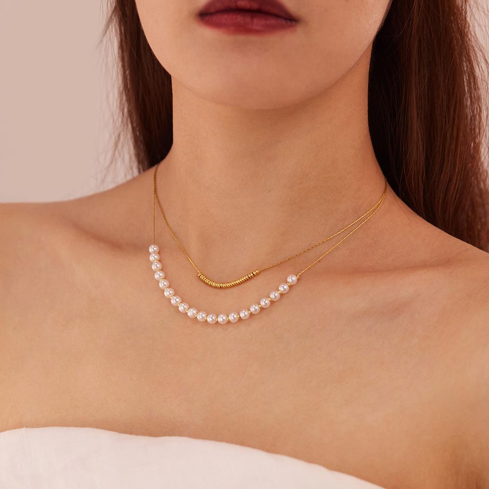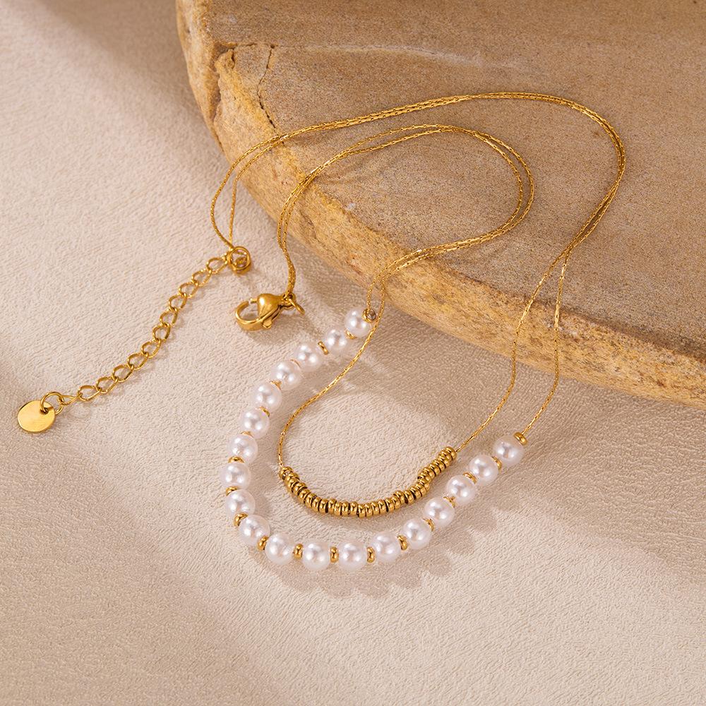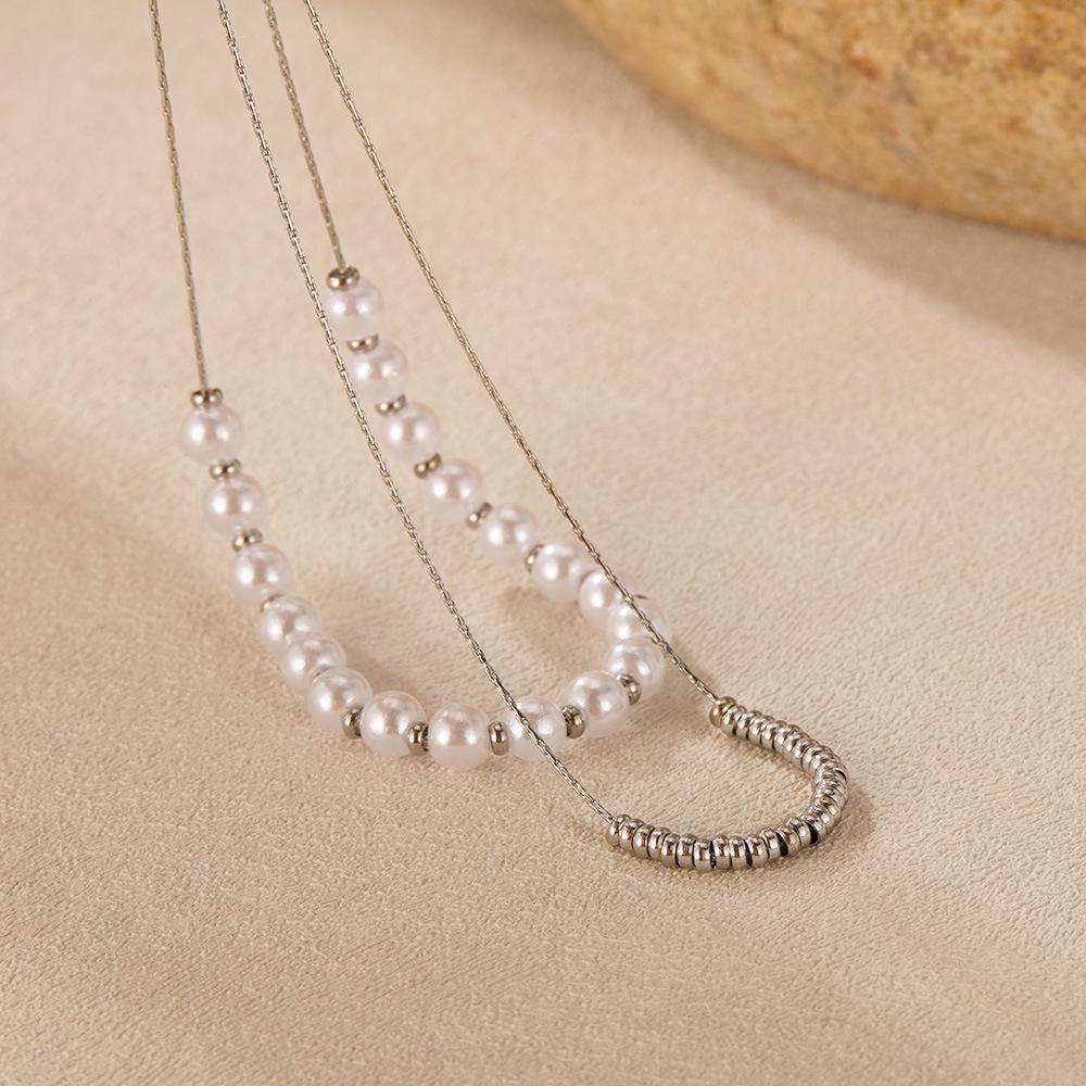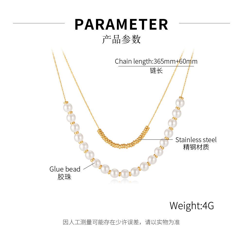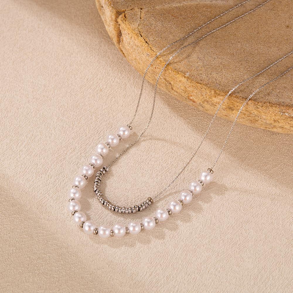 Collar de moda OPK de estilo europeo y americano para mujer, de acero inoxidable, con diseño de nicho, de doble capa, con perlas apiladas y cadena de clavícula de acero y titanio, venta al por mayor