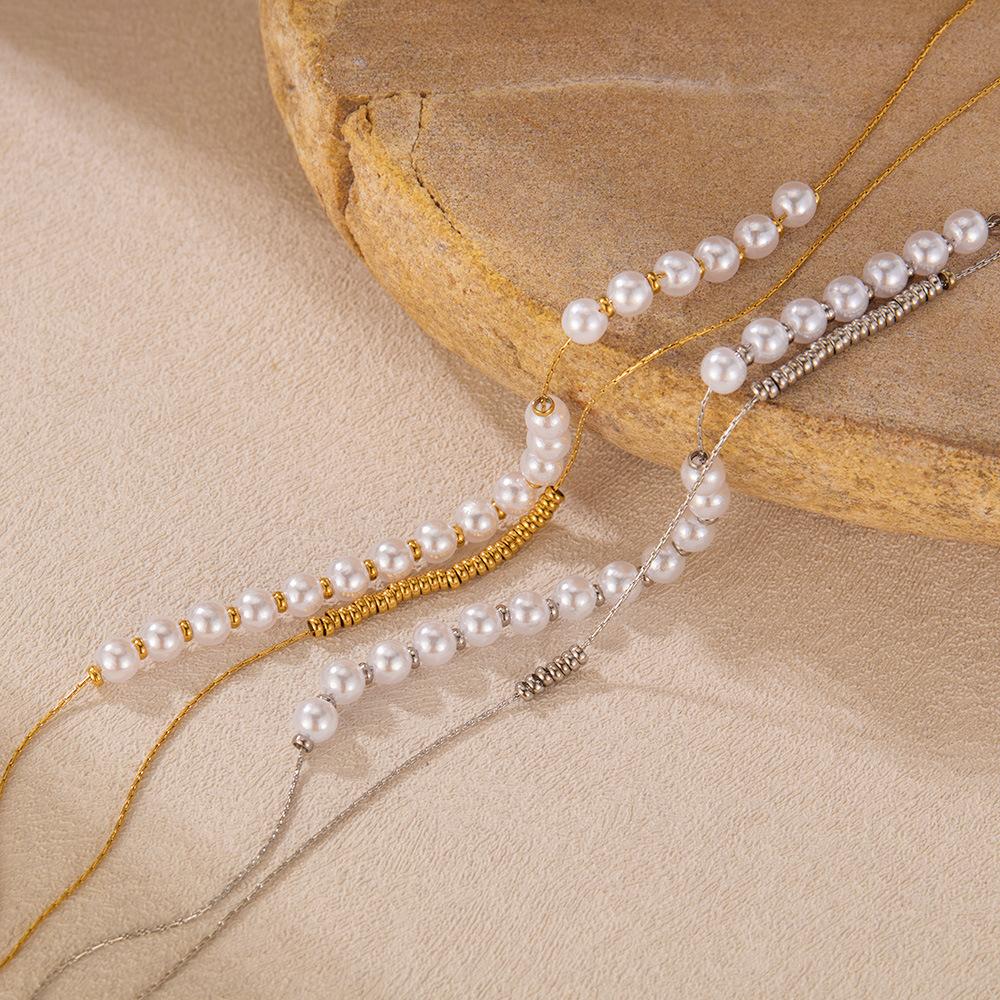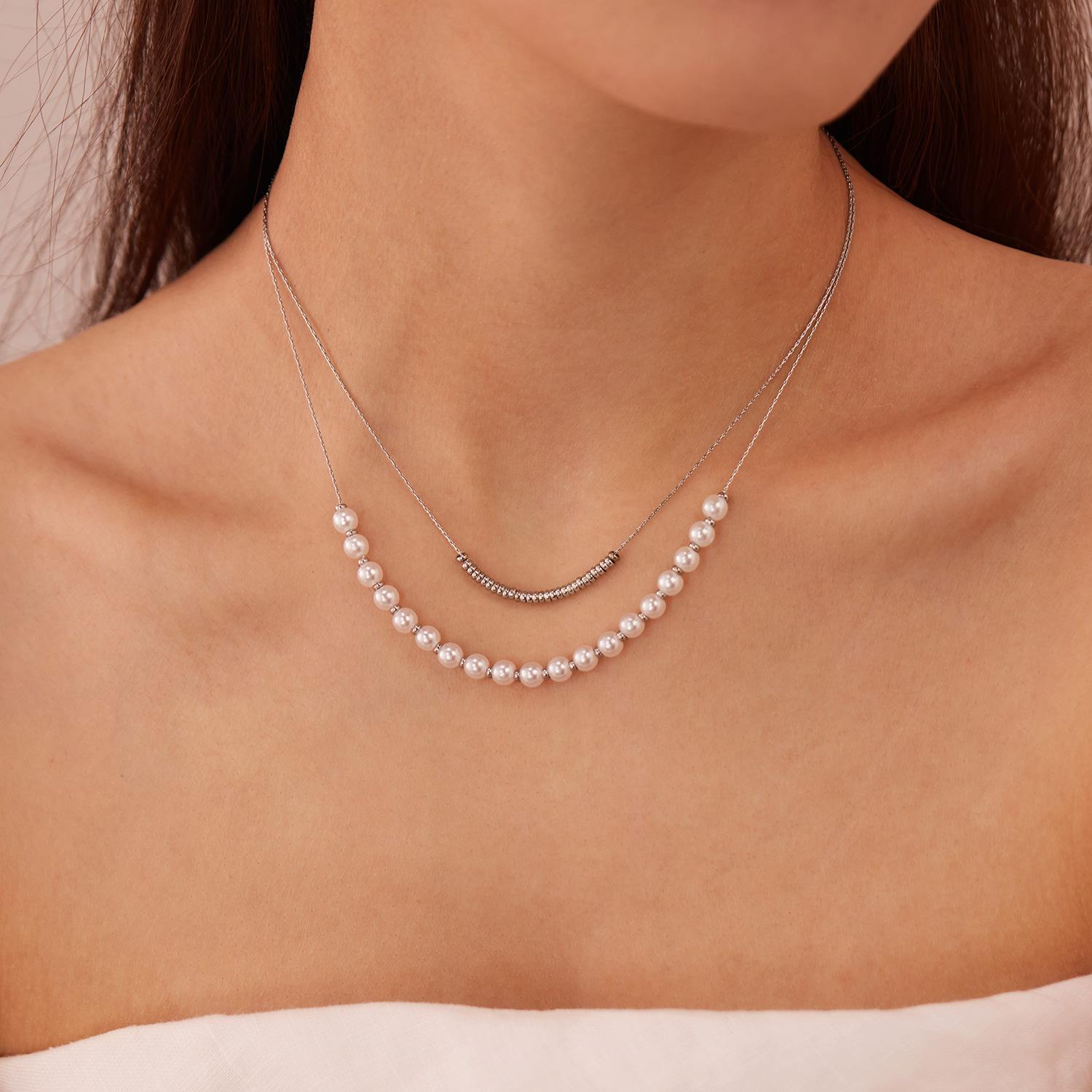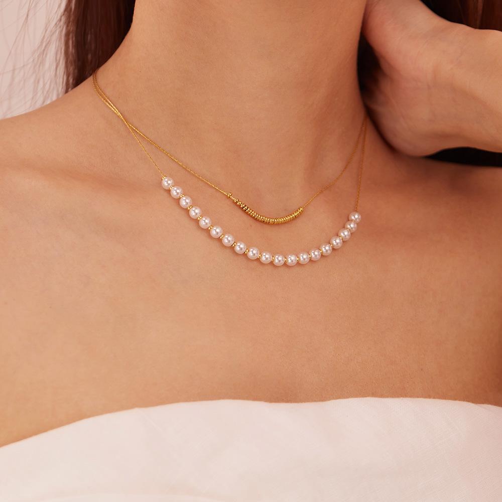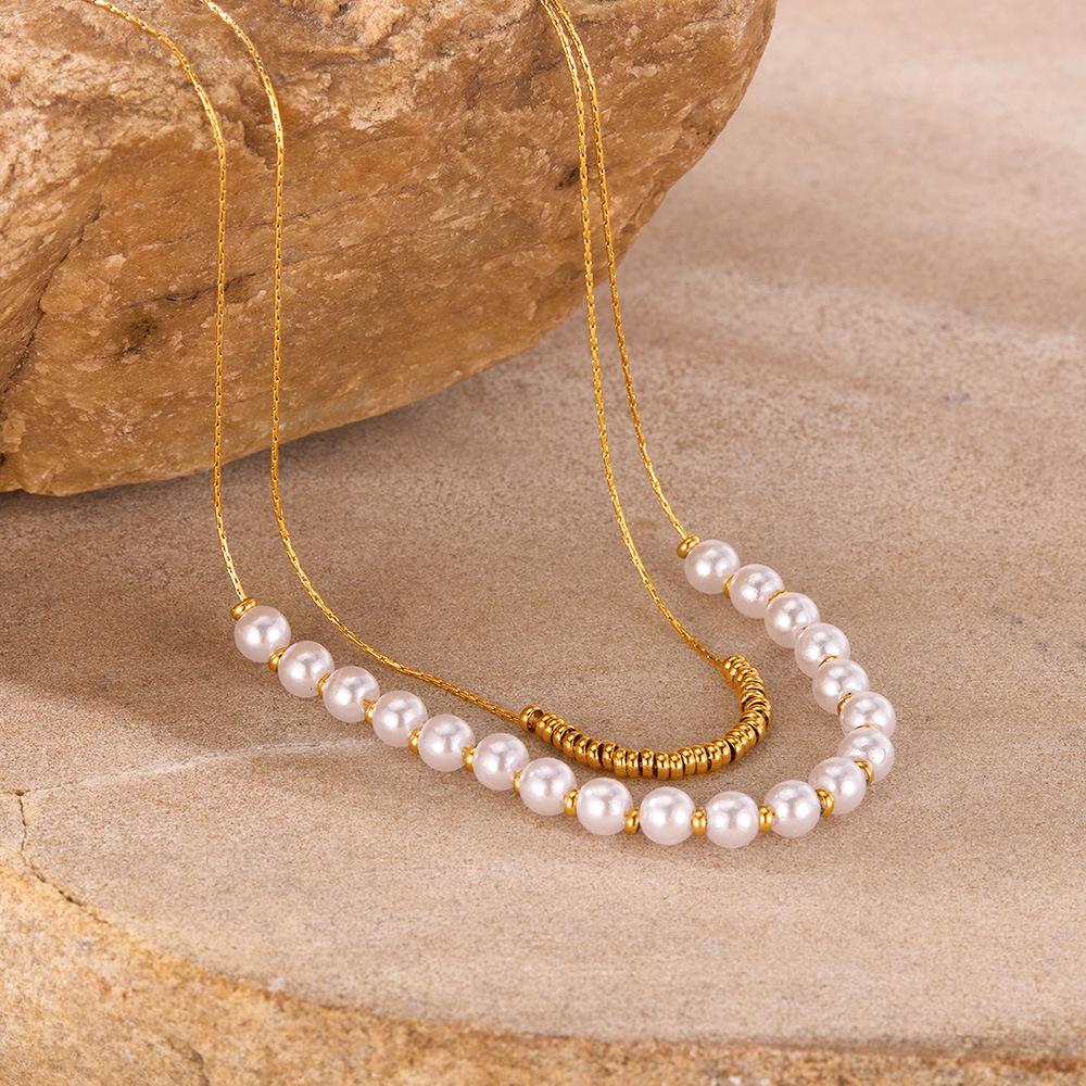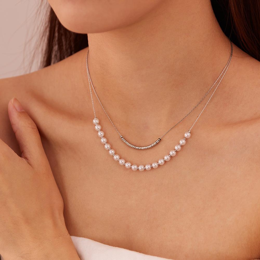 Collar de moda OPK de estilo europeo y americano para mujer, de acero inoxidable, con diseño de nicho, de doble capa, con perlas apiladas y cadena de clavícula de acero y titanio, venta al por mayor