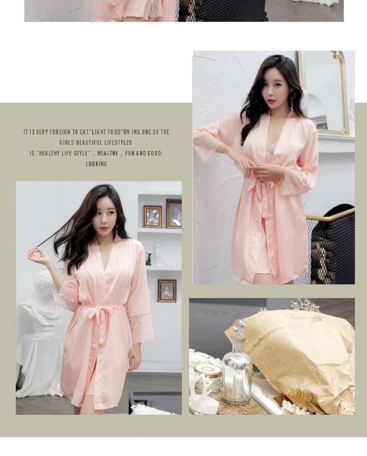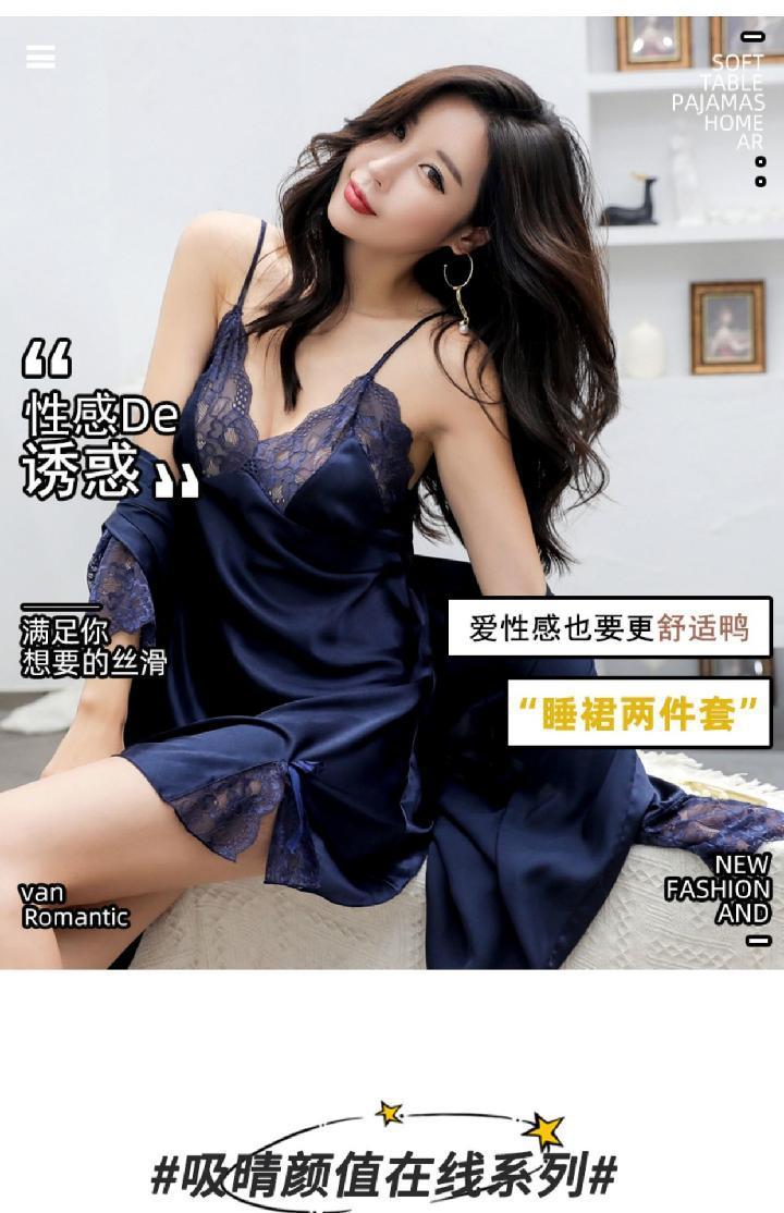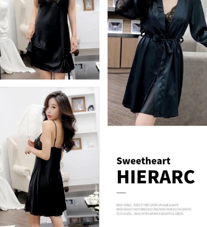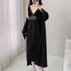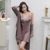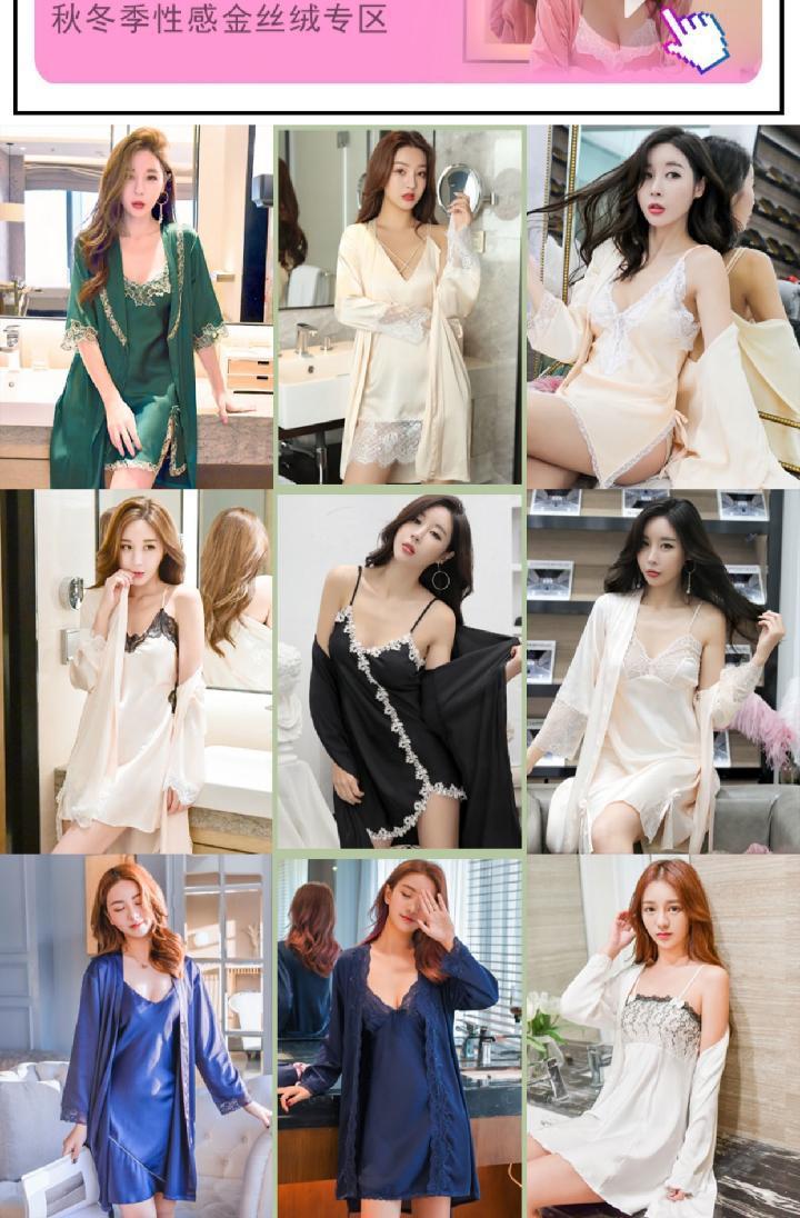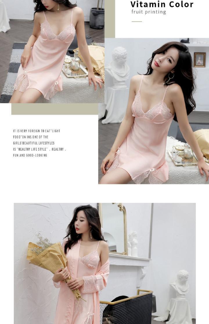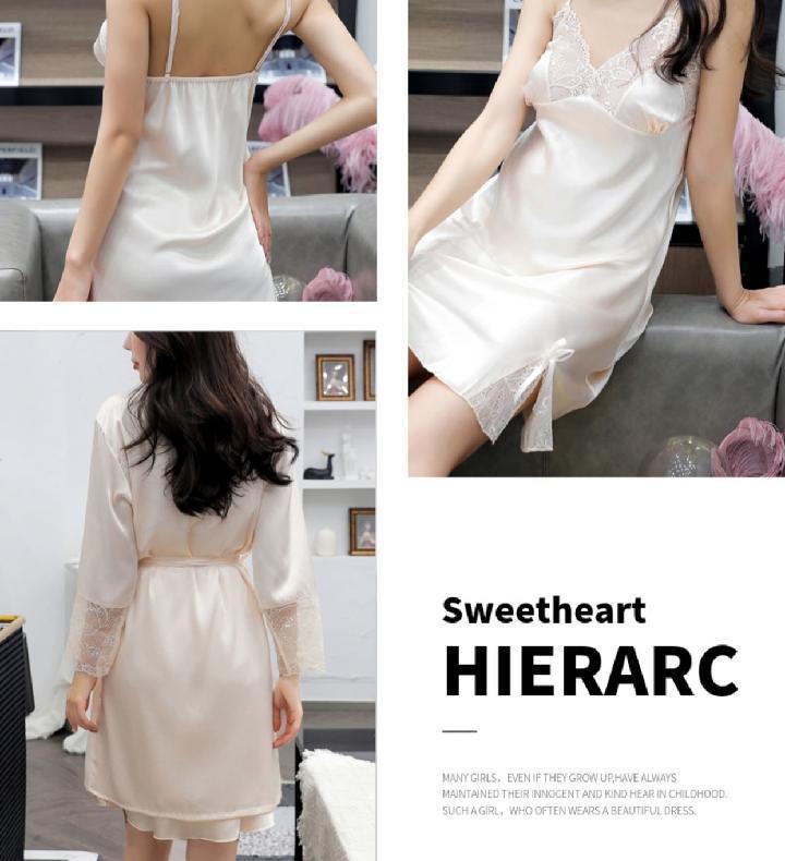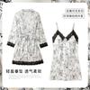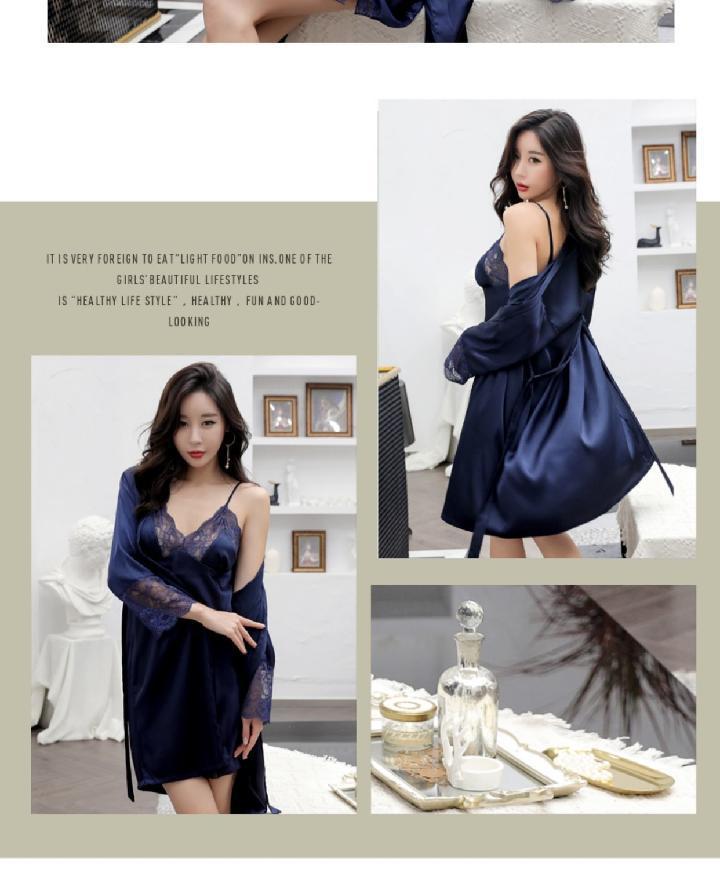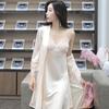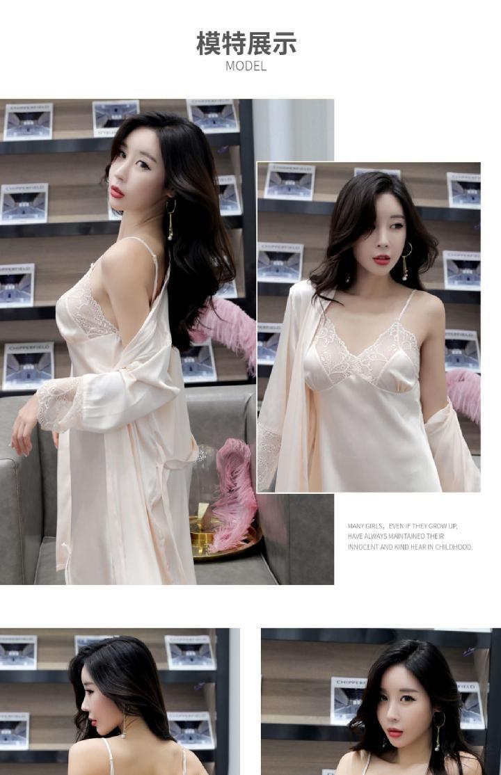 Pijamas para Mujer Verano Delgadas Seda de Hielo Sexy Tentación Encaje Primavera y Otoño Seda Camisón de Tirantes Camisón de Manga Larga Conjunto de Dos Piezas