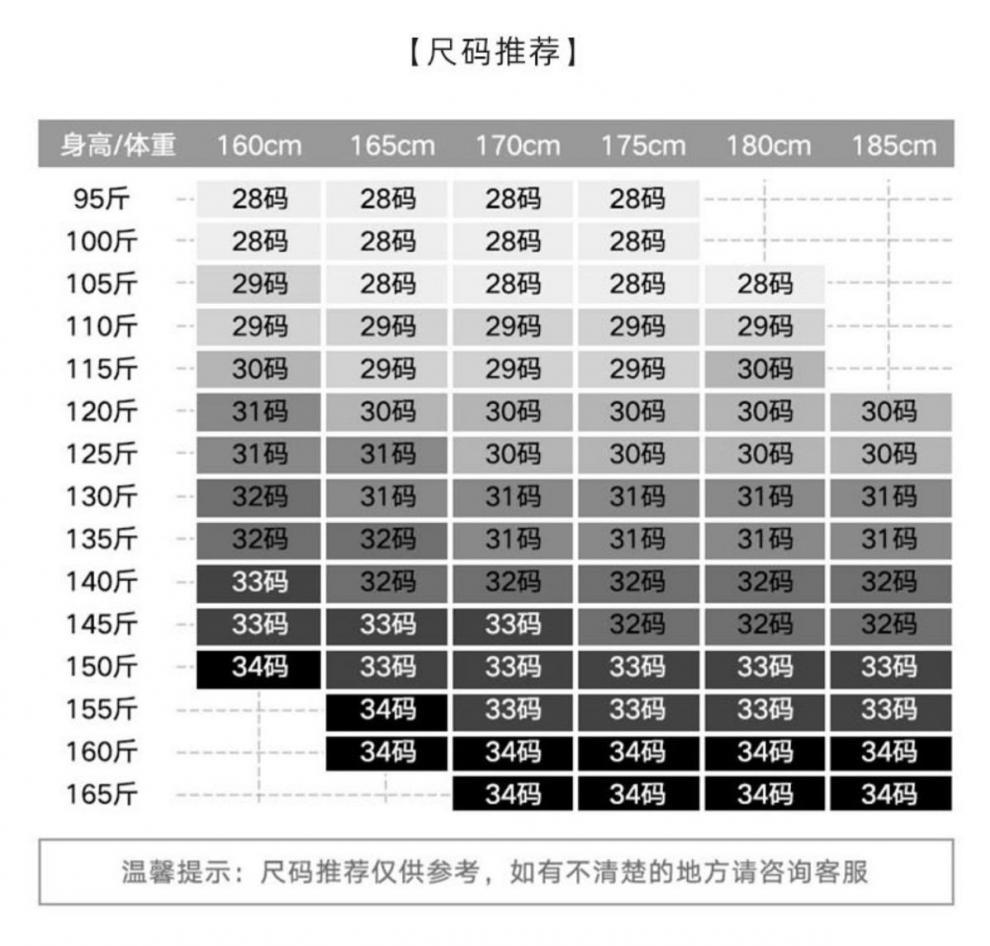 27 S code, 28 S code, 29 M code, 30 L code, 31 L code, 32 XL code, Size 33 XL, 34 size 2XL, 36 3XL code, 38 3X...