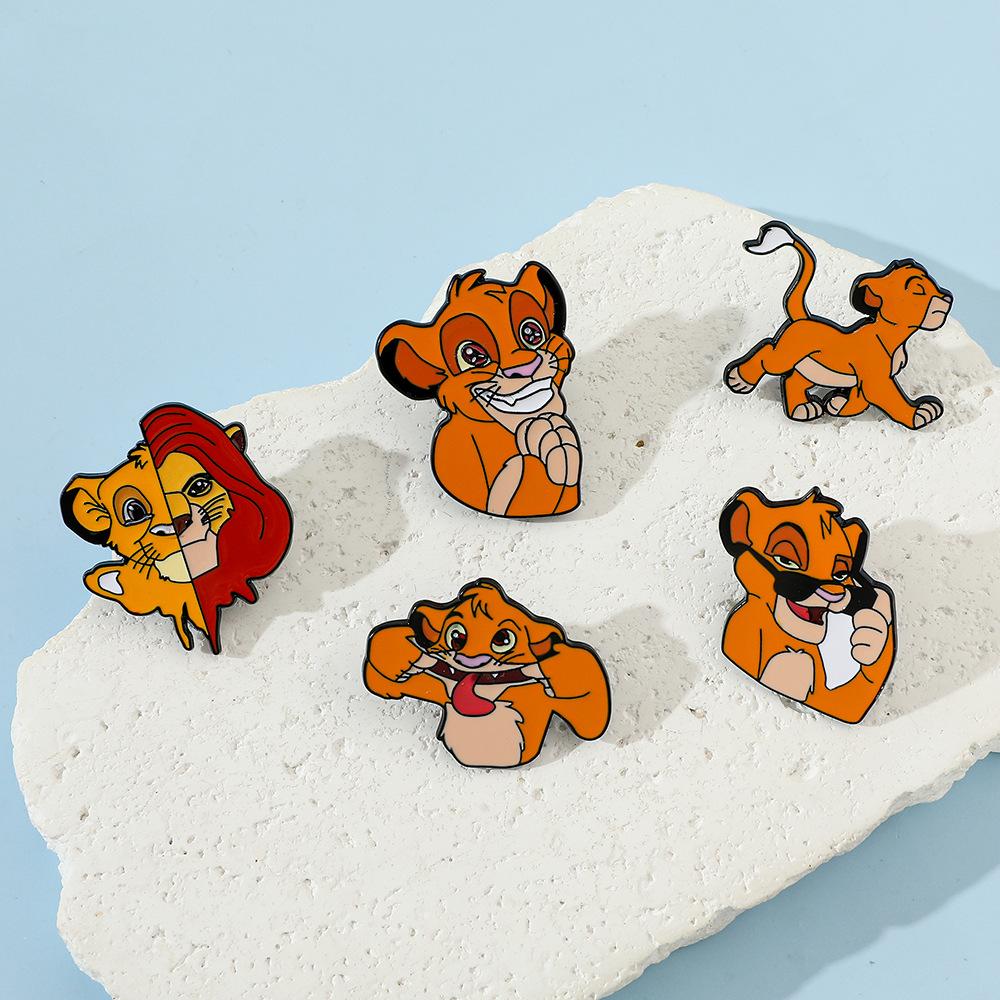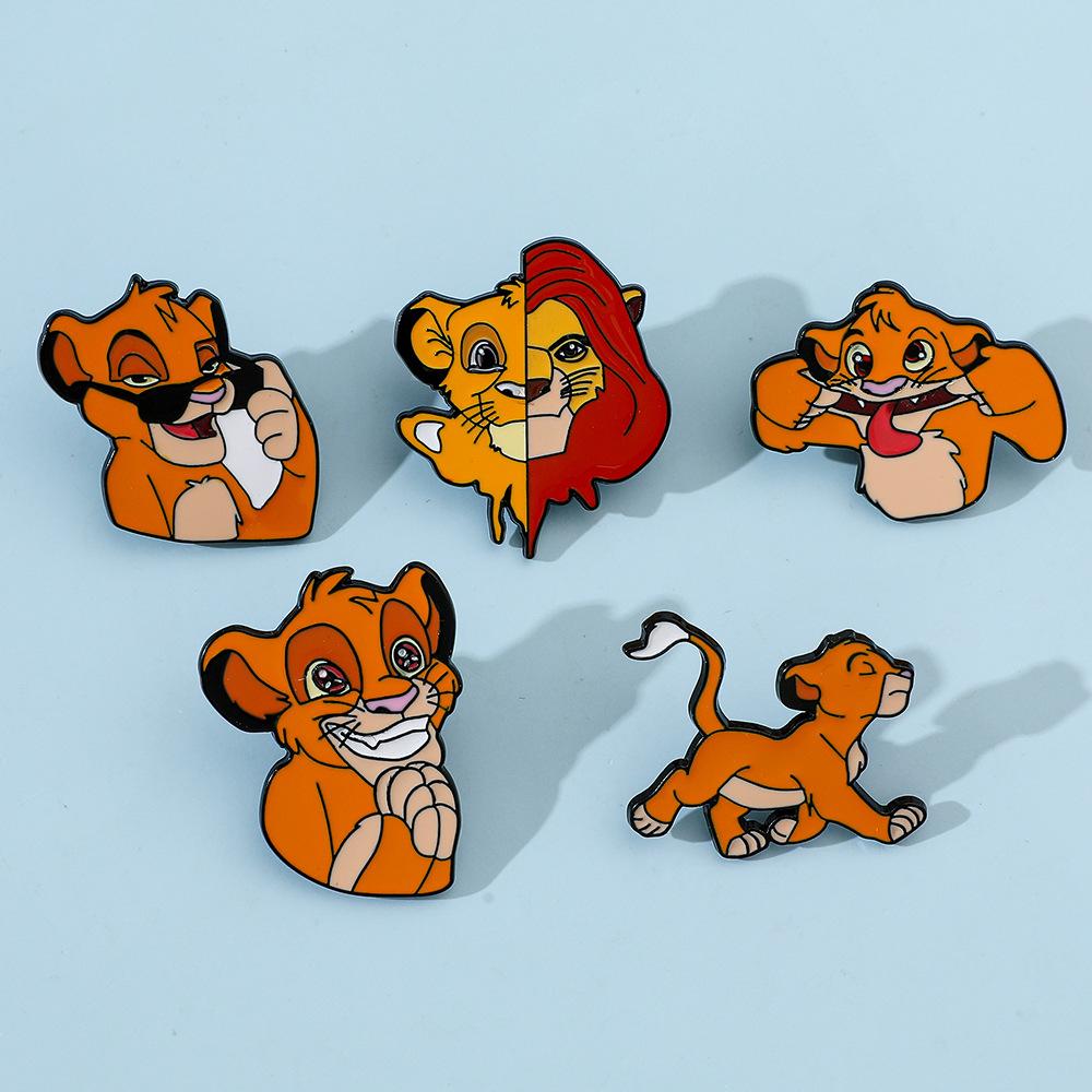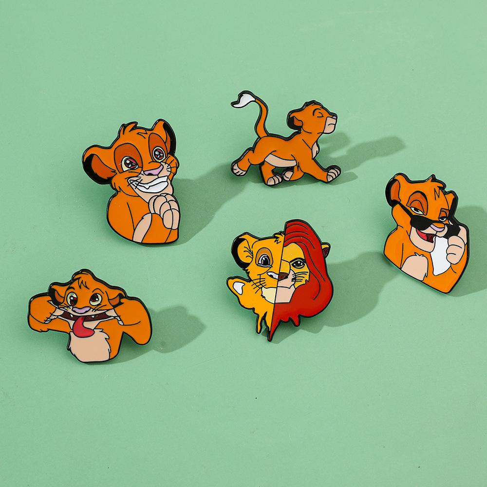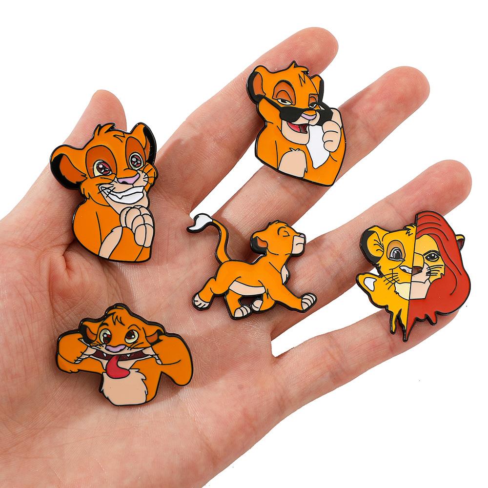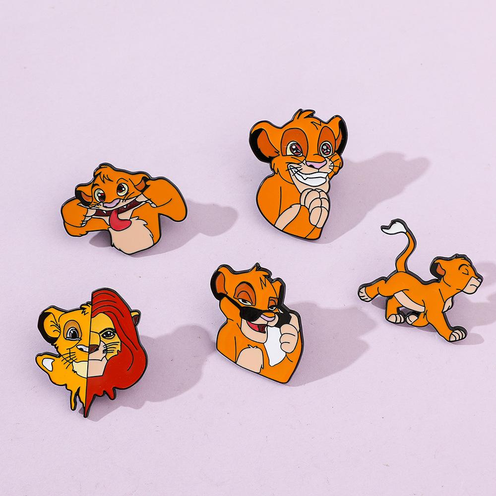 Broche de aleación con forma de gota de aceite y diseño creativo de dibujos animados europeos y americanos del Rey León, insignia de metal, León Simba