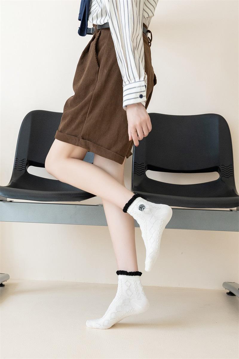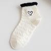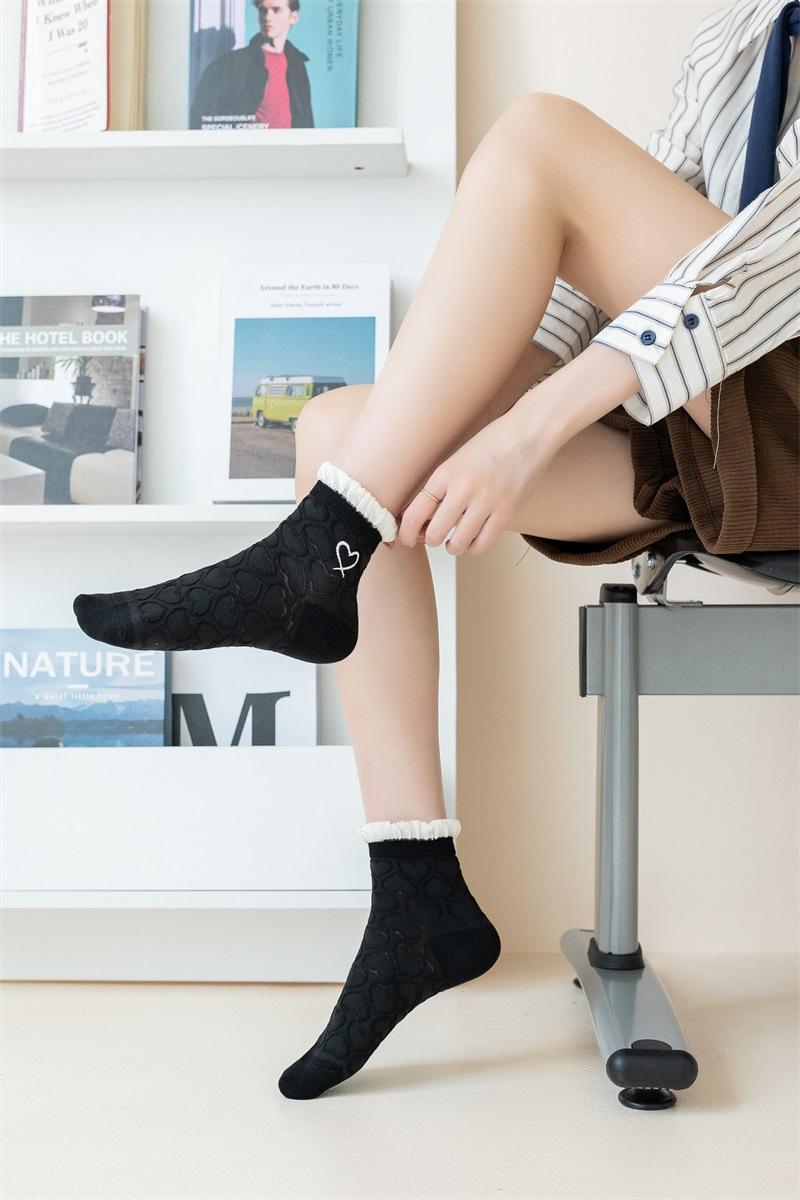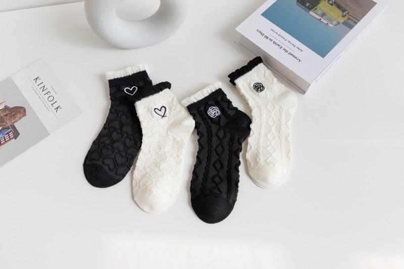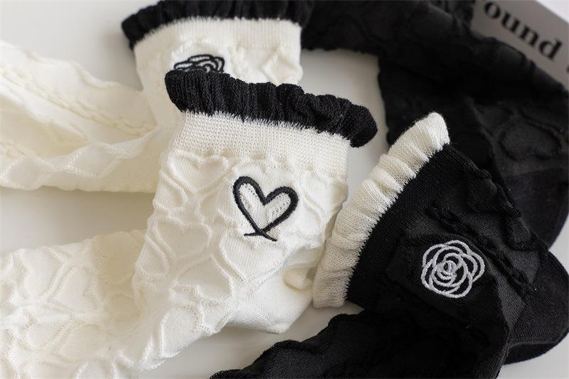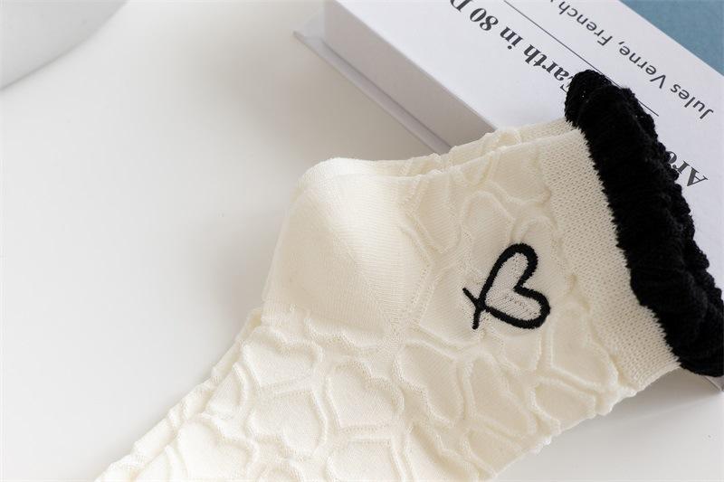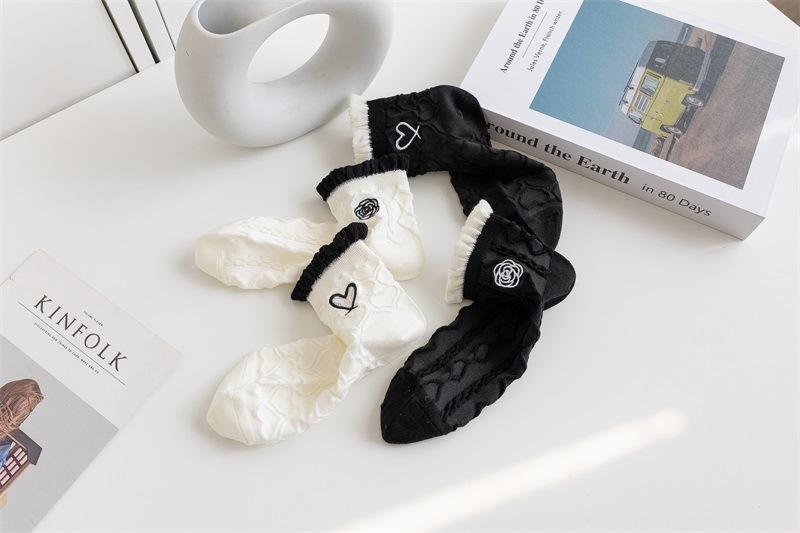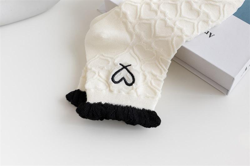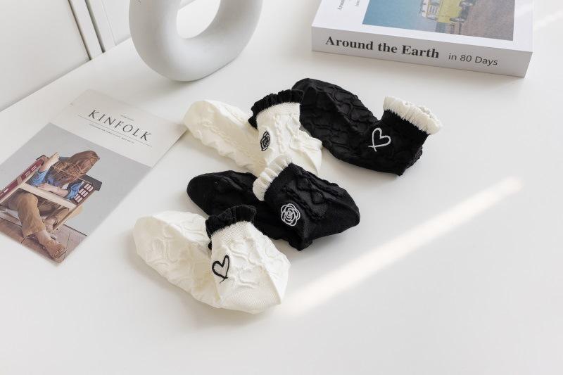 Calcetines blancos y negros para mujer, calcetines cortos, exquisitos calcetines bordados con amor dulce, calcetines de algodón con encaje para estudiantes japoneses de primavera y verano.