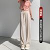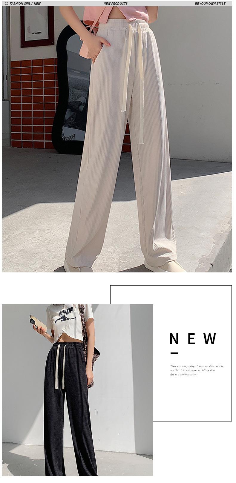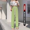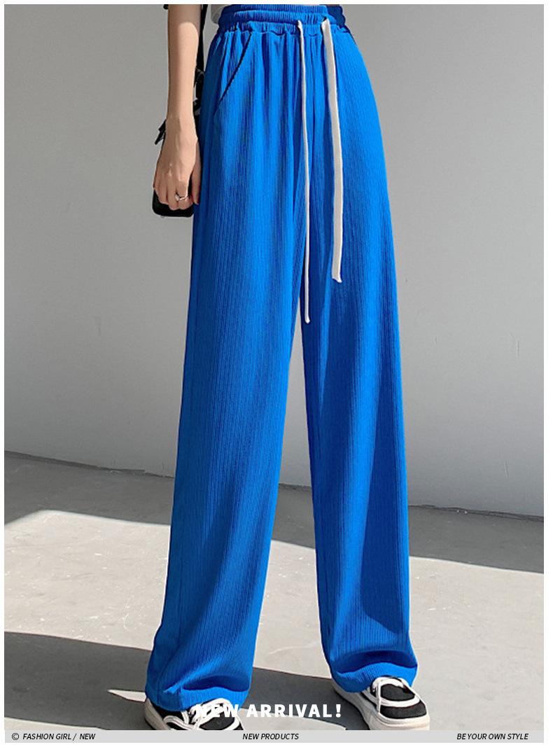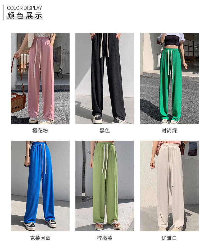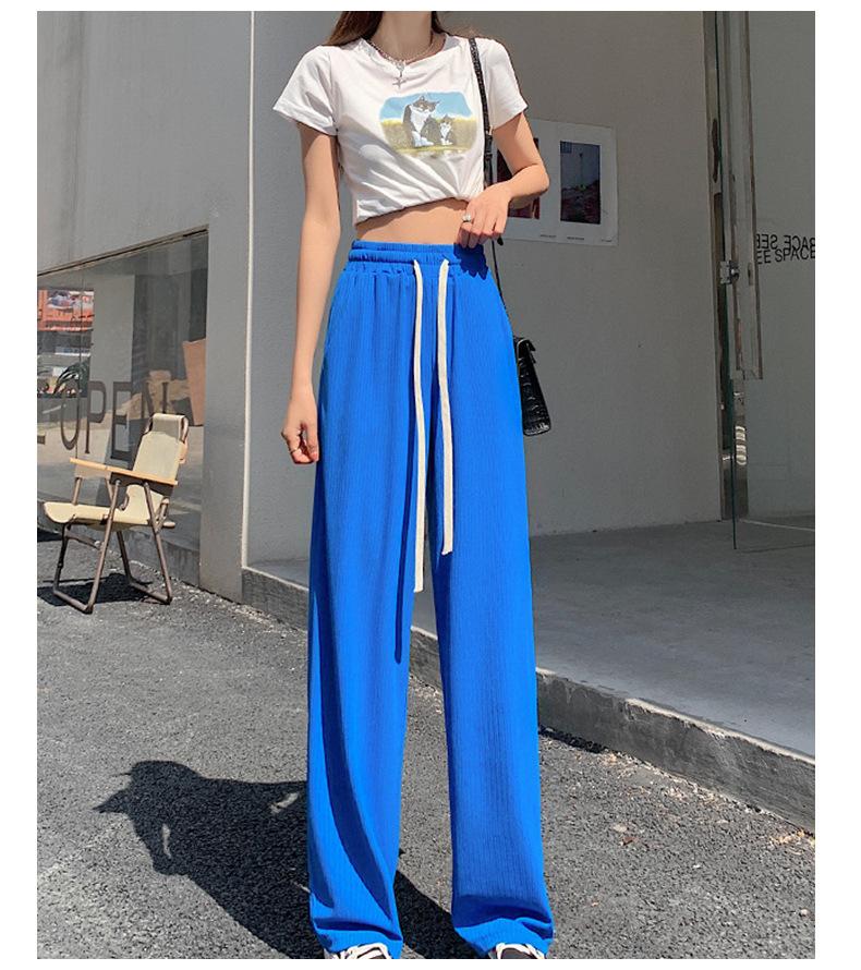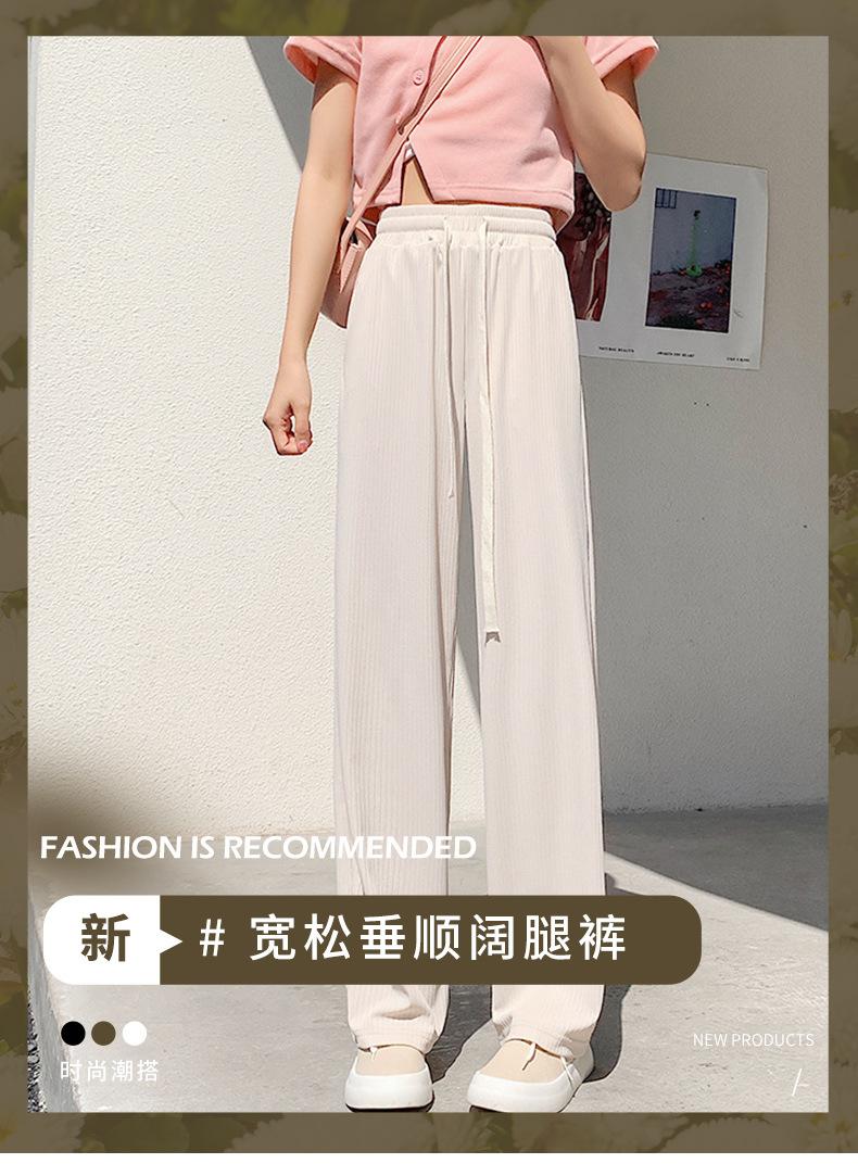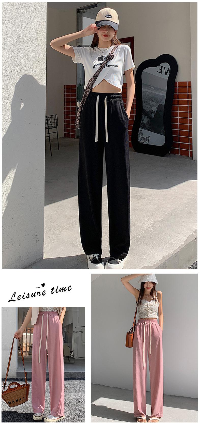 Pantalones casuales de seda de hielo rectos con cintura holgada y cuerda para mujer, pantalones deportivos de cintura alta y pierna ancha de verano