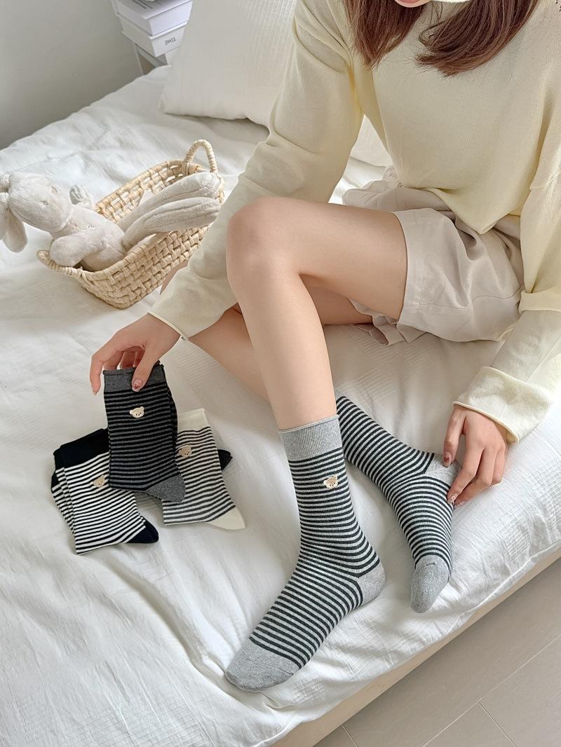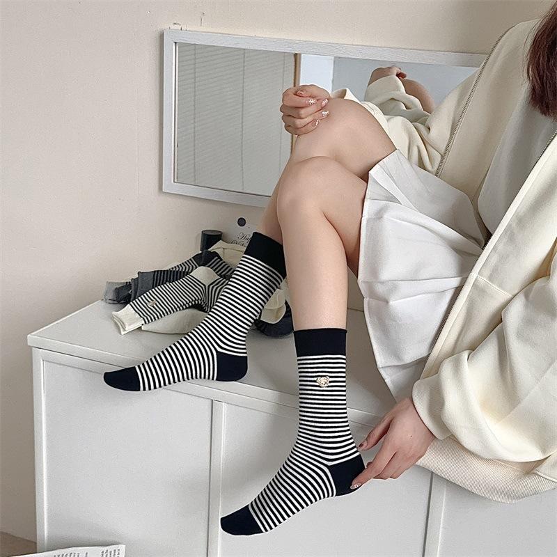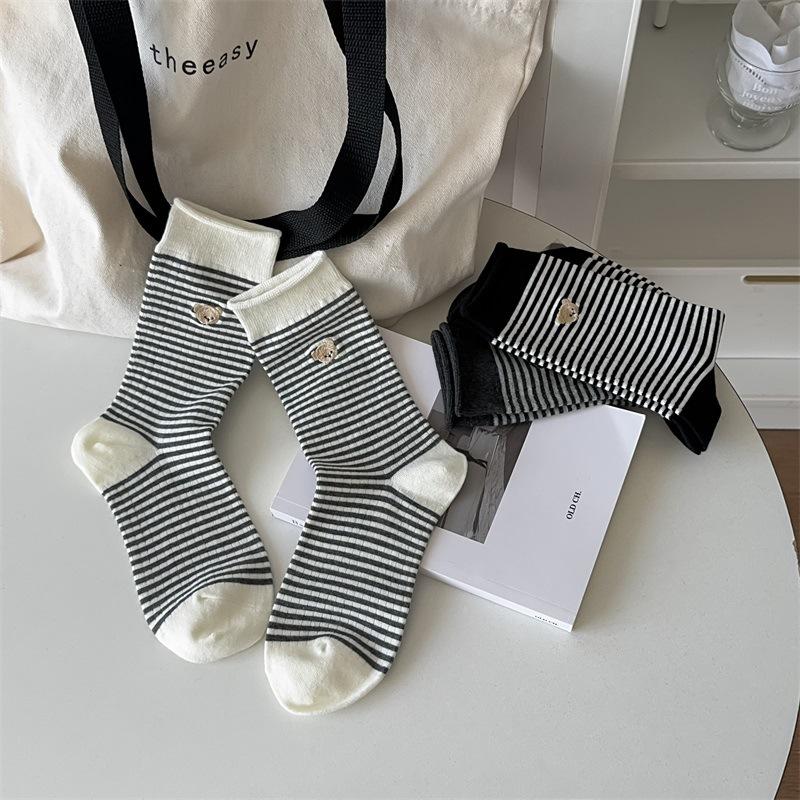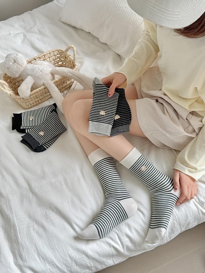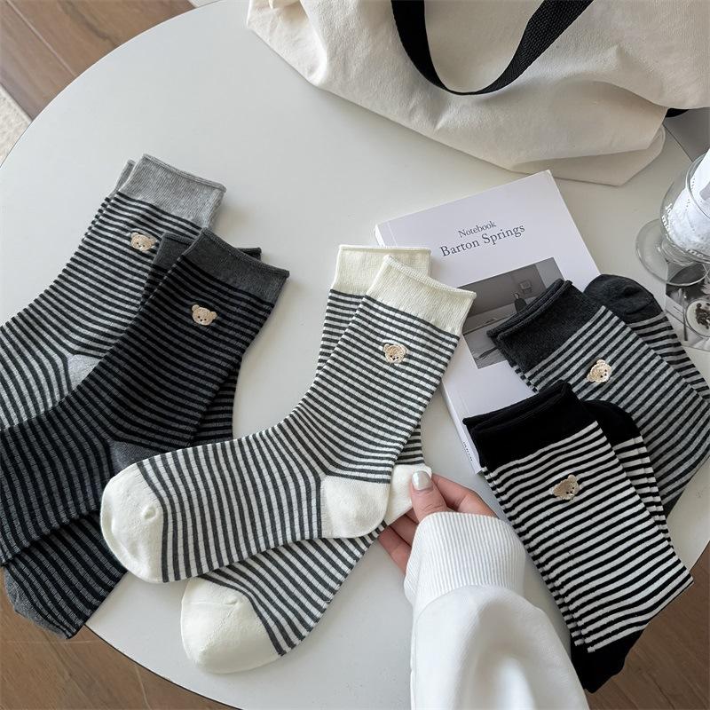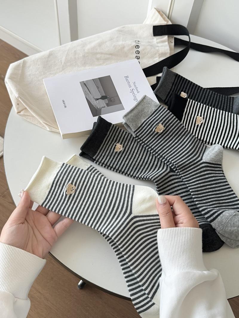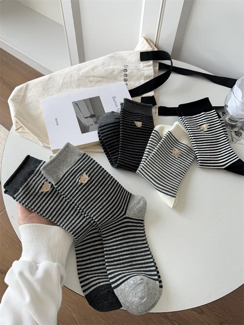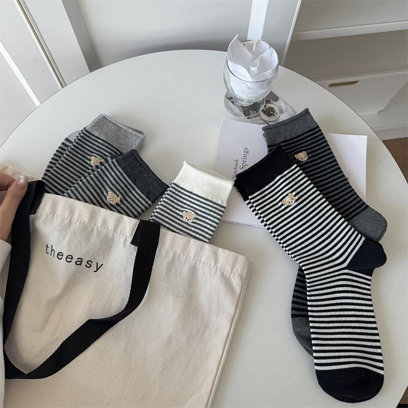 Calcetines 2024 Calcetines de Otoño e Invierno de Media Caña Calcetines de Algodón Enrollables a Rayas Apilados Calcetines Bordados con Oso Calcetines Artísticos Japoneses