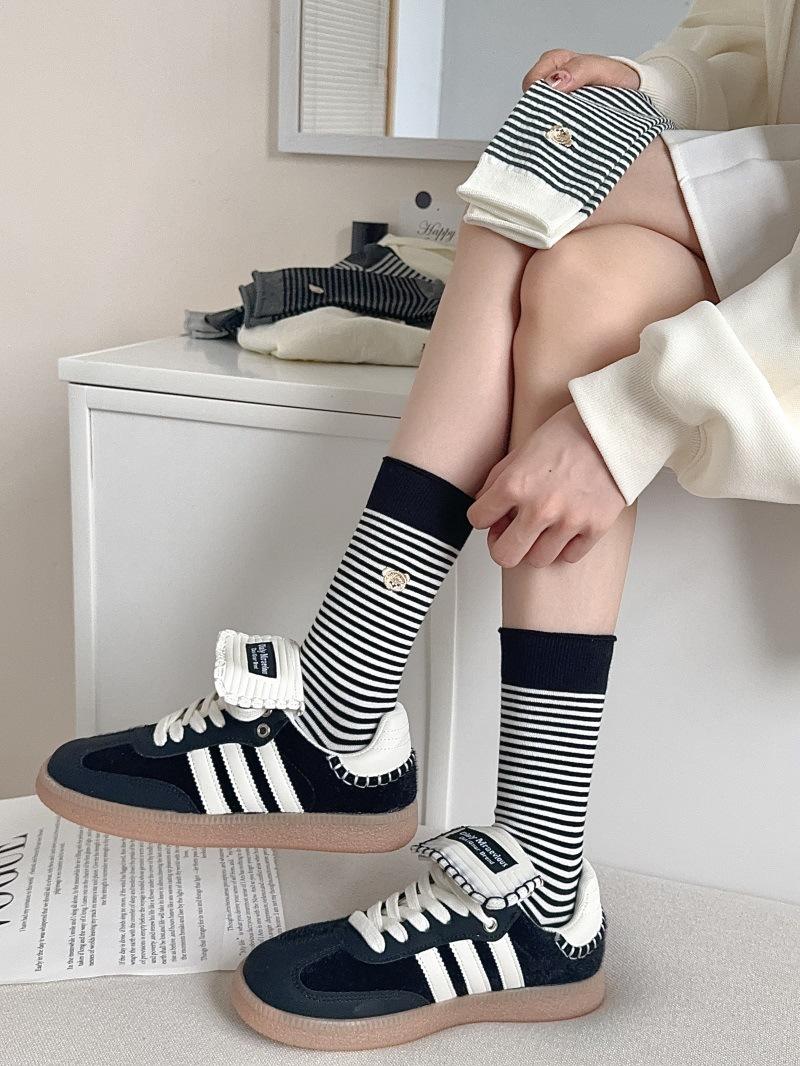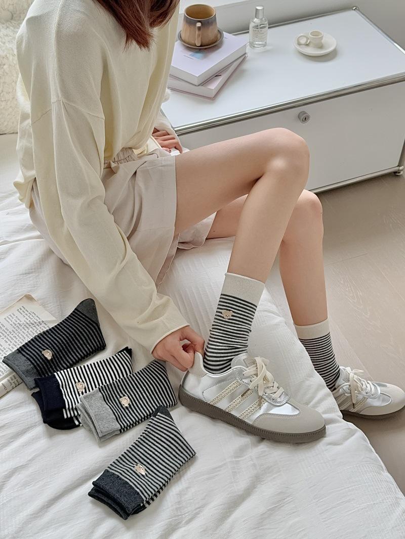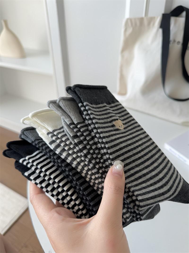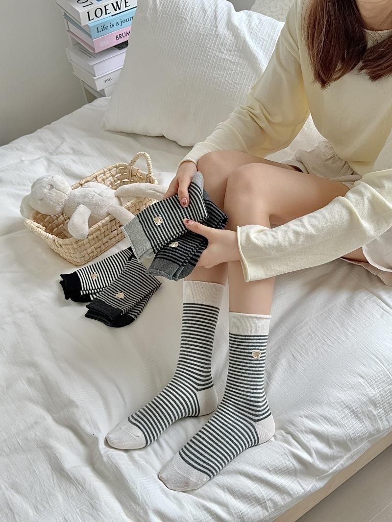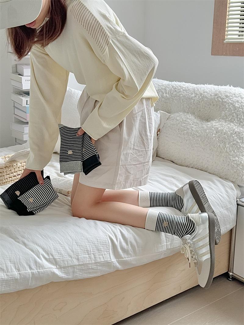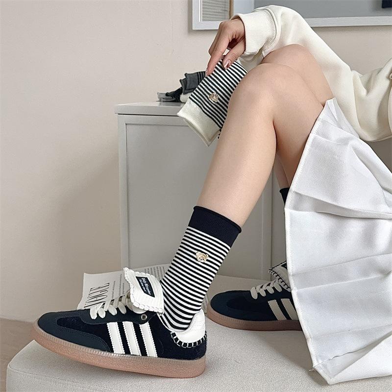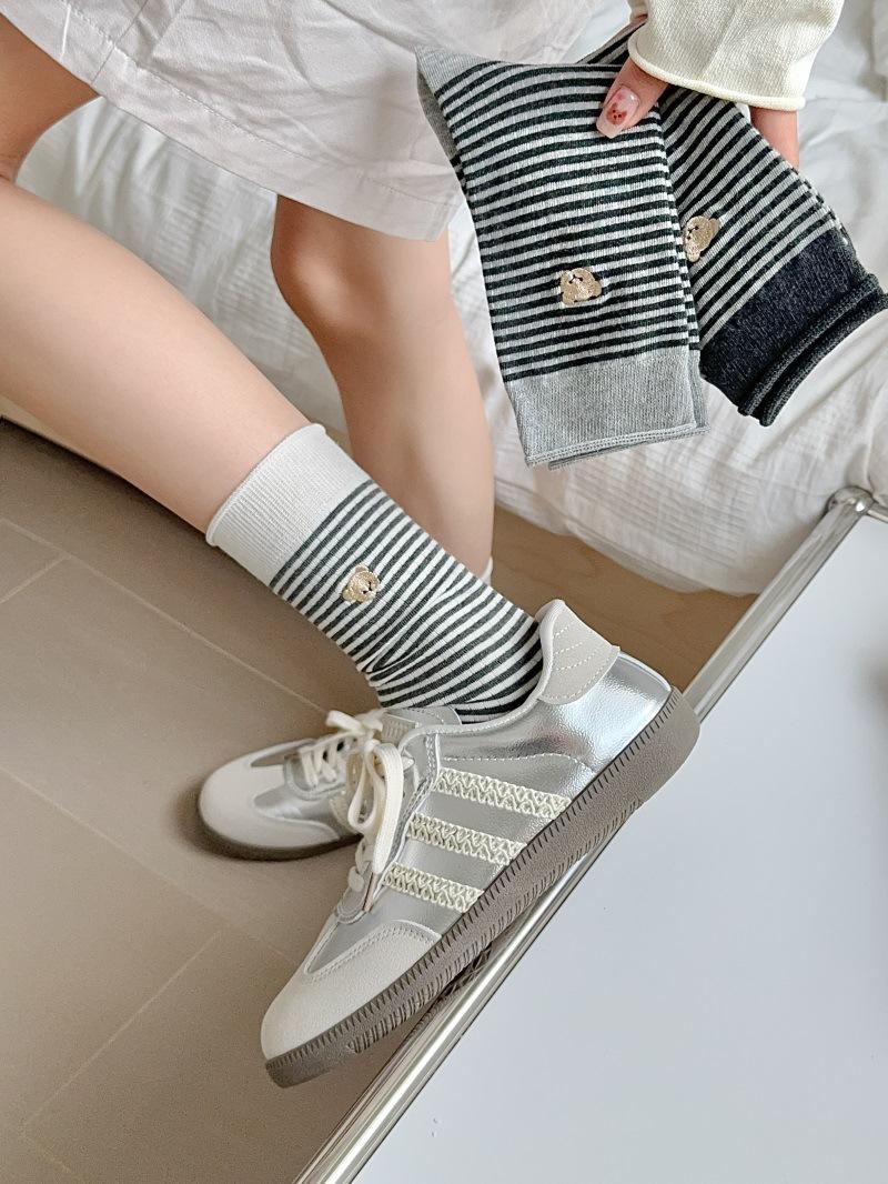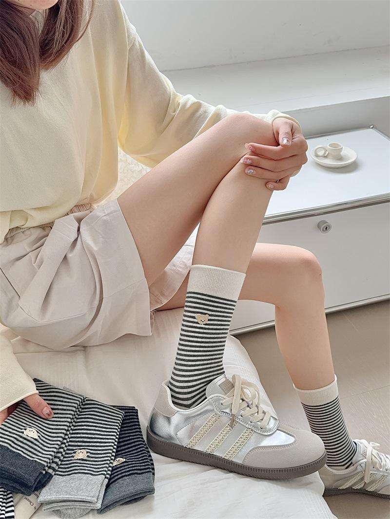 Calcetines 2024 Calcetines de Otoño e Invierno de Media Caña Calcetines de Algodón Enrollables a Rayas Apilados Calcetines Bordados con Oso Calcetines Artísticos Japoneses