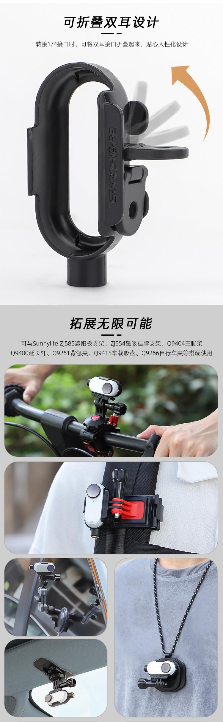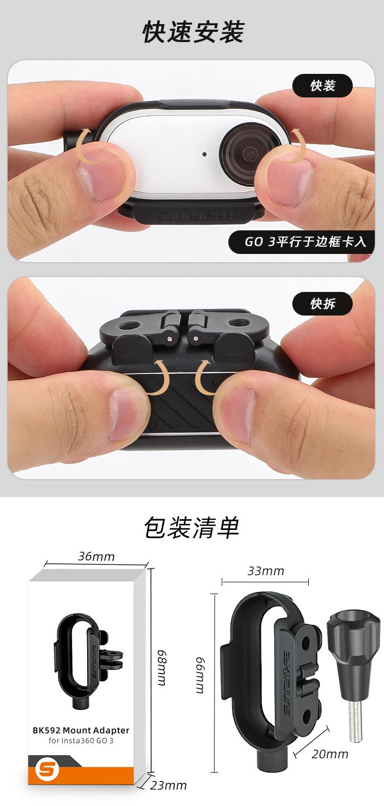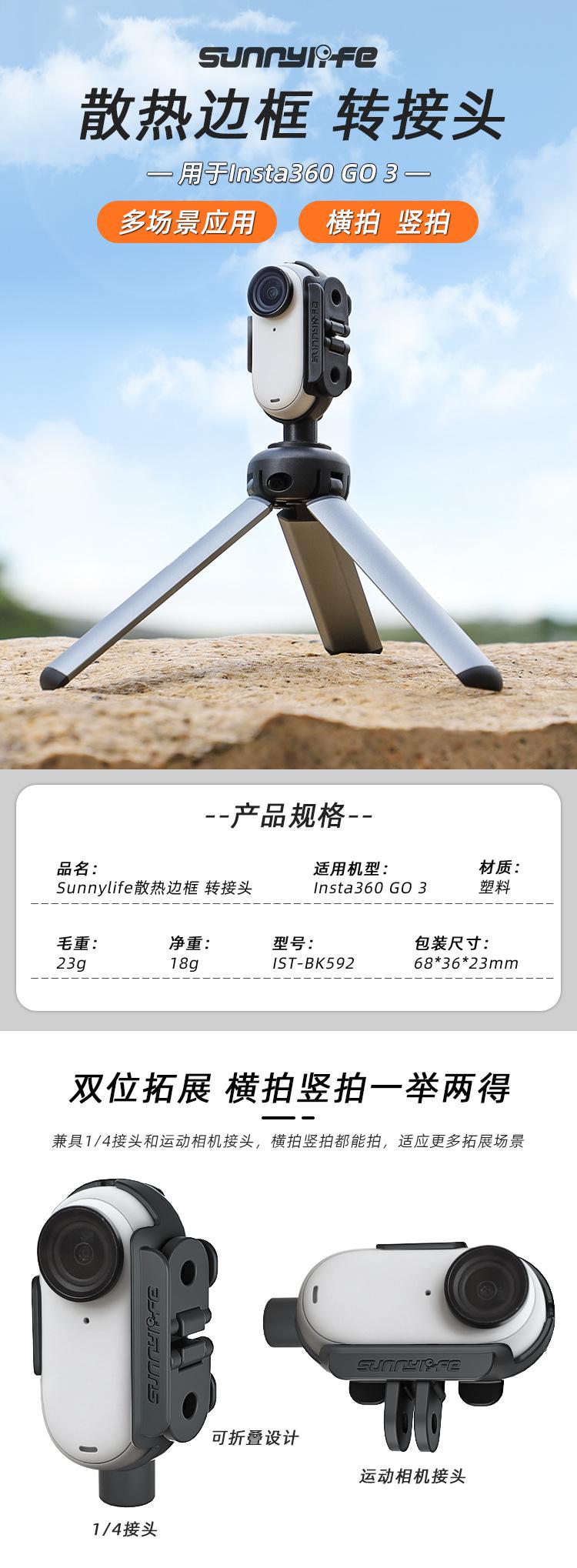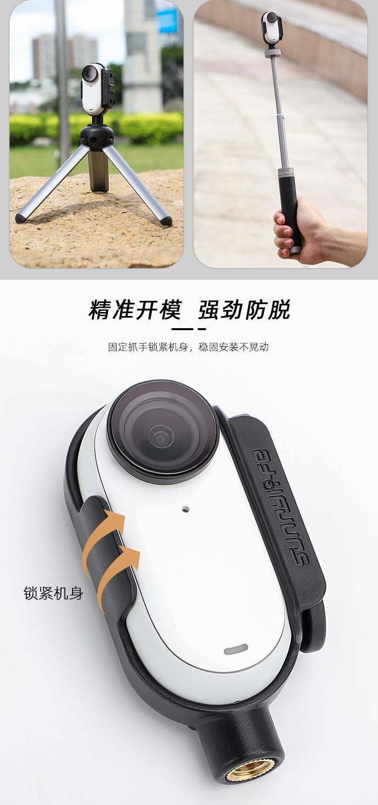 Aplicable a la cámara deportiva de pulgar insta360 GO3, el producto tiene interfaz 1/4 e interfaz estándar de dos clavijas GOPRO. El producto es más conveniente para conectar a trípodes, palos para selfies y otros equipos. Características: