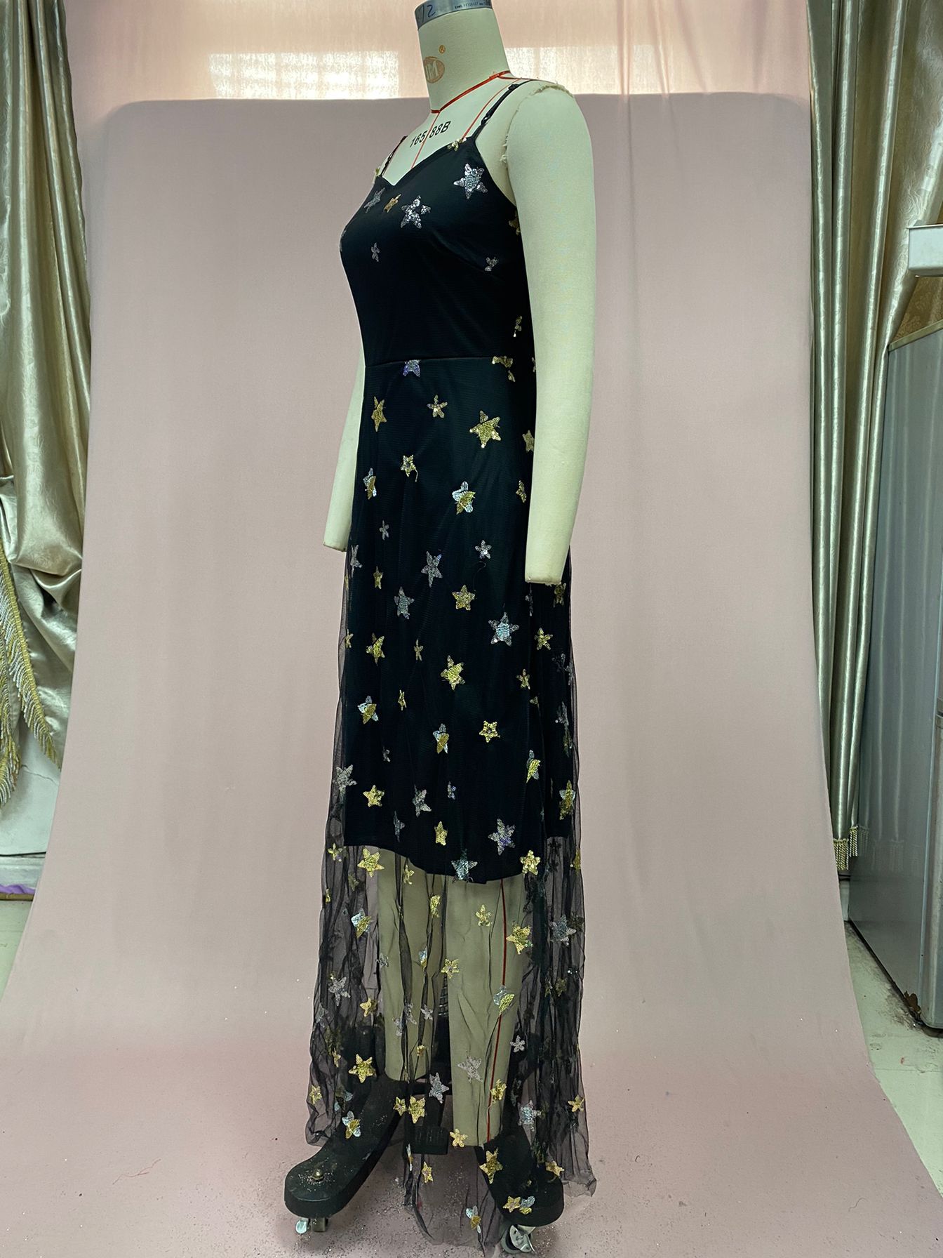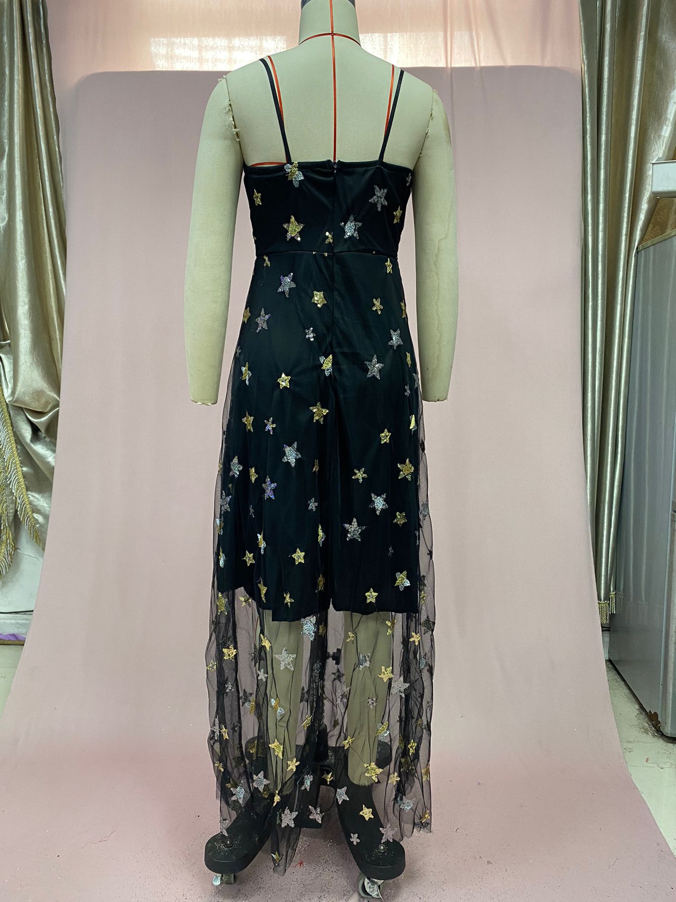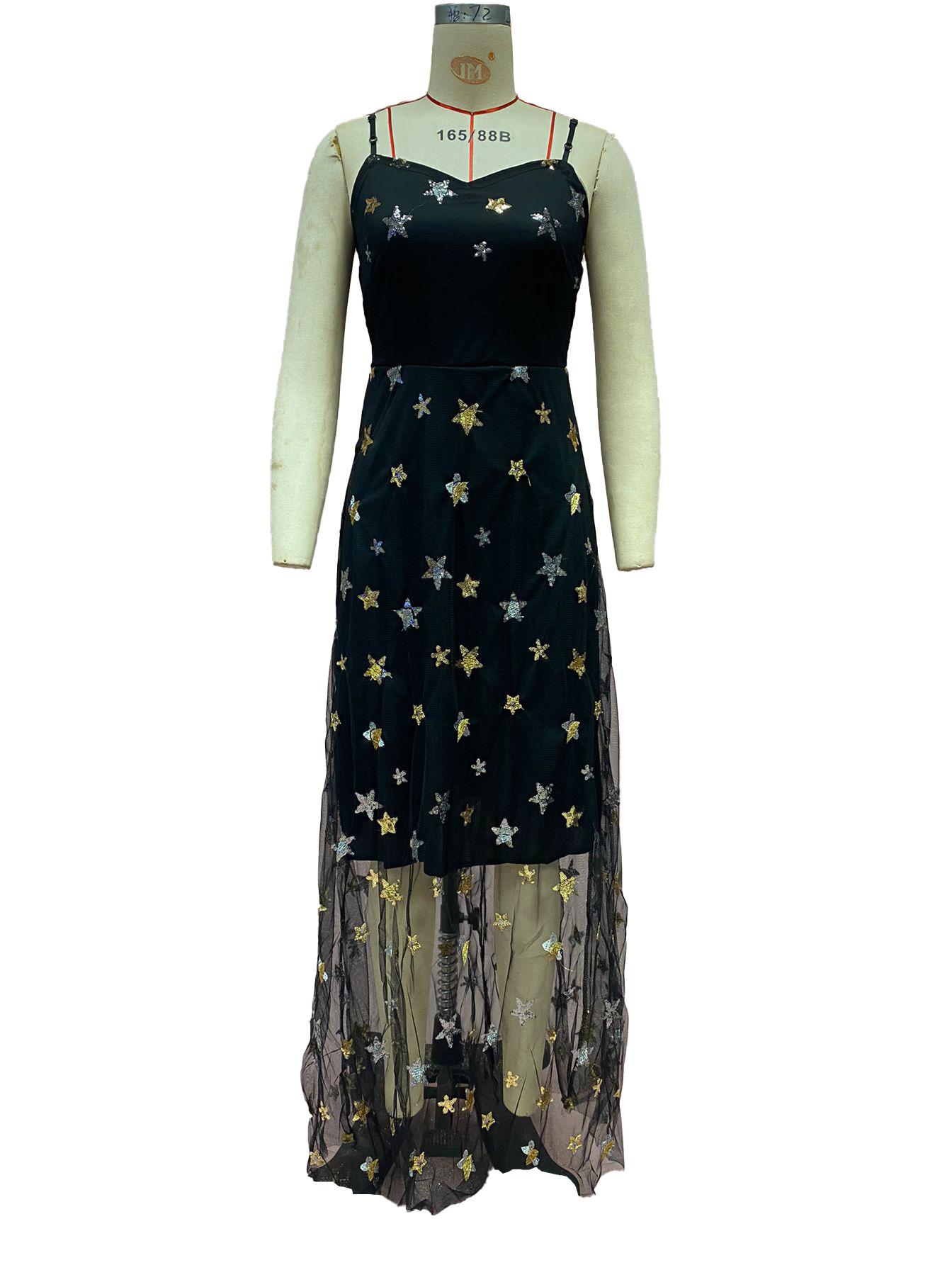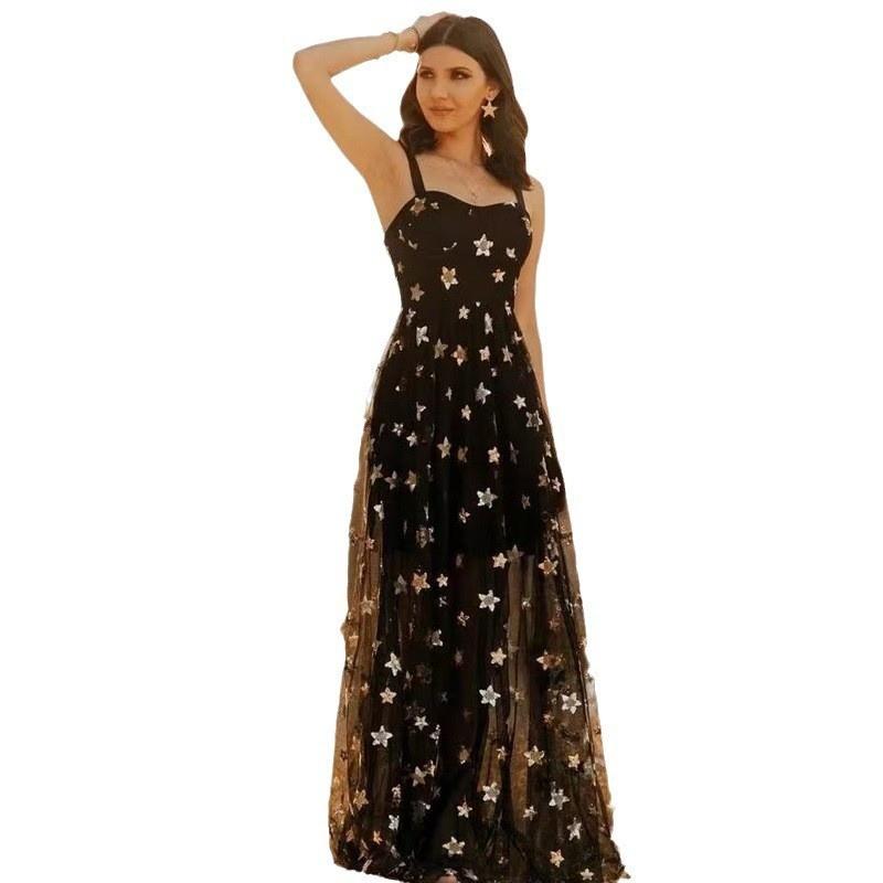 2025 Verano Nuevo Ropa de Mujer de Exportación Europea y Americana Ebay Vestido Transparente de Malla con Tirantes de Estrella de Cinco Puntas Falda Larga Elegante