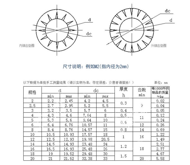 M3 (external tooth), M4 (external tooth), M5 (external teeth), M6 (external tooth), M8 (external teeth), M10 (...