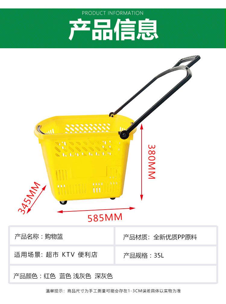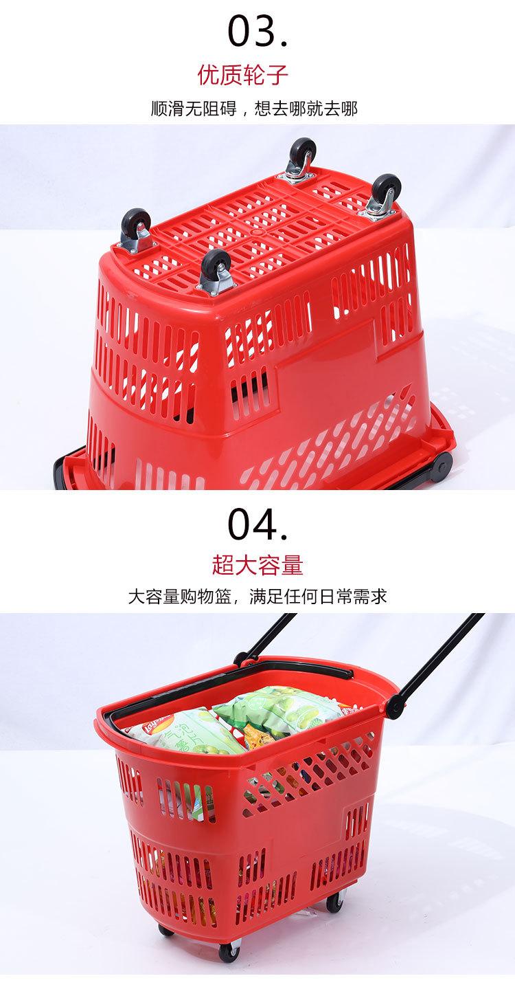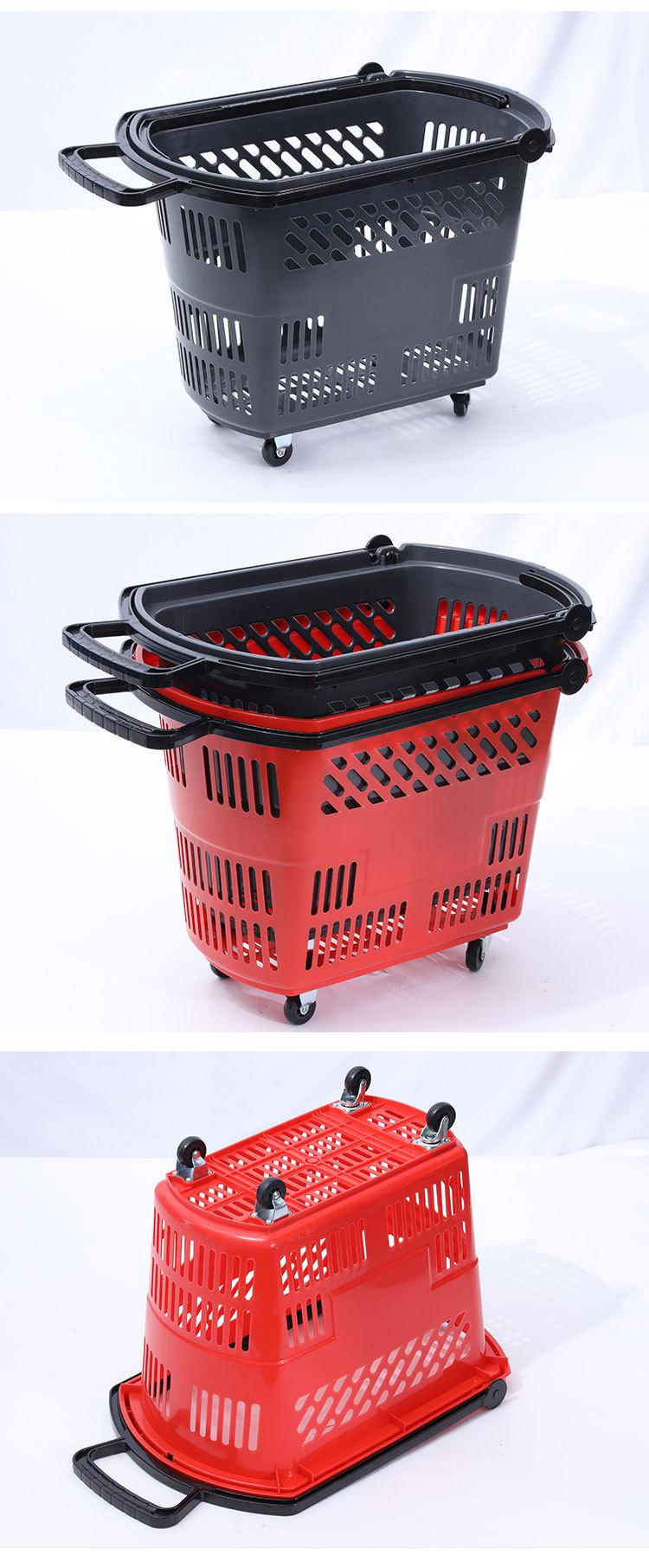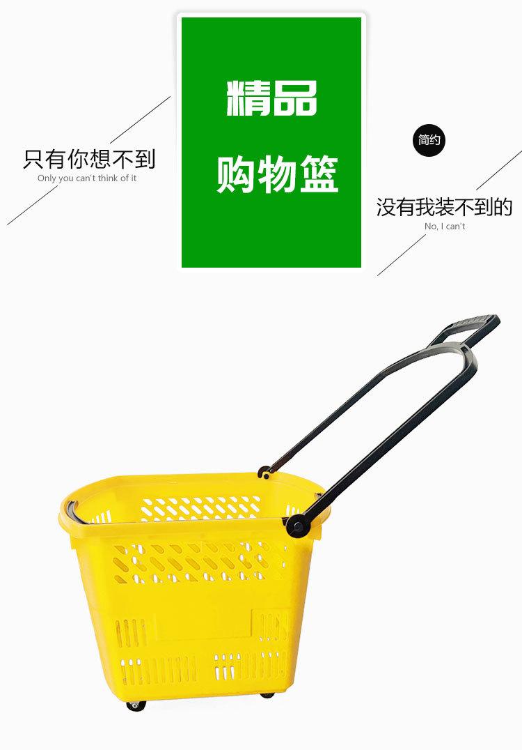 Cesta de compras de plástico amarilla para supermercado, carrito de cuatro ruedas, 45L, venta al por mayor