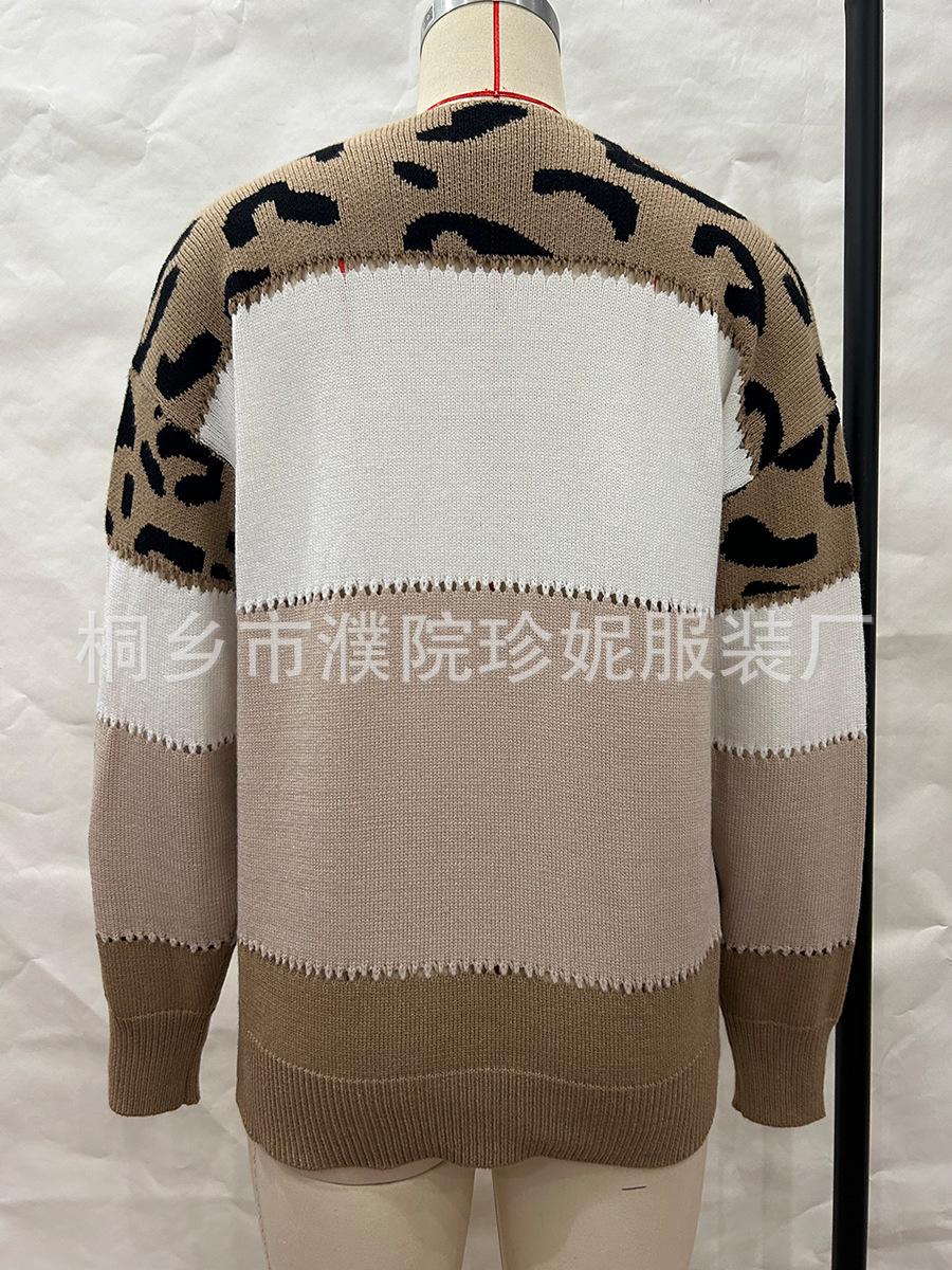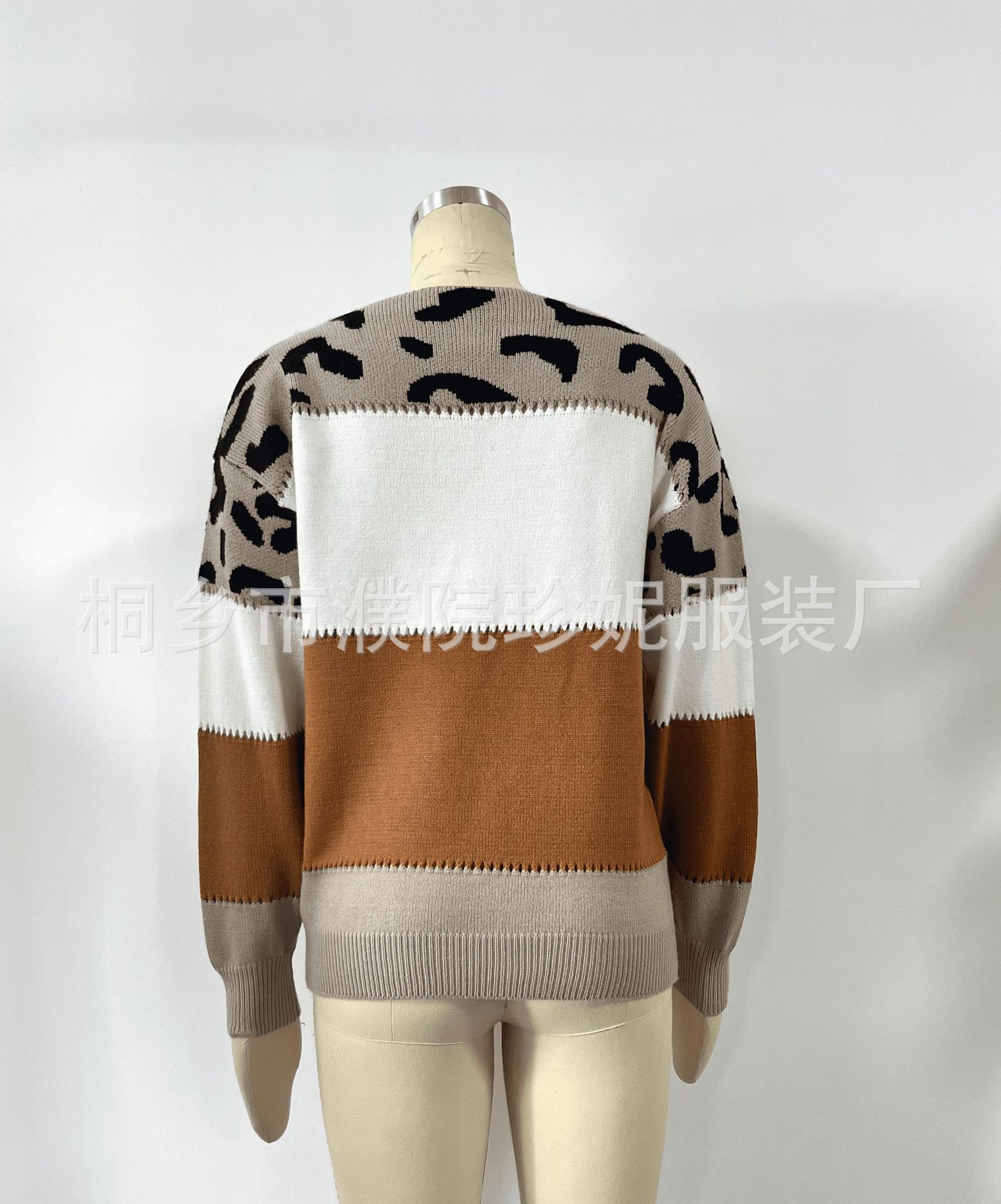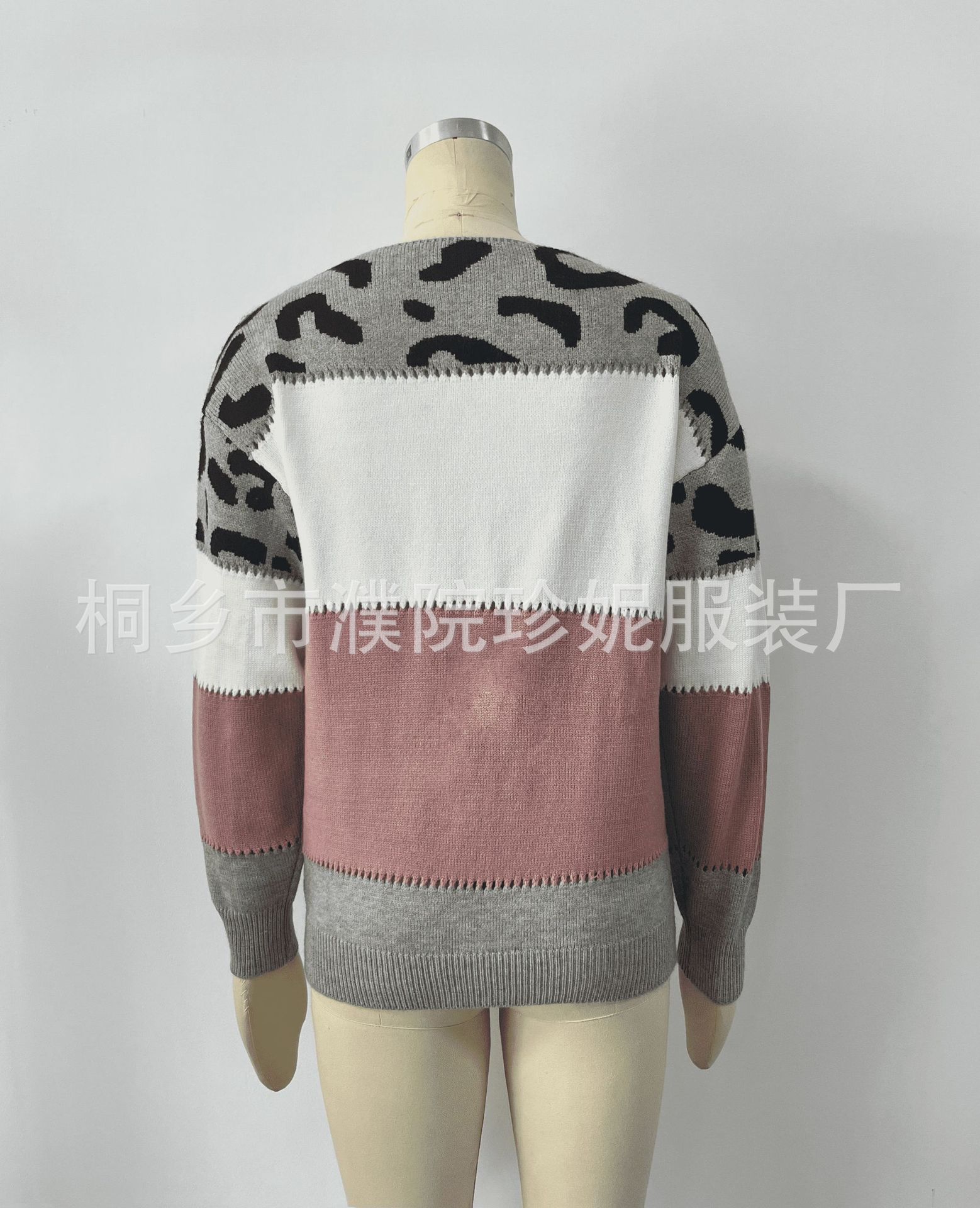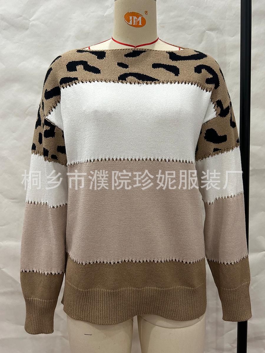 Suéter Casual de Punto de Bloque de Color con Estampado de Leopardo Otoño e Invierno Nuevo Punto para Mujer Transfronterizo Suéter para Mujer Camisa Básica de Manga Larga