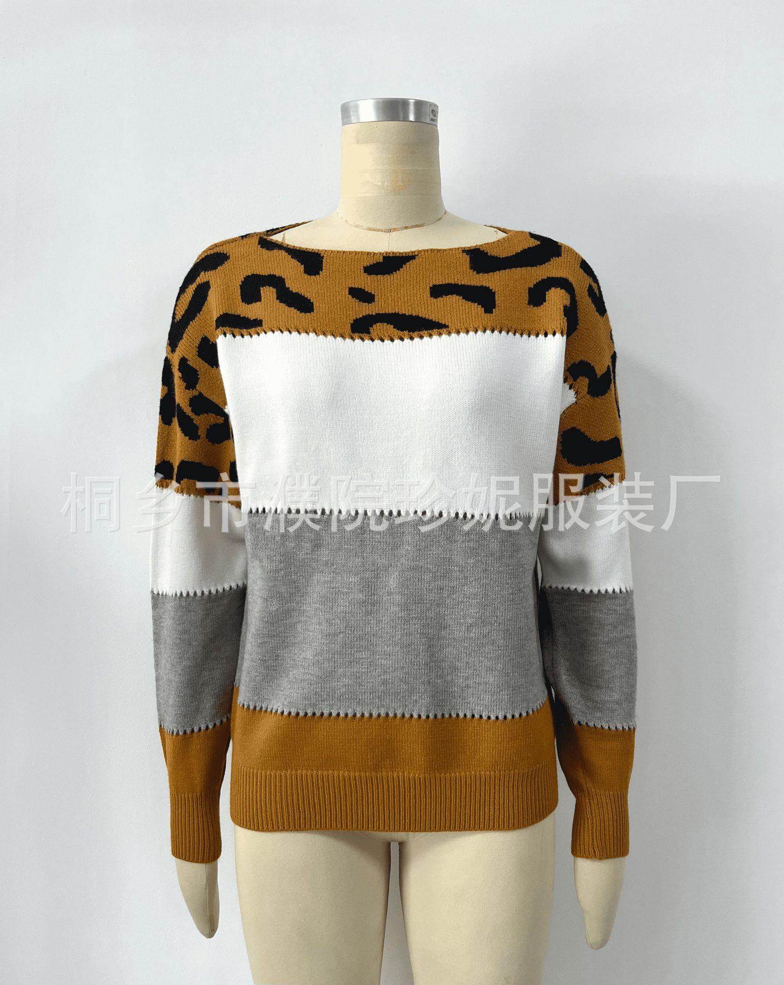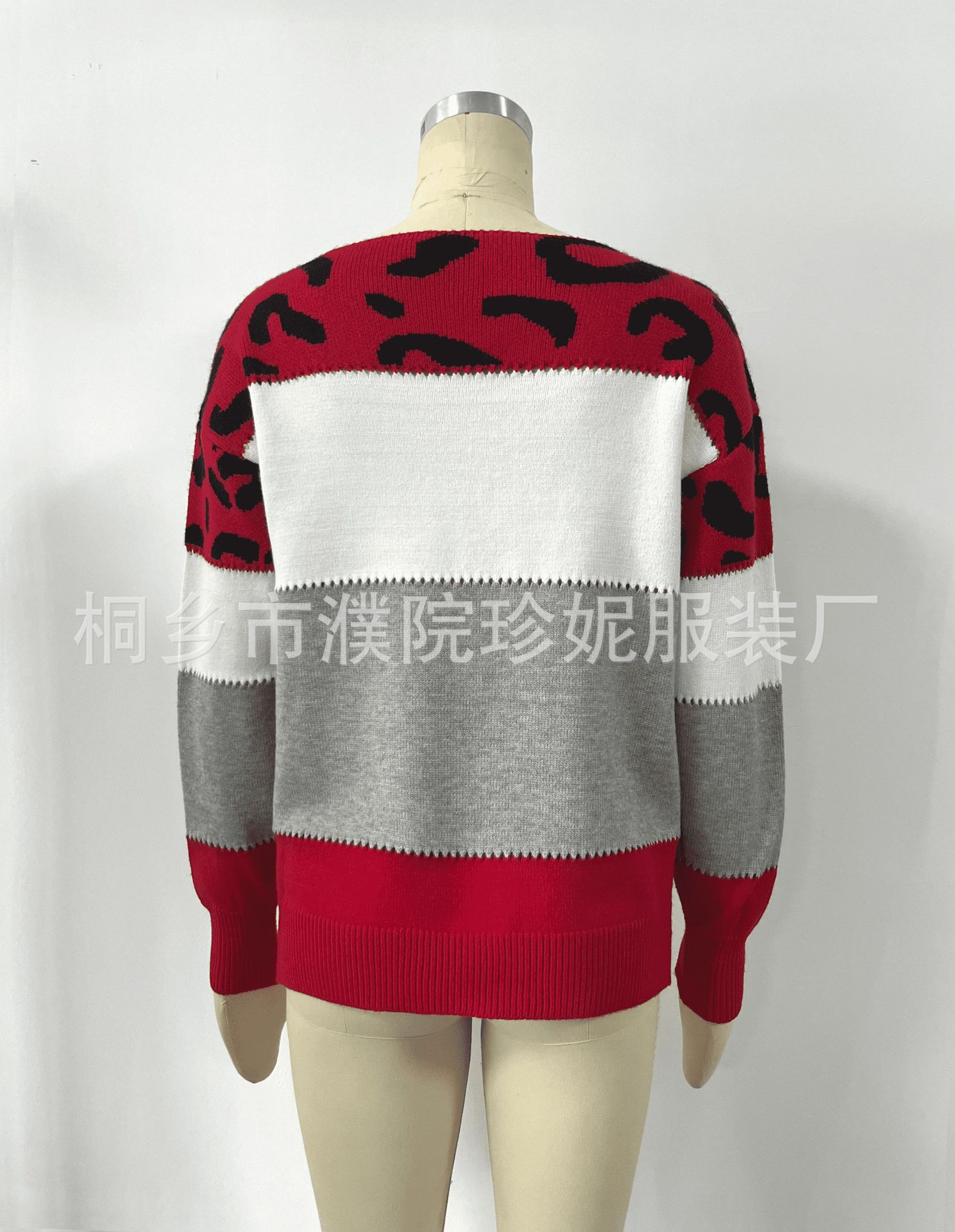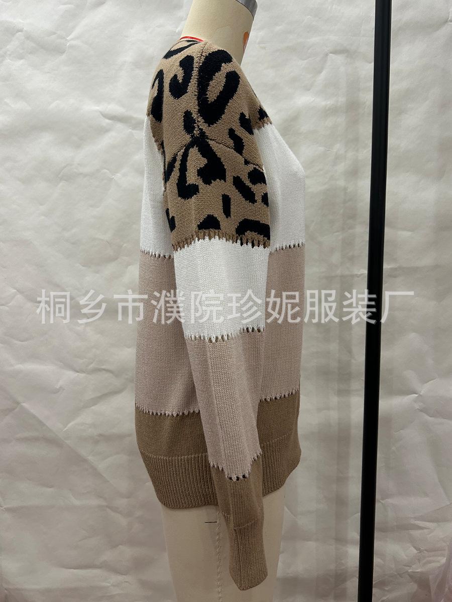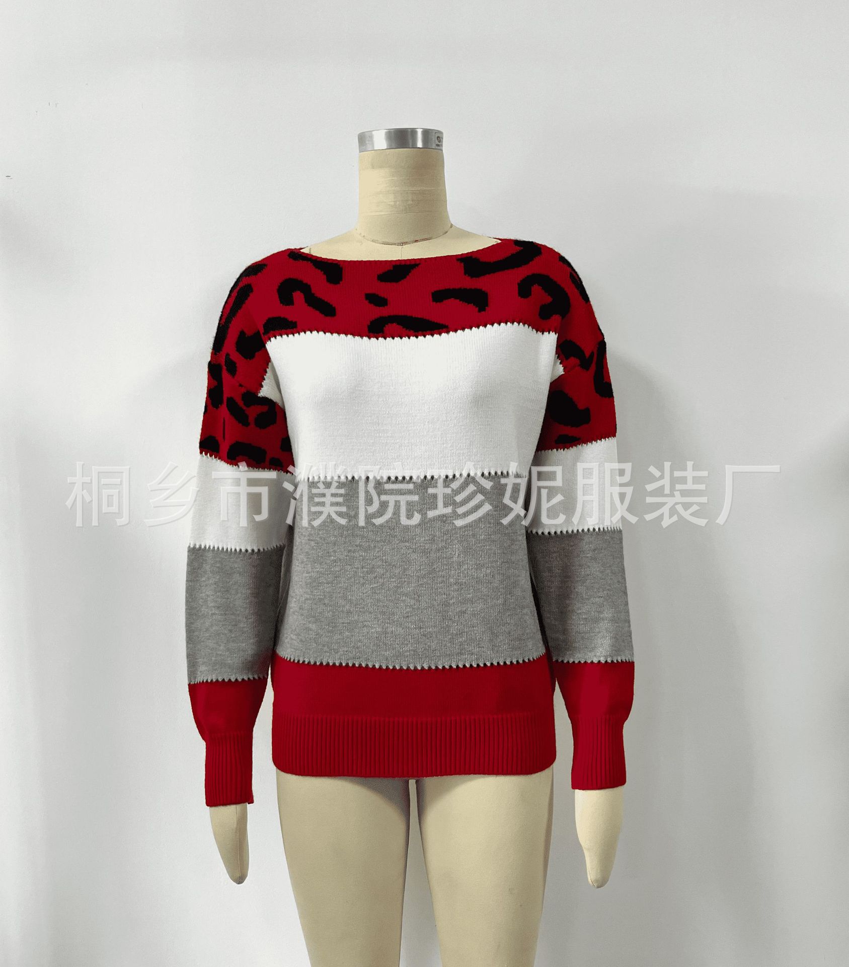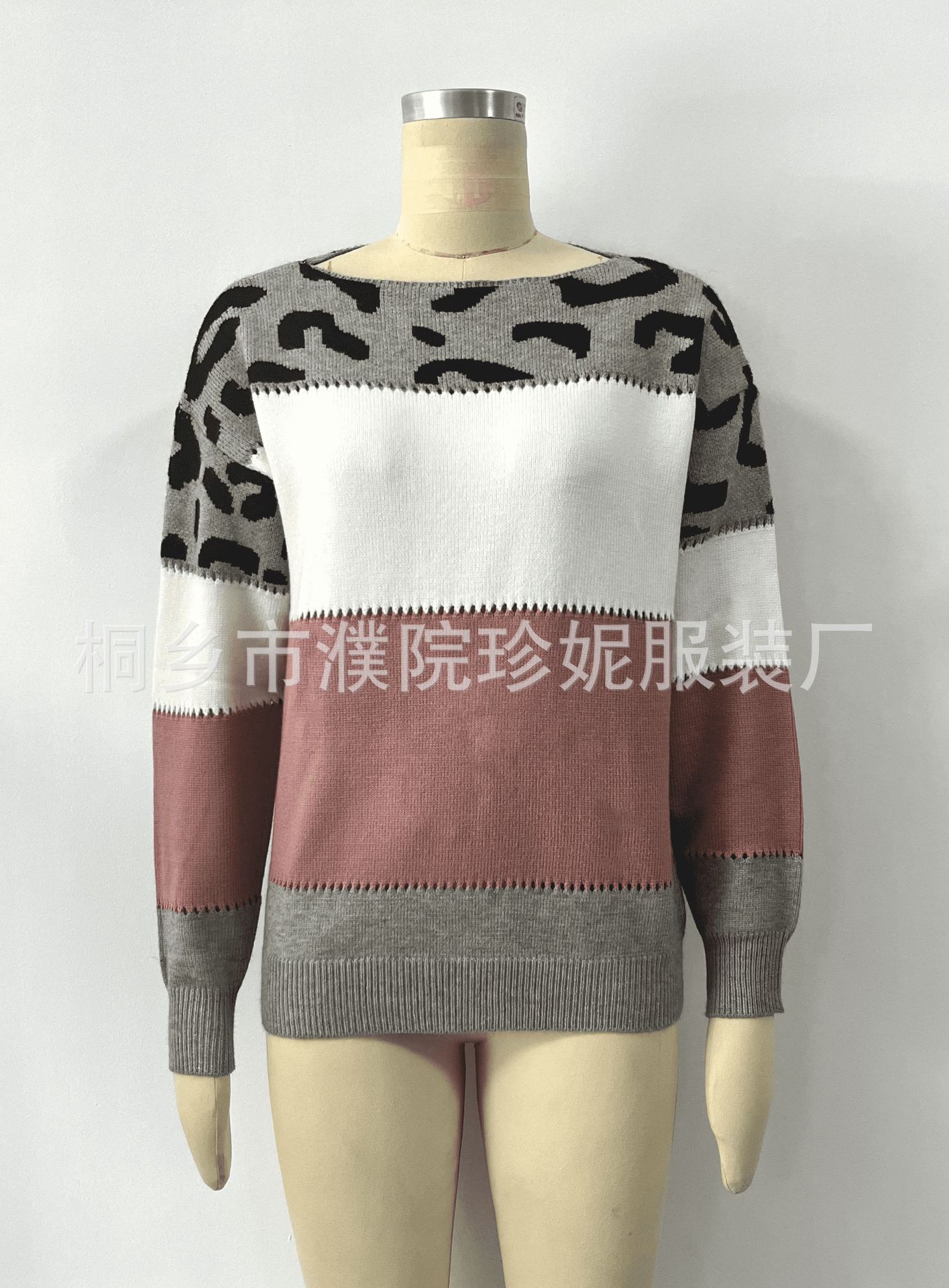 Suéter Casual de Punto de Bloque de Color con Estampado de Leopardo Otoño e Invierno Nuevo Punto para Mujer Transfronterizo Suéter para Mujer Camisa Básica de Manga Larga