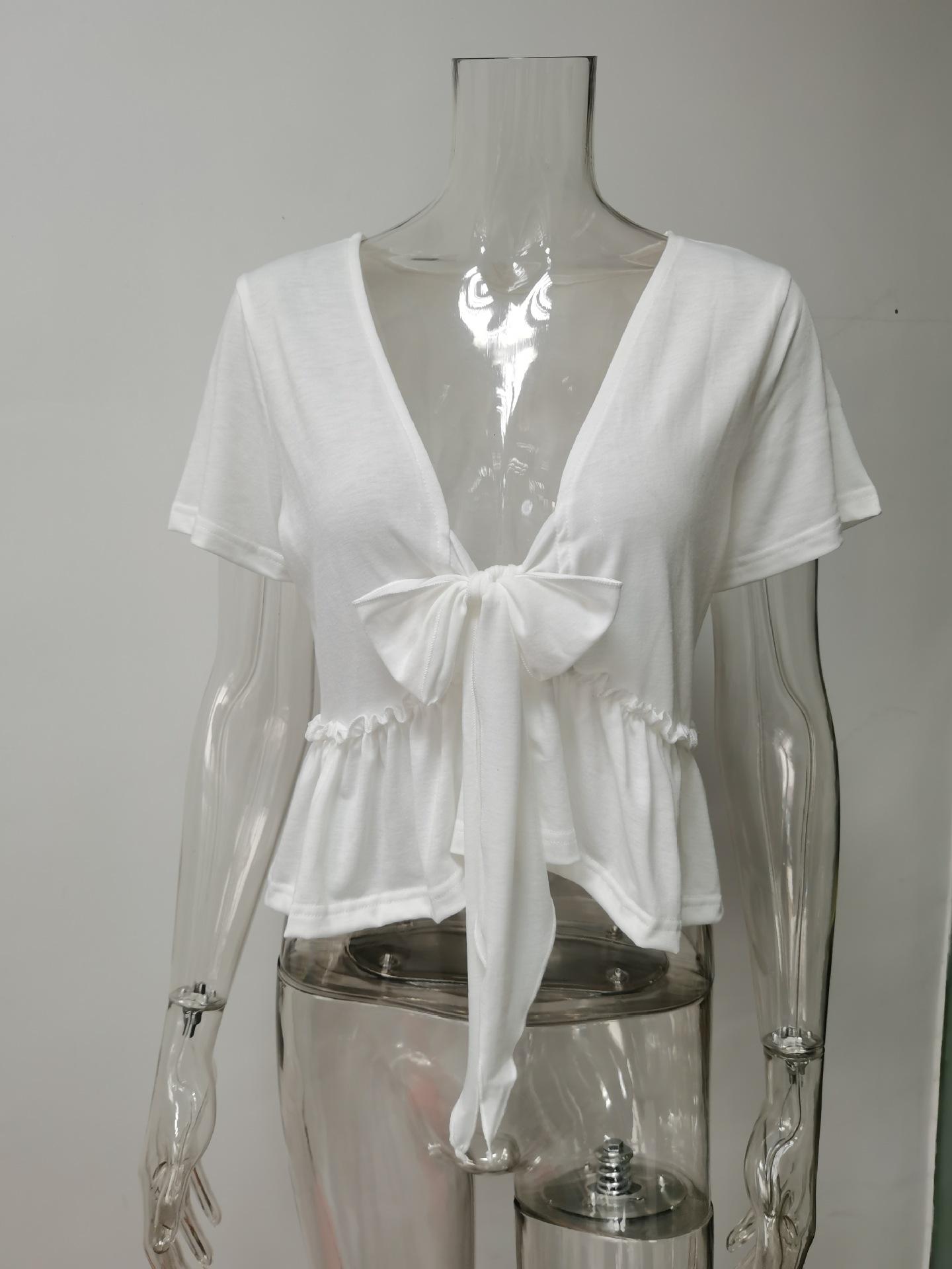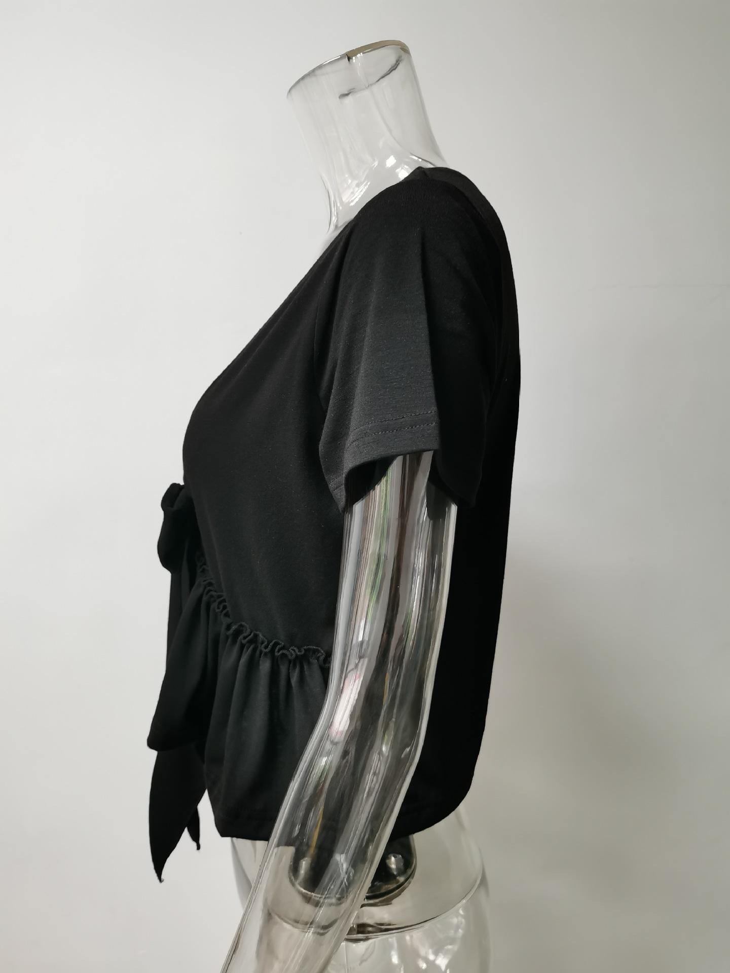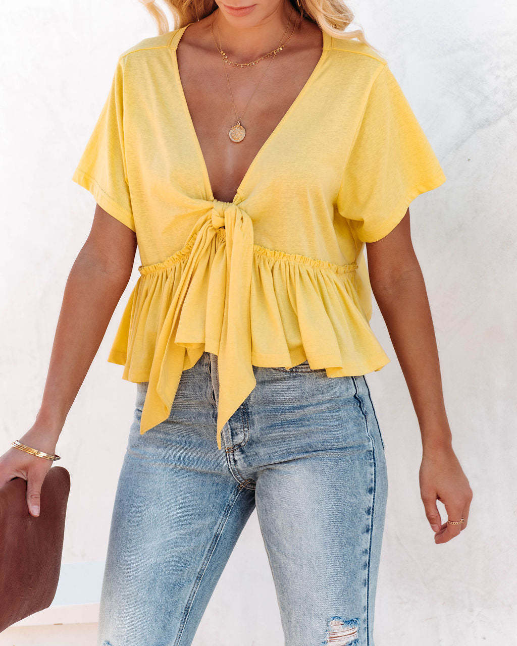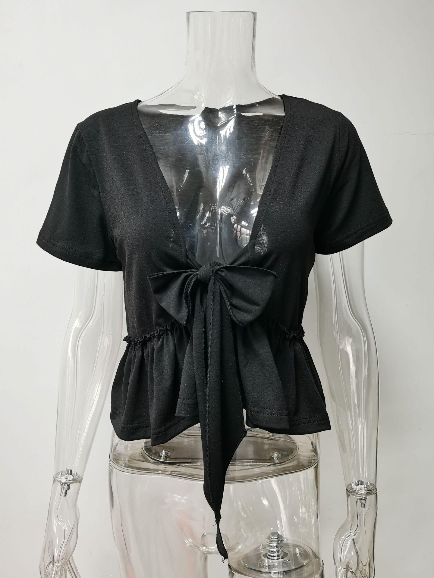 2025 Amazon Verano Nuevo Europeo y Americano Transfronterizo para Mujer Color Puro Empalmado Suelto Manga Corta Tirantes Volante Top