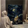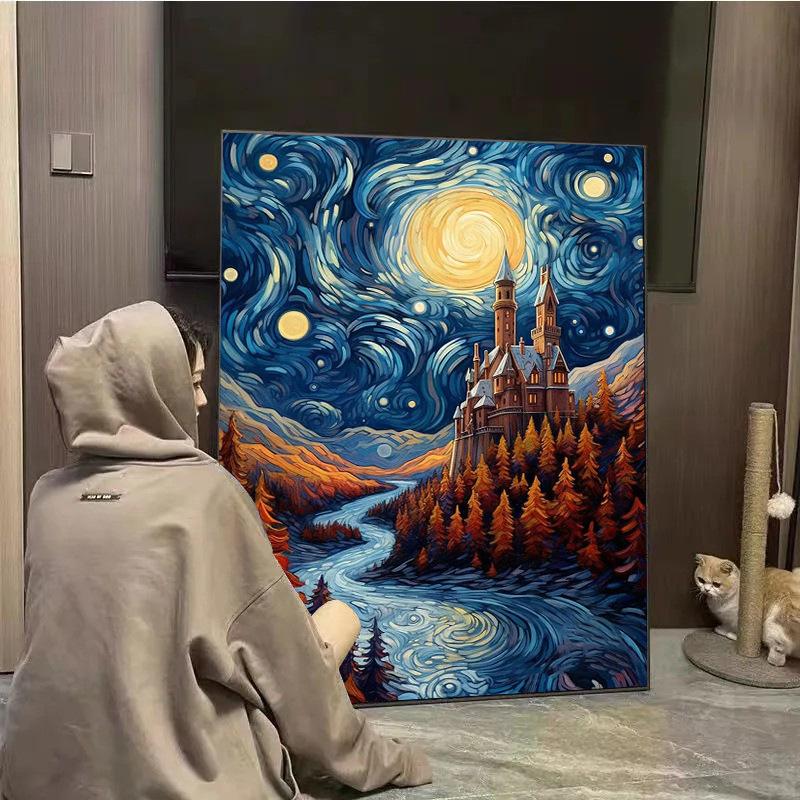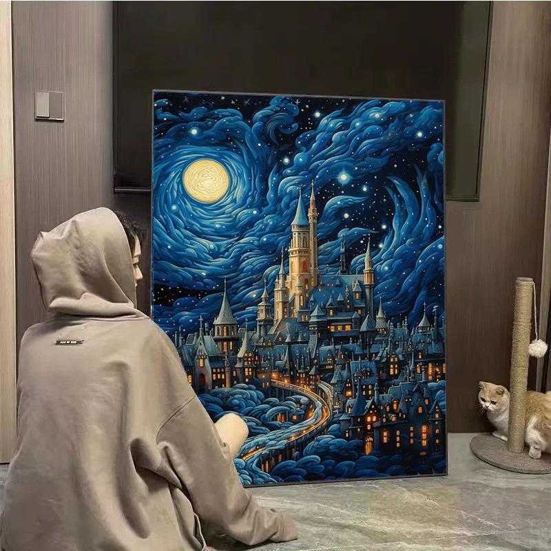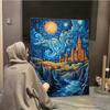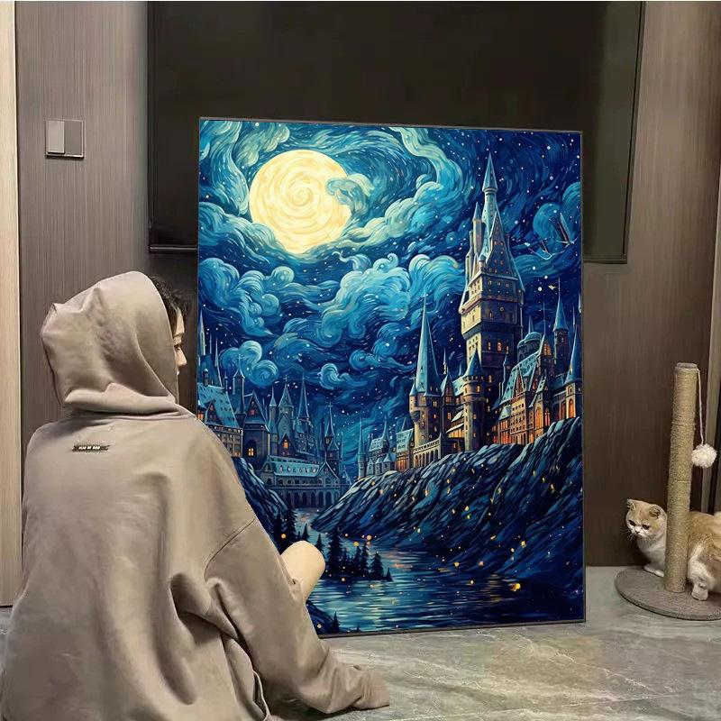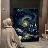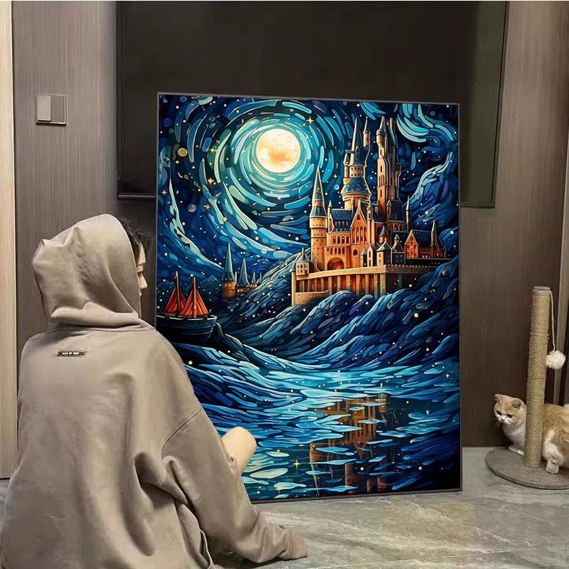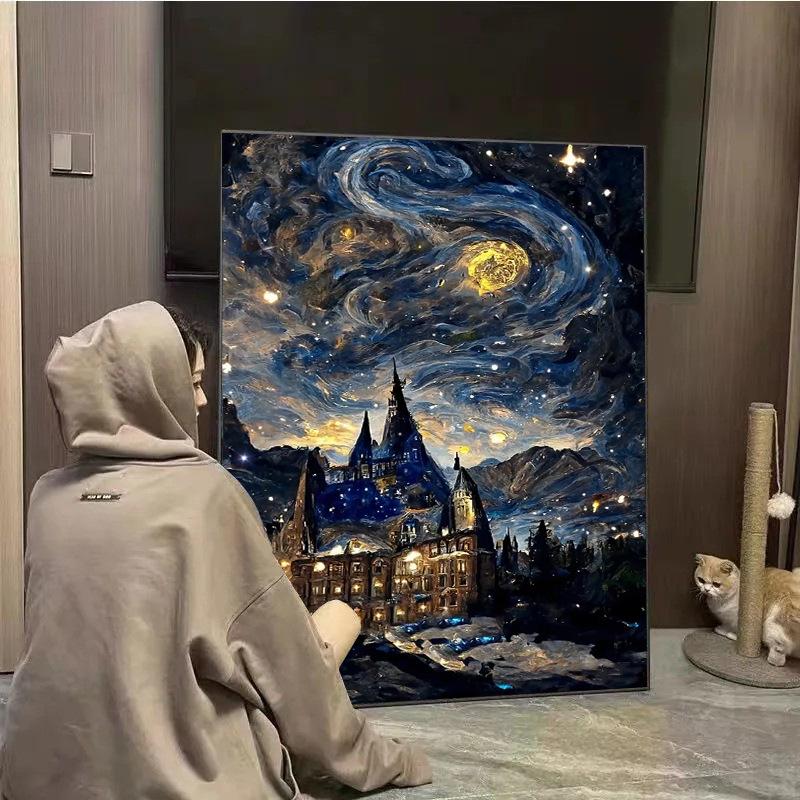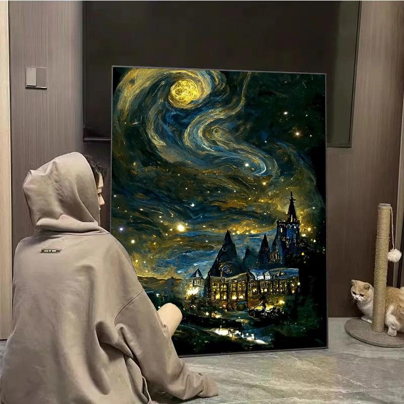 Nueva pintura de diamante DIY creativa hecha a mano del castillo de Hogworth de Van Gogh bajo el cielo estrellado con marco y pegatinas de diamantes de imitación.
