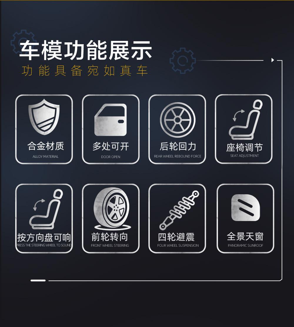 [Función del producto] Sonido y luz, retroceso, múltiples puertas, volante presionable, asientos ajustables, amortiguadores en las cuatro ruedas, dirección en las ruedas delanteras, techo solar abatible