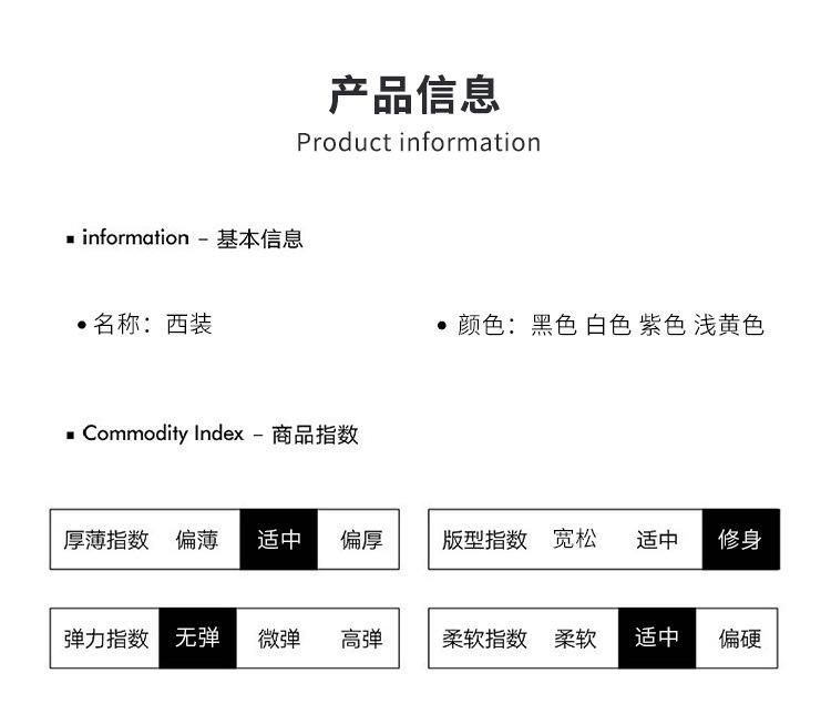 White suit, black suit, light yellow Suit, Purple Suit