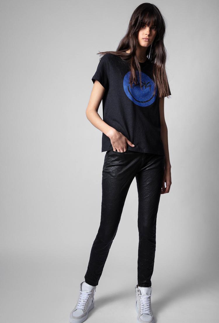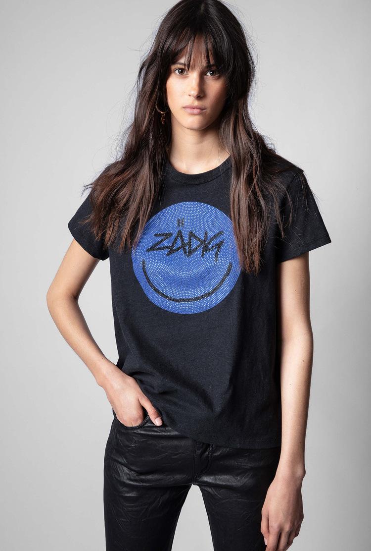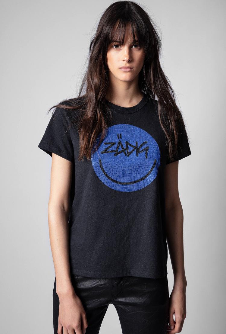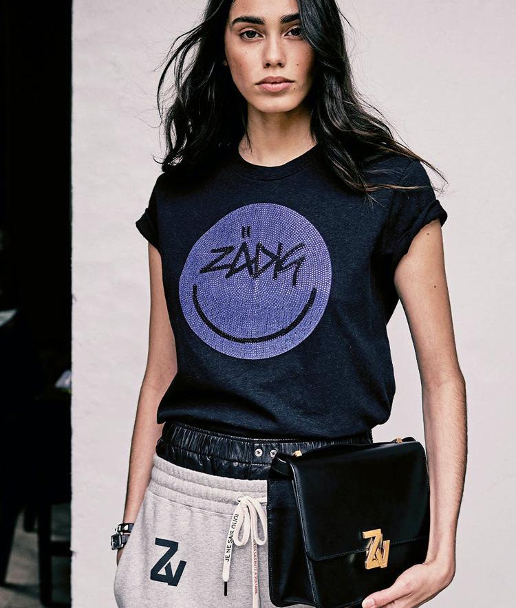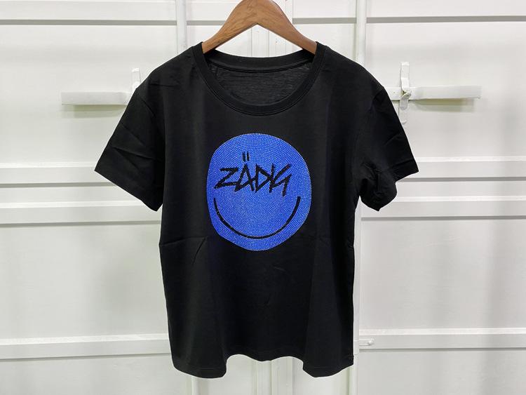 21 nueva camiseta de algodón de manga corta para mujer estilo francés con estampado de letras ZV y carita sonriente de diamantes de imitación negros