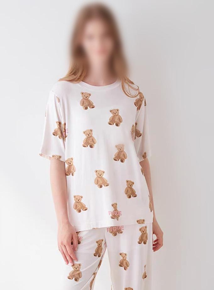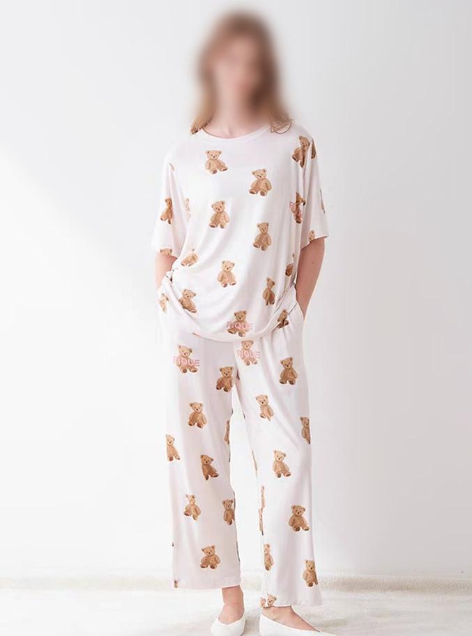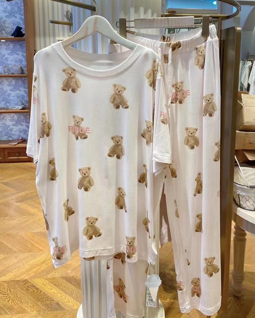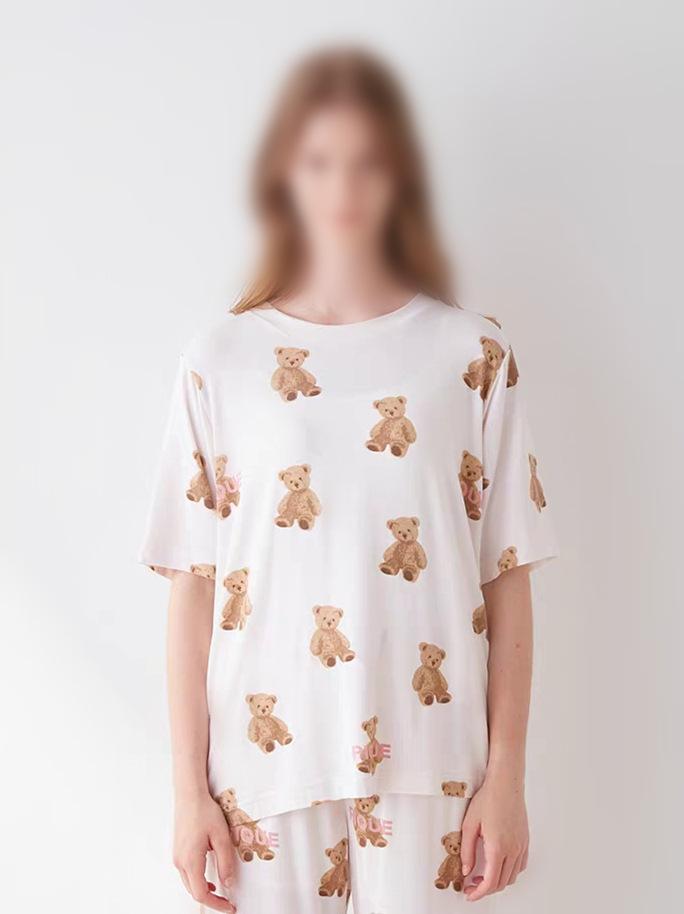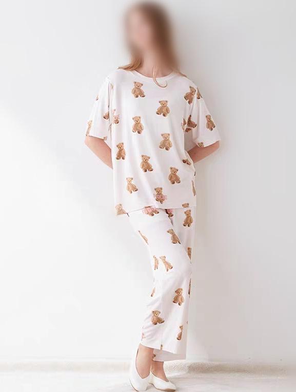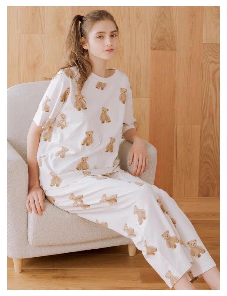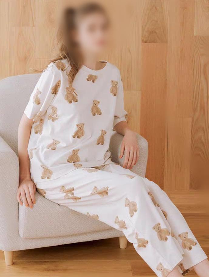 Gp Sin Marca Original Estilo Helado Suave Algodón para Mujer Lindo Estampado de Oso Ropa Exterior Manga Corta Conjunto de Pantalón Largo Ropa para Estar en Casa