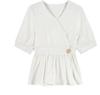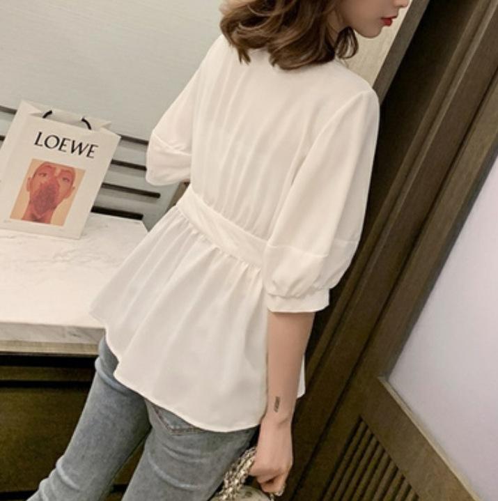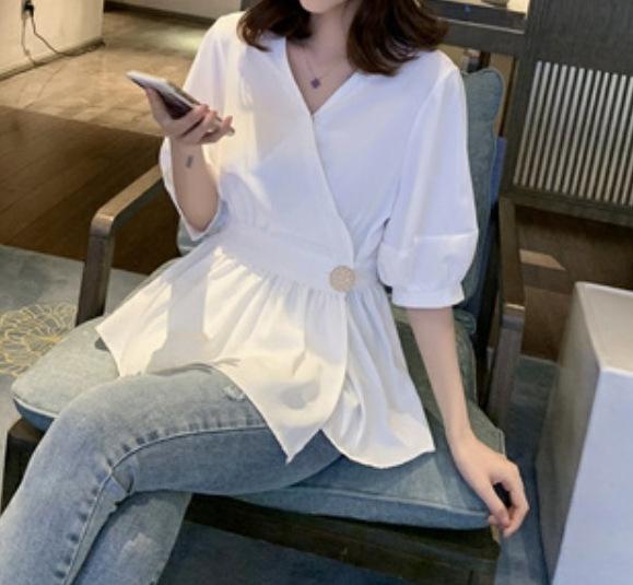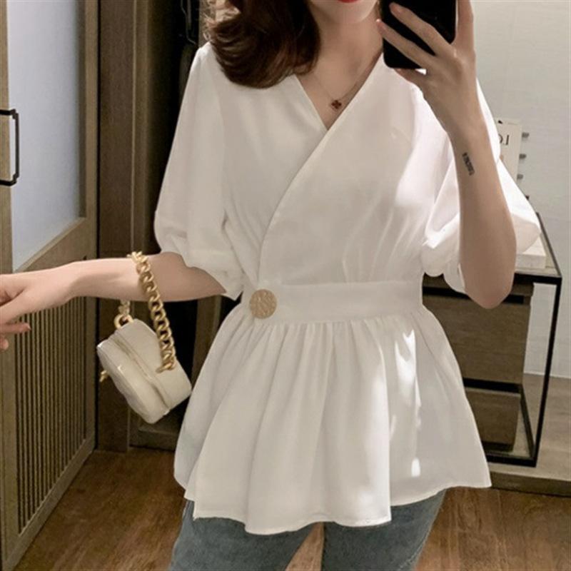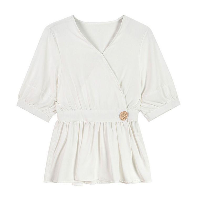Camisa blanca de gasa de manga corta con diseño de hada súper elegante de verano para mujer, camisa de estilo chic con escote en V y cintura nicho.