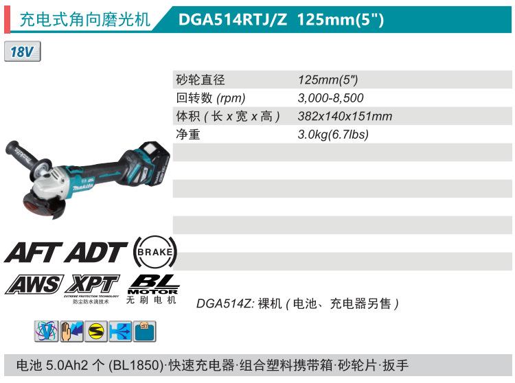 Amoladora angular recargable Makita DGA514Z sin escobillas batería de litio 125mm regulación de velocidad
