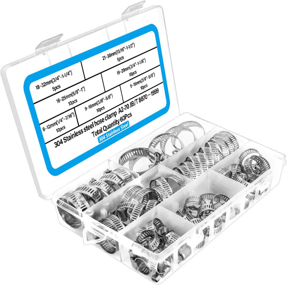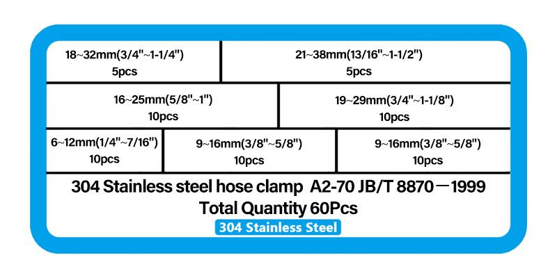 60 PIEZAS 6MM~8mm(1/4"~1-1/2") Comercio exterior transfronterizo acero inoxidable 304 juego de abrazaderas de manguera americanas grandes en caja. Un total de 7 especificaciones y 60 abrazaderas de manguera.